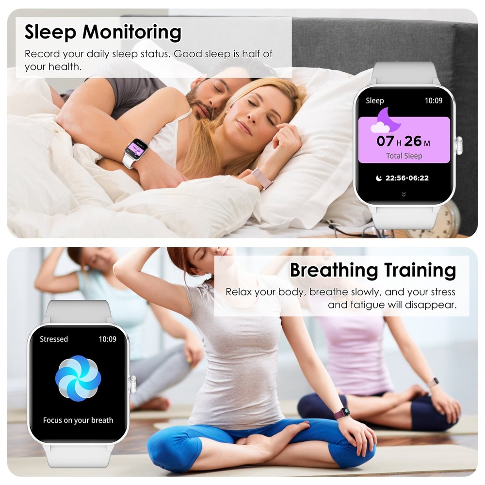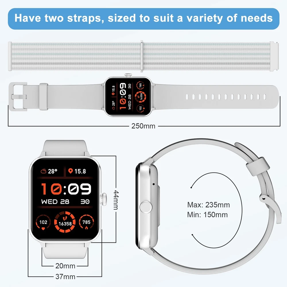 Smart Watch For Women/Men Waterproof Smartwatch Bluetooth iPhone Samsung Android 【Bluetooth Call and Voice Assistant】 Smart Watch Has a Built-in Microphone and Hd Speaker, Adopt Bluetooth Version 5.3 for Faster Connectivity. so You Can Make and Receive Calls Directly from This Smart Watch for Men. You Can Also Use the Built-in Voice Assistant to Ask Questions, Control Music Playback, Check the Weather, Set Alarms and Timers, Etc. When Your Phone Receives a Call or Message (Such As Whatsapp, Facebook, Instagram, Etc.), the Smartwatch Issues a Real-time Notification. 【1.85'' Hd Touch Screen and Diy Dial】 Smart Watches for Men Are Equipped with a 1.85-Inch Extra Hd Lcd and a Tft High-resolution Color Display. Superior Picture Quality and Touch Sensitivity Bring You Crystal-clear Visuals like Never Before. the Smart Watch Has More than 100 Unique Watch Faces to Choose from. You Can Also Customize Your Favorite Pictures As Watch Faces on the ‘’Da Fit‘’ App and Even Upload Your Photos, Such As Selfies or Pictures of Your Pets, to Create a Truly Personalized Look with Endless Possibilities. 【24/7 Health Monitor】 the Iowodo Smartwatch Has a Built-in Optical Tracking Sensor That Automatically Monitors Health Levels for Heart Rate in Real-time 24/7. It Can Also Accurately Track Your Sleep and Detect Blood Oxygen Saturation and Stress Levels. the "Da Fit" App Even Offers a Detailed Sleep Quality Analysis Report (Light/Deep/Awake Sleep Stage), and You Can View Further Health Data to Help You Analyze Your Health Status and Make Appropriate Adjustments in Good Time Towards a Healthier Lifestyle. (*Note: This Watch Cannot Be Used As a Medical Diagnostic Tool.) 【Battery Life】 the Smart Watch Has a Built-in 350 Mah Rechargeable Battery That Can Be Fully Charged in Just 2.5 Hours and Minimizes Power Consumption. Under Normal Use, the Battery Life Is up to 5-7 Days(Depending on Actual Use). in Standby Mode, It Can Be Used Continuously for up to 25 Days. with Our Smart Watches for Men, You Can Say Goodbye to Battery Anxiety. 【100+ Sports Modes】 the Fitness Watch with More than 100 Sports Modes, This Fitness Tracker Supports Treadmill, Walking, Outdoor Training, Running, Cycling, Climbing, Yoga, Skiing, Football, and More. It Precisely Tracks Your Daily Data Such As Steps, Time, Distance, and Calories, and Connects to the Gps on Your Phone to Record All Your Training Routes and Fitness Using the "Da Fit" App to Further Motivate Yourself to Complete Your Exercise Plan. It's an Ip68 Waterproof Device That Can Meet Your Daily Needs. (*Note: Not for Sauna, Hot Water, Swimming, Diving) 【Broad Compatibility】 Works Seamlessly with Ios or Android Smartphones. Compatible with Ios 9.0 or Above, Android 6.0 or Above (Not Suitable for Pcs or Tablets). Our Smart Watch Has an"Fsc-certified Case and Bracelet". 【More Efficient Life and 2 Straps】 the Fitness Watch Has Many Built-in Functions, Including Smart Notifications, Music Control, Camera Control, Weather Forecast, Sedentary Reminders, Alarm Clock, Stopwatch, Timer, Etc. Lift Your Wrist and Read All the Incoming Calls, Text Messages, and Messages Sent to the Smartwatch Screen Directly. in Addition, Equipped with 2 Comfortable and Skin-friendly Wristbands (Silicone Strap and Nylon Strap), the Length Can Be Adjusted Freely. Users with Sensitive Skin Can Use the Nylon Strap, Which Directly Helps You Solve Skin Sensitivity Problems, and Smart Watches for Men to Help You Exercise Scientifically. 【24-Hour After-sales Service】 We Provide a Long After-sales Cycle and Complete Customer Service. If You Have Any Problems When Using the Smart Watch, Please Contact Us Immediately. We Will Reply to You Within 24 Hours and Help You Solve the Problem As Soon As Possible! 🎁 Fantastic Gift for Your Family and Friends💝 Packing List: 1 x Smart watch 1 x Replacement strap 1 x Charging cable 1 x User Manual Operation guidance: Strap Material Silicone Size As shown in the figure MPN NOT SPECIFIED Case Color Gray Manufacturer Warranty 1 Year Network Bluetooth Features Blood Oxygen Sensor, Bluetooth Enabled, Caller ID, Fitness Tracker, Heart Rate Monitor, Sleep Monitor, Touchscreen, Waterproof, Water-Resistant Case Size 22MM Operating System Android Wear Storage Capacity 1 GB Case Material Aluminum APP Name Da fit Compatible With Android 6.0 & iOS9.0 above Screen Size 1.85 Inches Material Silicone Brand Blackview Series Military Smart Watch Type Smart Watch Battery Capacity 350mAh Band Color Gray Band Material Silicone Compatible Phone Models For IOS, Android Design/Finish HD Touch Screen Model Military Smart Watches Country/Region of Manufacture United States Compatible Operating System iOS - Apple, Android Connectivity Technology Bluetooth 5.0