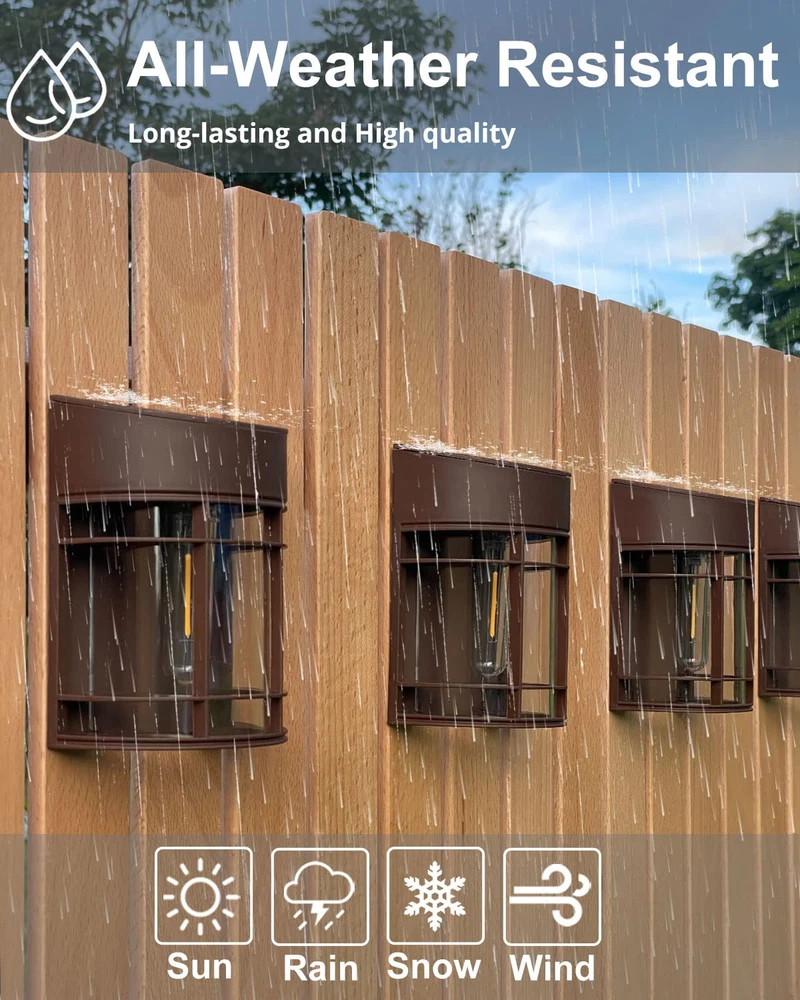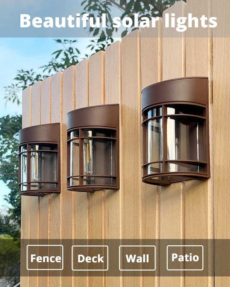 Vintage Brown Fence lights - Give off beautiful Warm, and soft lighting, makes your garden look nicer, cozier, and more inviting. Energy-saving, No Heat and long lifespan means no bulbs to replace. (3000K warm white light). Design with U.S. Patent Certification Auto ON/Off & Dusk to Dawn - Solar fence lights automatically turn on at dusk and off at dawn, provide brighter and all night lillumination for fence deck yard. No electric bill, Saving money and no need to manually turn it on/off everyday.(Turn ON the switch for the first time) High Efficiency Energy Saving - New Solar Panel perform better with higher conversion efficiency that up to 50% than others. Durable enough to extend the lifespan. Recharge battery charged 8-10hour in daytime to store electricity, maximize and long-lasting the power for fence lights at night. Easy Installation- NO wires. simply using the included screws to fix on any wall, fence deck or pole. Measures: 5.1x3.6x2.4 Inch. The perfect addition to your yard fence Wall Patio Stairs. When darkness was descending, backyard lights giving the garden many eye-pleasing luminous decoration. Distance between two holes: 2.8 inches All-Weather Resistant - Made of durable ABS material, stable and durable for maximum performance. IP44 waterproof solar outdoor lights work well on all kinds of weather, such as snow, rain or extreme weather.