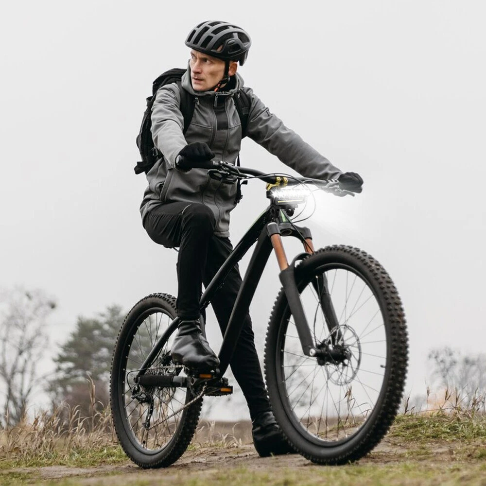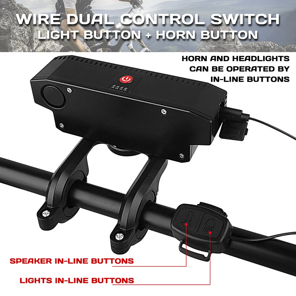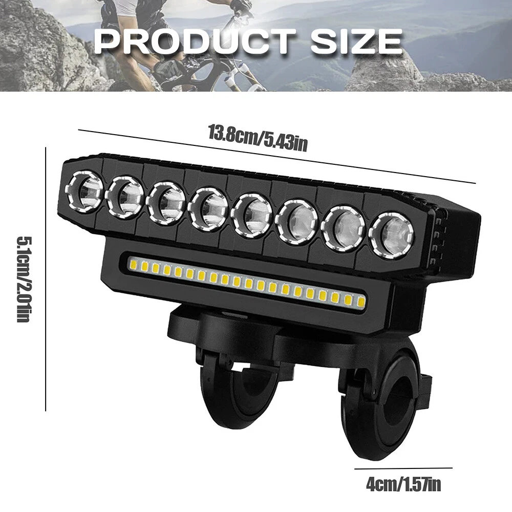 【 Super Bright 】Bike lights is very bright with the maximum output is 9500 lumens, the 8 led and 20 smd lights cover a wide range up to 800m,bike headlight allows you to ride at night to see wider and further areas, also makes your night riding safer. 【 Charging Input and Output 】In addition to the normal usb input rechargeable function,this bike headlight also has a USB output function.Bike light has a power bank function that can charge your phone.This is a very important when you are riding outdoors. 【 Multiple M odes 】6 lighting modes, which can adapt to different scenes. Besides being used as a bicycle light, you can also use it for camping, fishing, night work and activities,bike lights for night riding has a high decibel speaker, and equipped with a wired button switch, making your operation more convenient and safe 【 Waterproof and Durable 】Bike headlight made from high-quality materials, the bike lights are designed to withstand bike、bicycle、 riding、mountain cycling accessories,bike headlight with IP44 waterproof ratings, bicycle lights front and rear can handle rain, snow, and other outdoor elements. Specification: Beads: 8LED+20SMD Material: ABS Modes: 6 modes (8LED+20SMD full bright-8LED strong light-8LED weak light-8LED breathing light-20SMD strong light-8LED+20SMD burst flash) Charging mode: USB charging Battery capacity: 4000 mAh Waterproof: IP44 Speaker: 130db Product size: 138*40*51mm Package Included: 1 x Bicycle light 1 x Horn