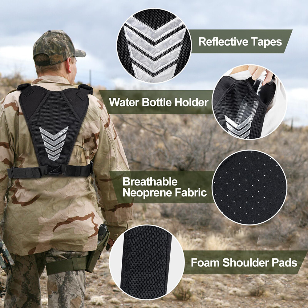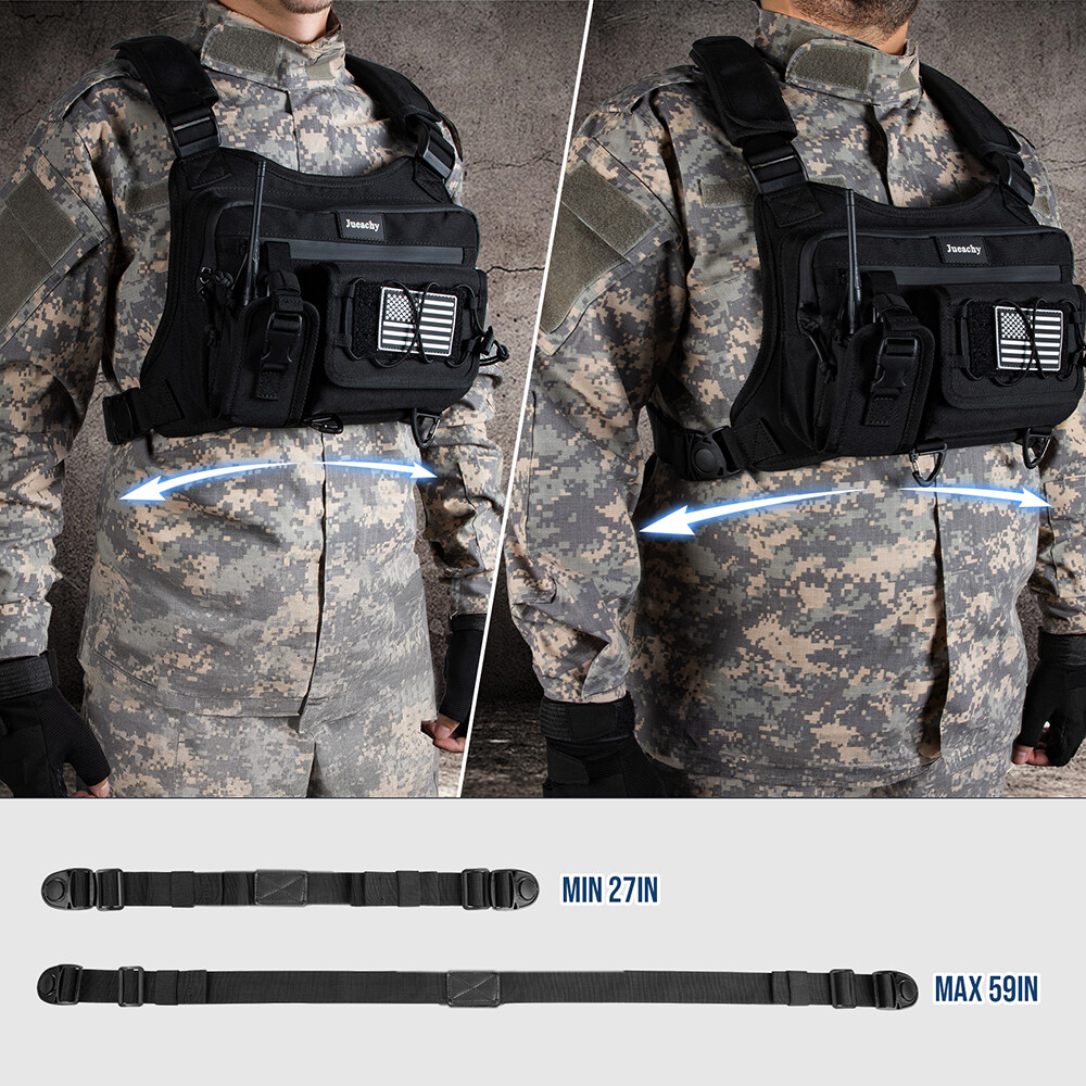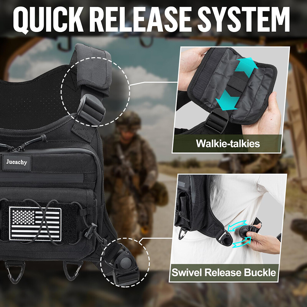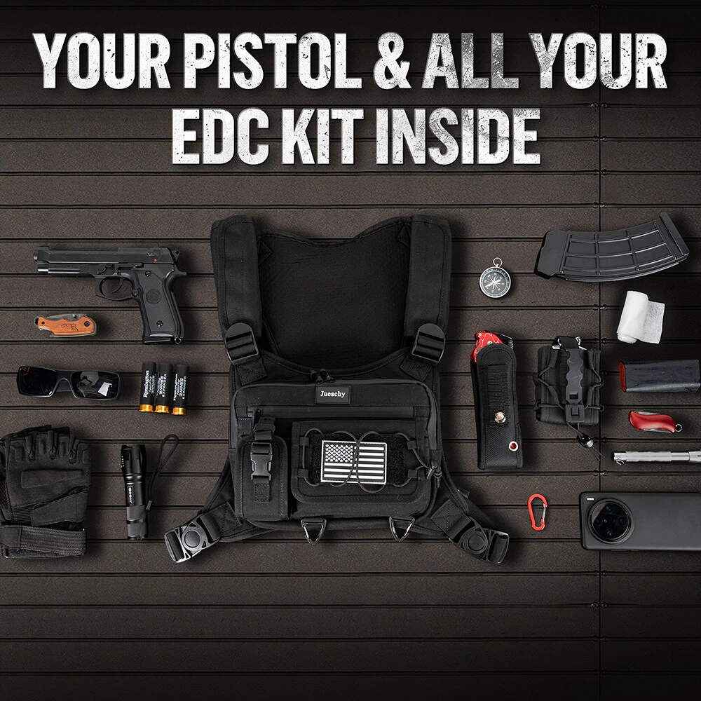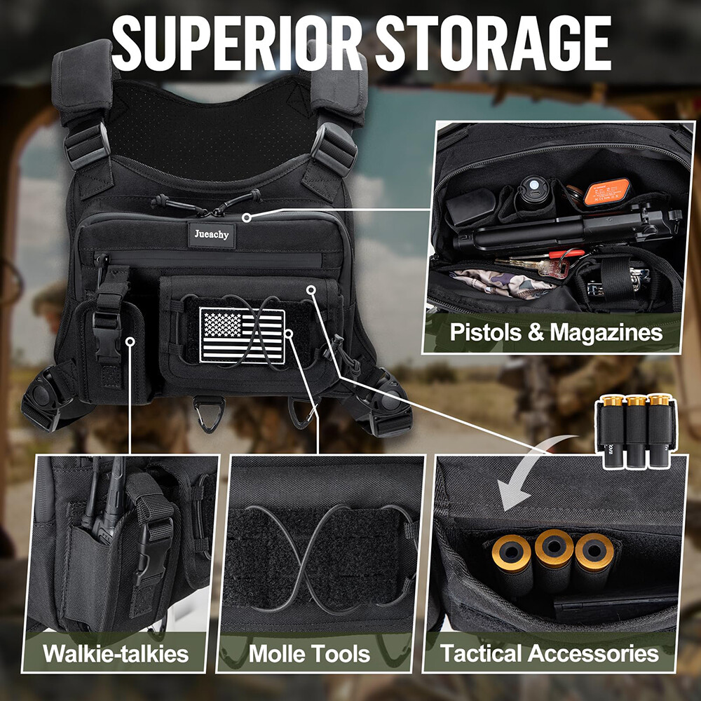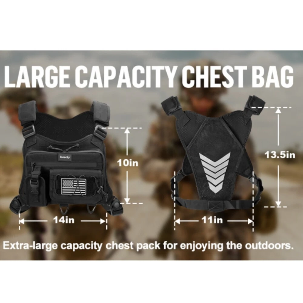 💯 【Comfortable & Breathable】 The tactical chest bag for Men features breathable mesh padding and high quality oxford fabric,ensuring maximum airflow against your back while providing comfort. With four adjustable straps,this chest vest fits snugly and can be tailored to your body for an almost weightless experience,no matter how much gear you carry. 💯 【Spacious Large Capacity】 This tactical chest bag offers ample storage space.In addition, the interior of the accessories organizer pack is equipped with molle strips and grid bagto securely store tools and equipment,ensuring quick access and organized storage of essential tools and accessories.door 💯 【Water Bottle Pocket】 This tactical chest pack is designed with a water bottle pocket on the back,so you can carry a water bottle outdoors and free your hands anytime,anywhere.This tactical chest rig also made back reflective design,suitable for night running wear at night,can greatly possible to protect the safety of night runners. 💯 【Wear-resistant material】 Constructed from high-quality oxford fabric,this chest pack is both cut-resistant and water-resistant,making it ideal for rugged outdoor use. Durable zippers enhance reliability and provide smooth access to your tools and gear in any situation.This chest pack for man is designed for durability and reliability in demanding environments,making it a perfect utility pack for outdoor adventures or everyday carry. 💯 【Multi-Pockets】 The EDC pouch features a spacious main compartment and two additional front pockets,ensuring efficient organization for all your essentials. Elastic straps inside the chest bags secure a variety of tools, allowing for quick access to necessary items during any mission or adventure.Ideal for any gifting occasion such as birthdays,New Year,and Thanksgiving,the chest packs makes a thoughtful present for outdoor enthusiasts and tactical gear lovers alike. Package: 1*Chest Bag