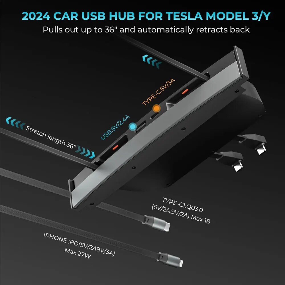 USB Hub for Tesla Fast Charger Model Y/3 Waterproof Multi Port Retractable Docking Station Model Y 2021-2024 Model 3 2021-2023 【Perfect Fit for Tesla】Custom designed for the central control interface of Tesla model 3 model Y 2021-2023. Perfect design, which does not affect the use of sliding covers.The tesla accessories are fully integrated with the center console. 【4 devices charging at the same time】Tesla model y model 3 accessories 2024 quick charger has two charging cables and 2 charging ports, it can be used for Type C USB, in-car wireless charging is up to four times faster, if the retractable charging cable can't be charged, please check whether the two power ports are plugged in tightly. 【5 Seconds Simple Installation】The Tesla usb hub is very easy to install, no need to disassemble or damage the centre console, just a simple operation can be completed, and it can be perfectly installed on the centre USB console of Tesla y or 3 models. 【4-Port Fast Charging】Powers up fast: 27W PD, 27W Type-C, 2.4A USB, and 3A Type-C. Rapidly fuels phones, tablets, earbuds, game controllers, and more. 【Retractable Charging Cables】This car usb hub for tesla central console is unique sliding cover dustproof designed, has 2 retractable charging cables, which can be stretched to 32 inches and automatically retracte.