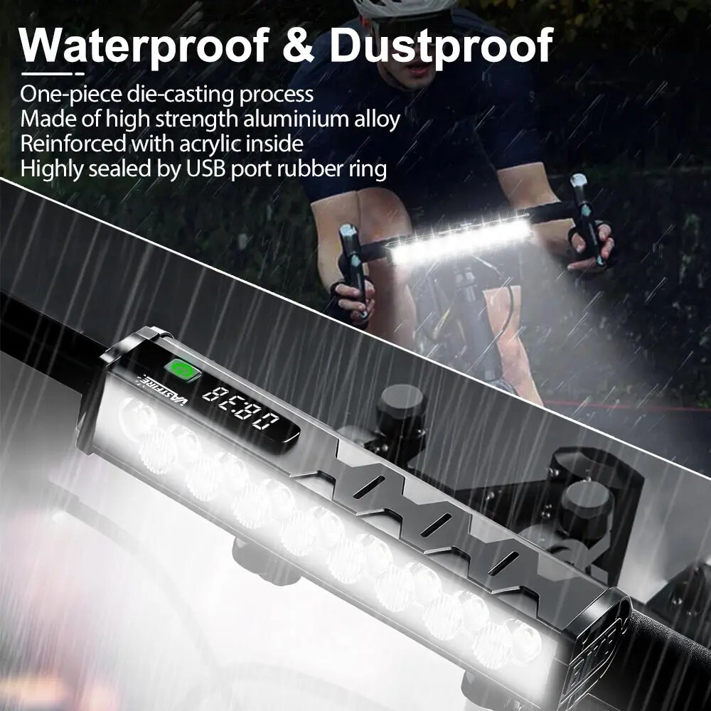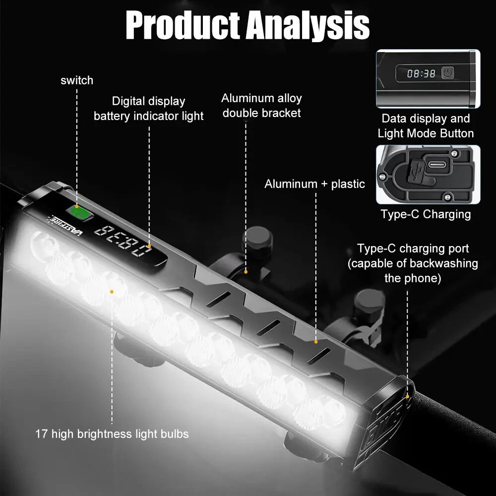 Specification: Material: aluminum + plastic Light color: white Product color: black Light Beads: 17*leds Mode: Flood 8 lights on - Spot 9 lights on - 17 lights on - 17 lights flashing Lumen: 25500LM Charging mode: Type-C charging Battery capacity: 10000 mAh Charging time: 5-7H Use time: 4.5-9H Voltage: 3.7V Waterproof: IP65 Net weight: 330g Size: 17*4.7*3cm Package A: 1*Bicycle headlight 1*Type-C charging cable 1*USB conversion head 1*Bracket