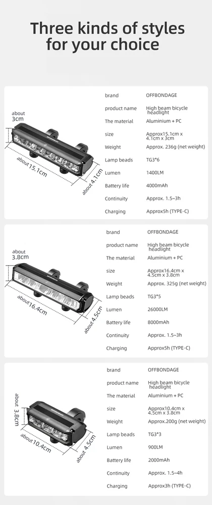 PRDUCT DETAIL Model: HYY900-2000mAh Material: Aluminum Plastic Shell Mode:5 Modes Click to open: near light - far light - far and near full light - flicker-Daylight mode Long press to open: daytime running light Waterproof: IPX-5 Lumen: Max 900 Lumen Range: About 200M Battery: About 2000 mAh Charging Time: About 3 hrs Working time: 2-3.5h Power bank: NO Model: HYY1400-4000mAh Material: Aluminum Plastic Shell Mode:5 Modes Click to open: Near light - High beam bright - Far and Near full light - Flashing -Daylight mode Waterproof: IPX-5 Lumen: Max 1400 Lumen Range: About 150-300M Battery: About 4000 mAh Charging Time: About 4.5 hrs Working time: 2.5-4.5h Power bank: NO Model: HYY2600-8000mAh Material: Aluminum Plastic Shell Mode:4 Modes,Near light - High beam bright - Far and Near full light - Flashing Waterproof: IPX-5 Lumen: Max 2600Lumen Range: About 200-500M Battery: About 8000 mAh Charging Time: About 9 hrs Working time: 2.5-7.5h Power bank: YES Product Features: 1. High beam/low beam. Anti-glare 2. Aluminum alloy , good heat dissipation 3. Durable/Anti-Fall, Long Range 4. Built-in battery.USB Rechargeable High lighting bicycle headlights 1400lumens,4000 mAh,five kinds of light patterns Product detail Material: ABS+PC Lamp beads: COB lamp beads Mode: 6 modes Endurance time: 10-100h Weight: about 22g Water resistance: IPX6 Battery: 3.7V/260mAh polymer Warranty: 1 year Product feature Riding safety brake intelligent induction Freely switch four modes ABS+PC shell PC lens + COB lamp beads IPX6 waterproof Type-c rechargeable 260mAh battery Weighs only 22g Smart Brake Tail Light #Four modes|Intelligent induction|Type-c charging#