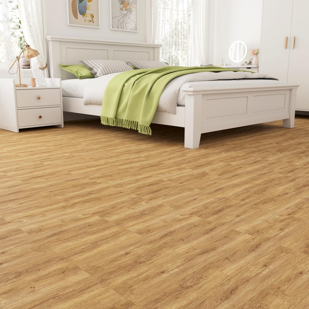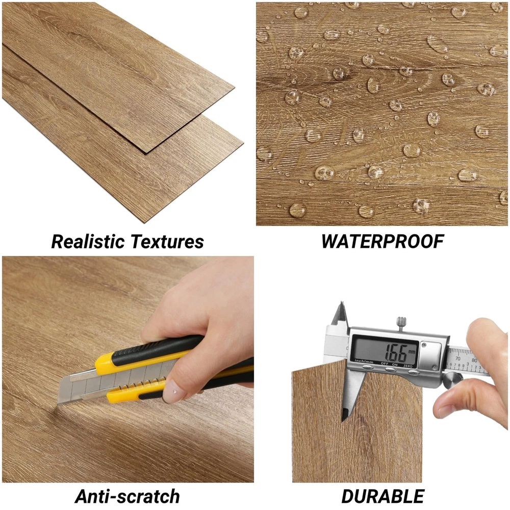 PEEL AND STICK FLOOR TILE WOOD FLOORING TILE FLOOR 👍 Would You Want To Quickly Transform or Decorate Your Home? 👍 ▸ Peel and stick floor tile is extra thick and durable. ▸ Wood flooring peel and stick is matte and slightly textured. Wood grain design is suitable for bathroom, kitchen, basement, bedroom, laundry, living room, etc. 📝 SPECIFICATION 📝 Finish: Matte Feature: Peel and Stick, Self-adhesive, Waterproof, Oil-proof, Removable, Sticky, Thick, Durable, Repositioned, Easy to Clean, Easy to Use, Bubble-free. Application: Suitable for decorating and transforming kitchen, bathroom, floor, countertop, coffee table, vanity, cabinet, built-ins, walls, dresser, drawer, wrapping paper, DIY project, and more. ✂️ INSTALL STEPS ✂️ 1. Firstly, clean the surface to make sure it is smooth flat and dry. Measure the area, leave an extra length before cutting the flooring tile. 2. Secondly, Peel off the backing little by little while using a soft cloth to smooth the tiles as you go. 3. Finally, use a hairdryer to ""stretch"" the edges and seal them under the countertop overhang. 😀 WARM TIPS 😀 ▸To avoid color difference please buy enough boxes at a time to ensure they come from the same batch. ▸Product pictures may have slight differences in color from the actual product as monitors vary. ▸Please ensure that the covered surface is smooth and clean. Textured surface will affect the adhesion of the peel and stick floor tile. ▸Please contact us through Amazon if you are unsatisfied with the vinyl flooring peel and stick for any reason, and we will solve it in the first time. 🦖 -【Size】:The size of each peel and stick floor tile is 6"x36". 36 tiles covers 52 sq.ft. 1 piece of wood vinyl flooring covers 1.45 sq.ft, Strong coverage and a variety of styles to choose from. 🦖 -【Features】:Peel and stick flooring is made of PVC with slightly texture. It is waterproof, oil-proof, removable. Easy wipe to remove stains and protect the floor from splashes and oil. 🦖 -【Easy to Use】:Laminate flooring are nice for new users and super easy to operate! Just peel the back film and stick it to the surface you want. no grout, no glue, and removable. Easy to cut with sharp utility knife or scissors. 🦖 -【Application】:Peel and stick floor tile waterproof can be arranged in a stack bond, subway, or herringbone and more pattern. Bathroom floor tile is great for bathroom, kitchen, basement, bedroom, laundry room, living room, garage, RV, fireplace, camper, and more. 🦖 -【Customer Service】:We are fully committed to 100% customers satisfaction, so if there is any problem with this peel and stick floor tile, please feel free to contact us and we will reply as soon as possible.