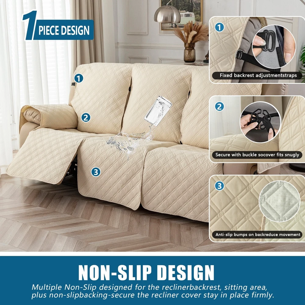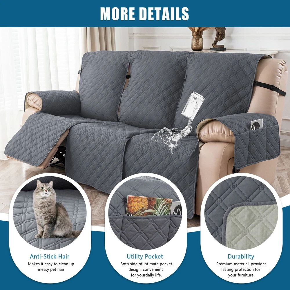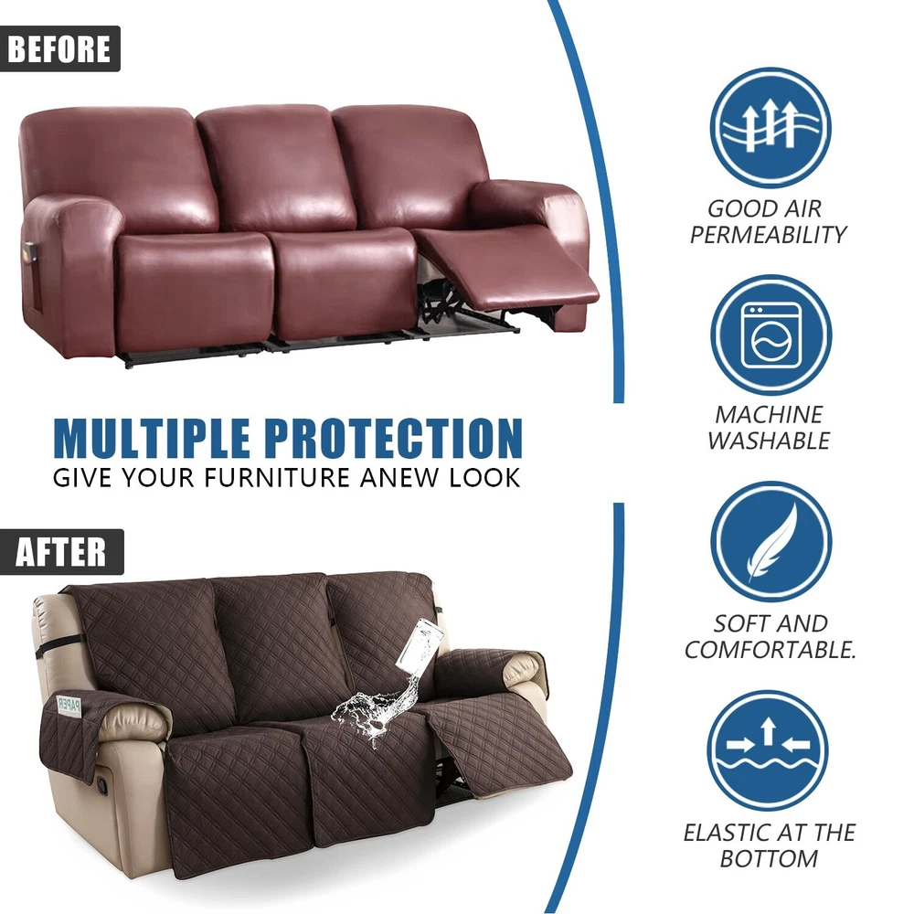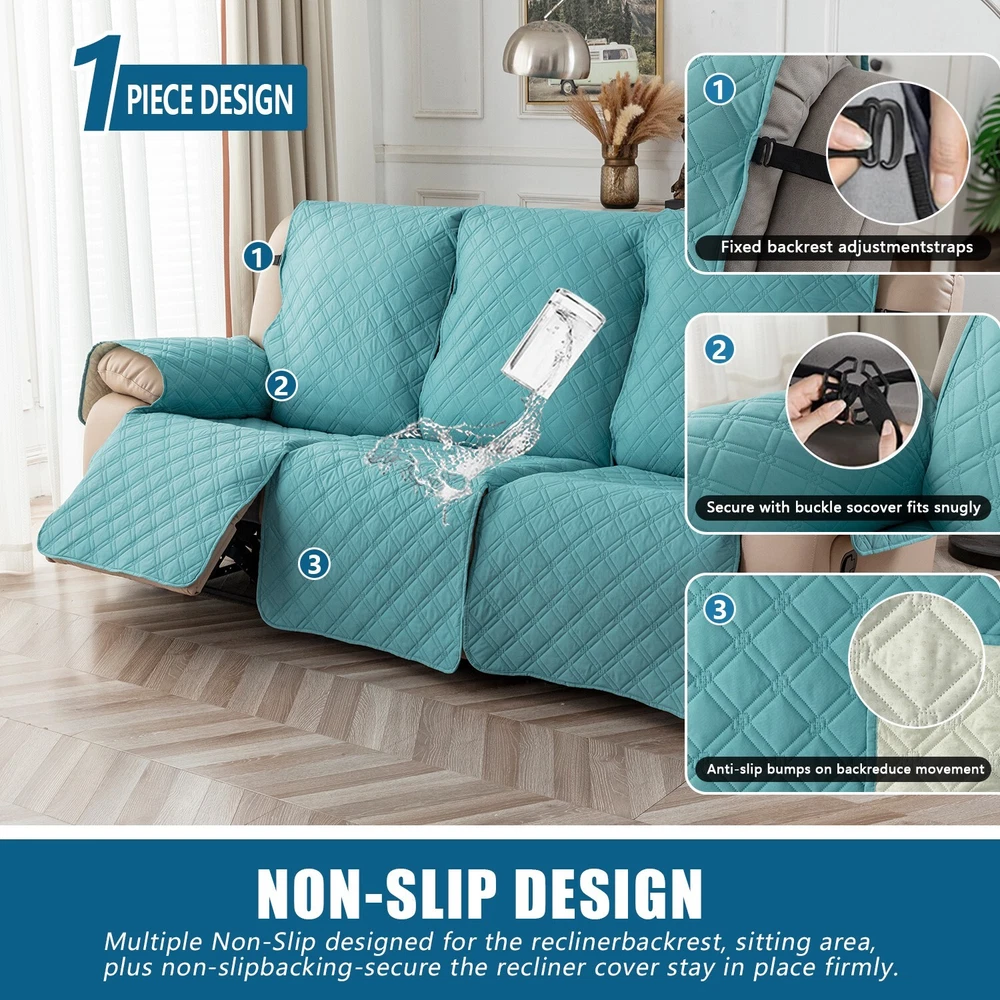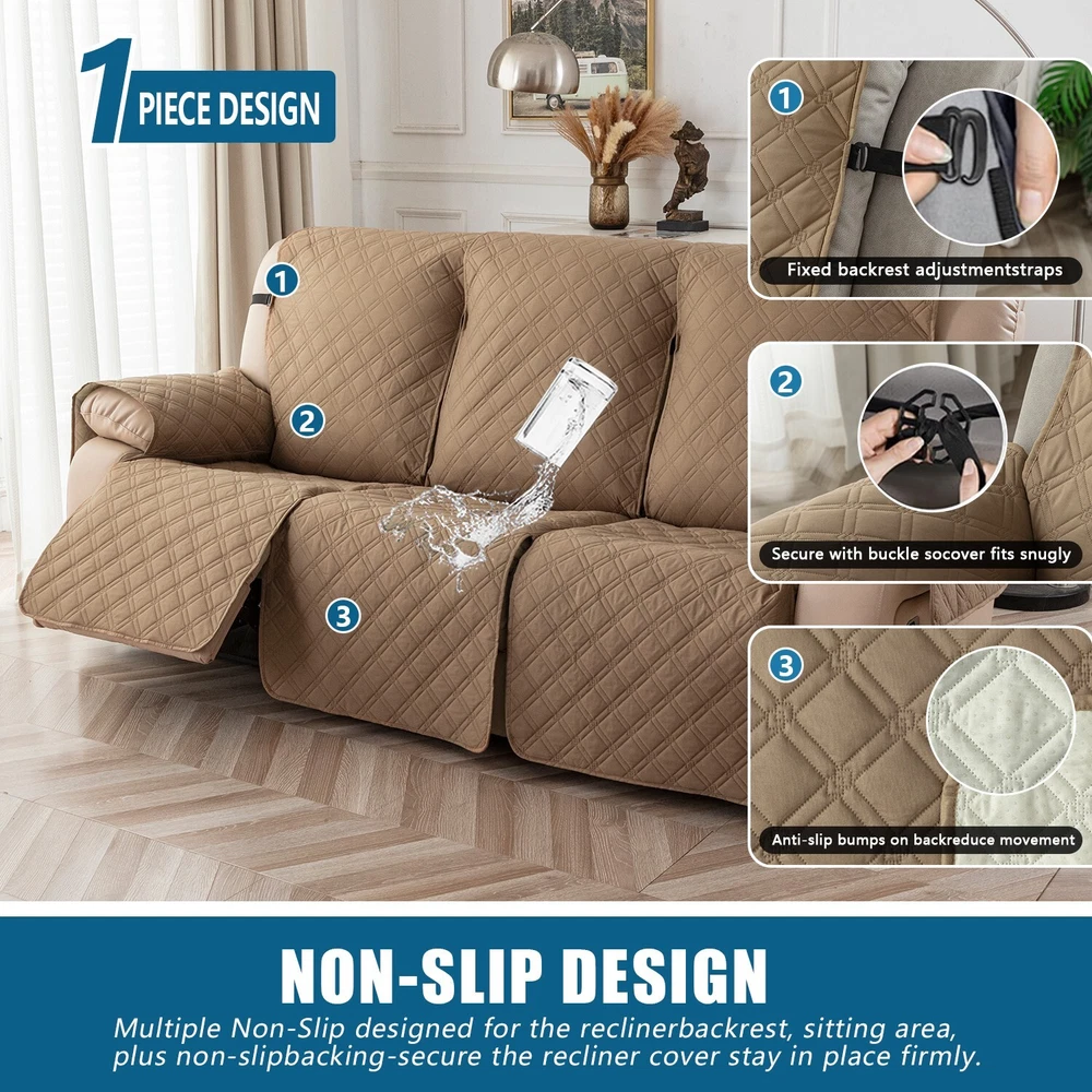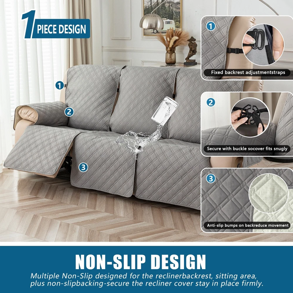 Anti-Slip Waterproof Non-Slip Design: The round silicone rubber backing of the recliner couch cover is designed to make the reclining couch covers more firmly stay in your sitting area. Elastic straps and non-slip buckles are included in each sofa recliner cover to stabilize the seat and prevent the back of the recliner from slipping off. Water-Resistant & Durable: The couch cover for reclining couch 3 seat consists of 3-layered quilted fabric, thick microfiber, and thick poly foam filling for extra comfort and softness. 100% waterproof reclining couch cover for pets protects your furniture from everyday wears and tears, leaks and stains. Dimension Guide: The recliner furniture covers protectors loveseat fits a seat width of 48 in. (2 pieces design, 23" per seat size). Recliner sofa fits a seat width of 72 in. (3 pieces design, 23" per seat size). Please measure before purchasing, see measuring guide in photo. Furniture Cover Protector: Couch covers for 3 cushion couch sofa recliner set are perfect for protecting your furniture from kids, scratches and fur from pets, dogs or accidental leaks. The unique diamond pattern design gives your old furniture brand new look. Enjoy fun time with your pets and children. Easy Installation & Care: Genina couch protector for dogs is effortless to install, use our picture installation guide to ensure a good fit (package includes installation instructions). Machine washable, gentle wash, do not bleach and iron.