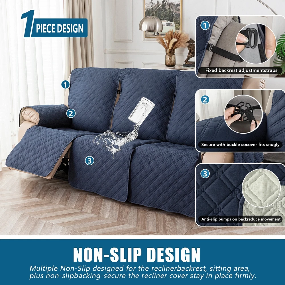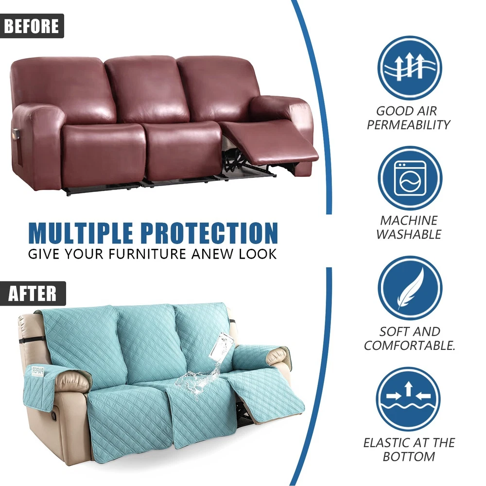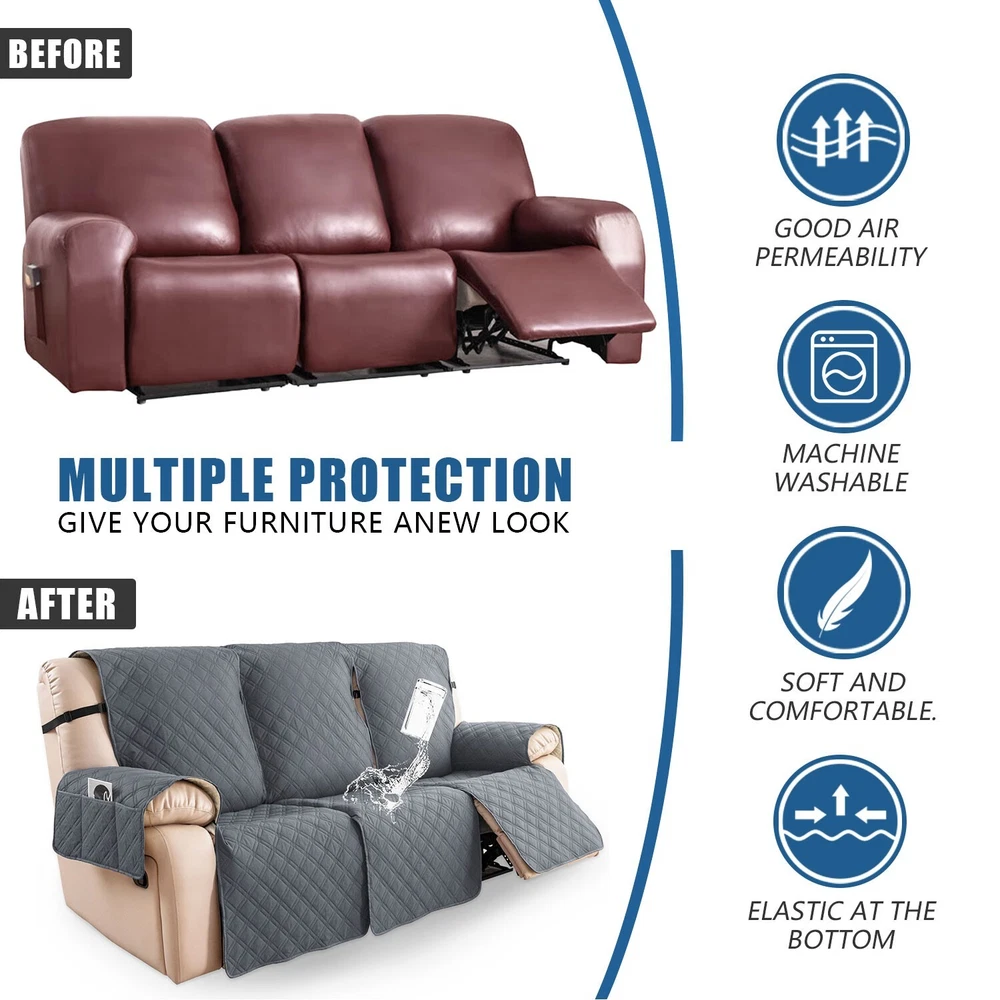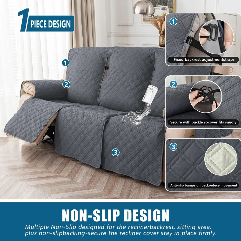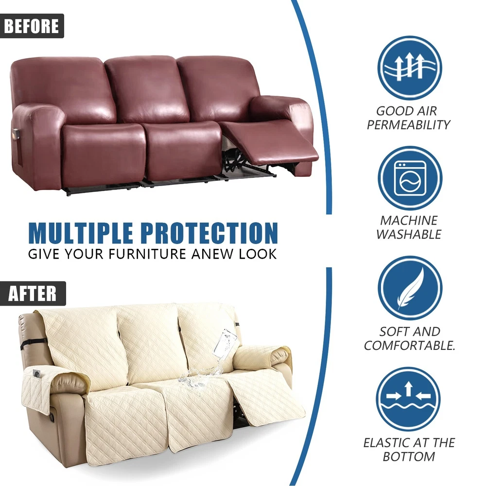 Anti-Slip Waterproof Non-Slip Design: The round silicone rubber backing of the recliner couch cover is designed to make the reclining couch covers more firmly stay in your sitting area. Elastic straps and non-slip buckles are included in each sofa recliner cover to stabilize the seat and prevent the back of the recliner from slipping off. Water-Resistant & Durable: The couch cover for reclining couch 3 seat consists of 3-layered quilted fabric, thick microfiber, and thick poly foam filling for extra comfort and softness. 100% waterproof reclining couch cover for pets protects your furniture from everyday wears and tears, leaks and stains. Dimension Guide: The recliner furniture covers protectors loveseat fits a seat width of 48 in. (2 pieces design, 23" per seat size). Recliner sofa fits a seat width of 72 in. (3 pieces design, 23" per seat size). Please measure before purchasing, see measuring guide in photo. Furniture Cover Protector: Couch covers for 3 cushion couch sofa recliner set are perfect for protecting your furniture from kids, scratches and fur from pets, dogs or accidental leaks. The unique diamond pattern design gives your old furniture brand new look. Enjoy fun time with your pets and children. Easy Installation & Care: Genina couch protector for dogs is effortless to install, use our picture installation guide to ensure a good fit (package includes installation instructions). Machine washable, gentle wash, do not bleach and iron.