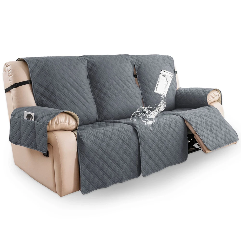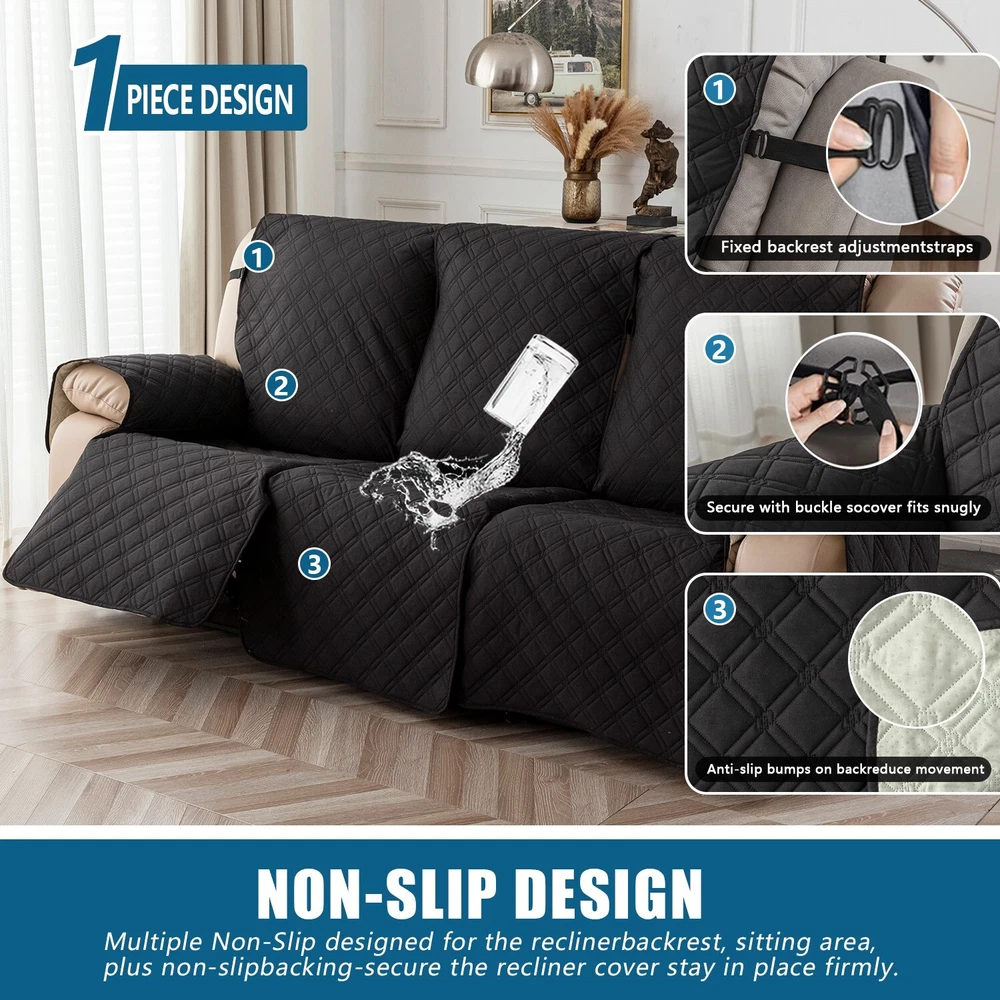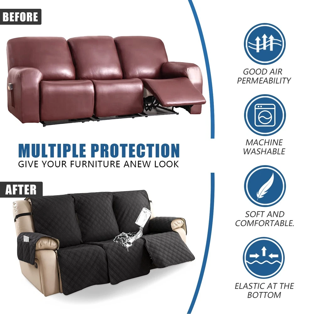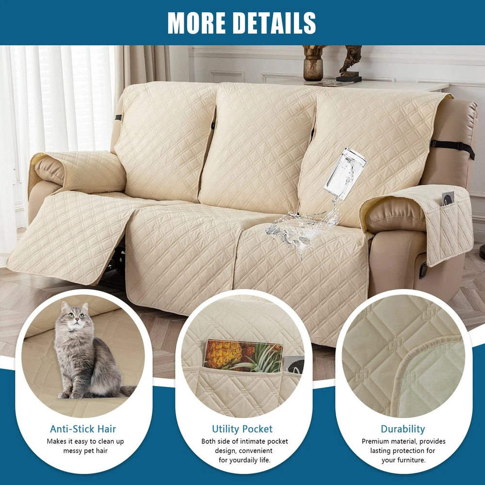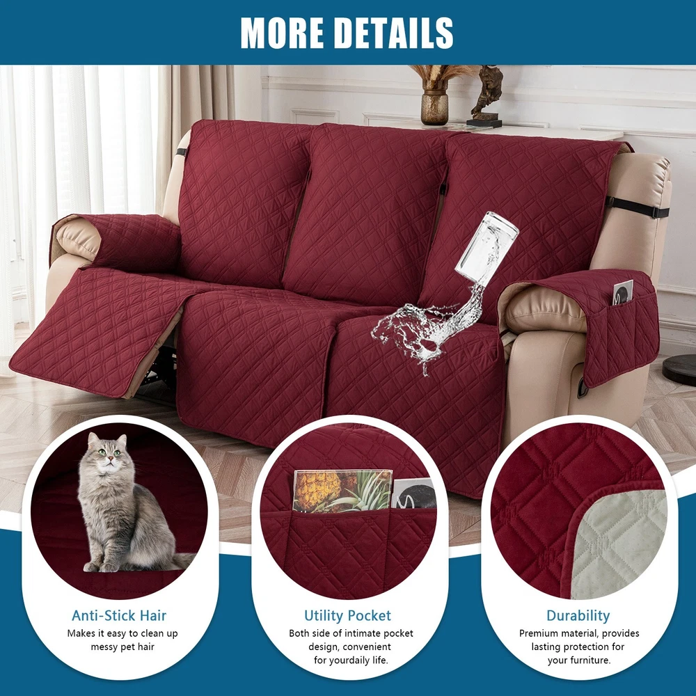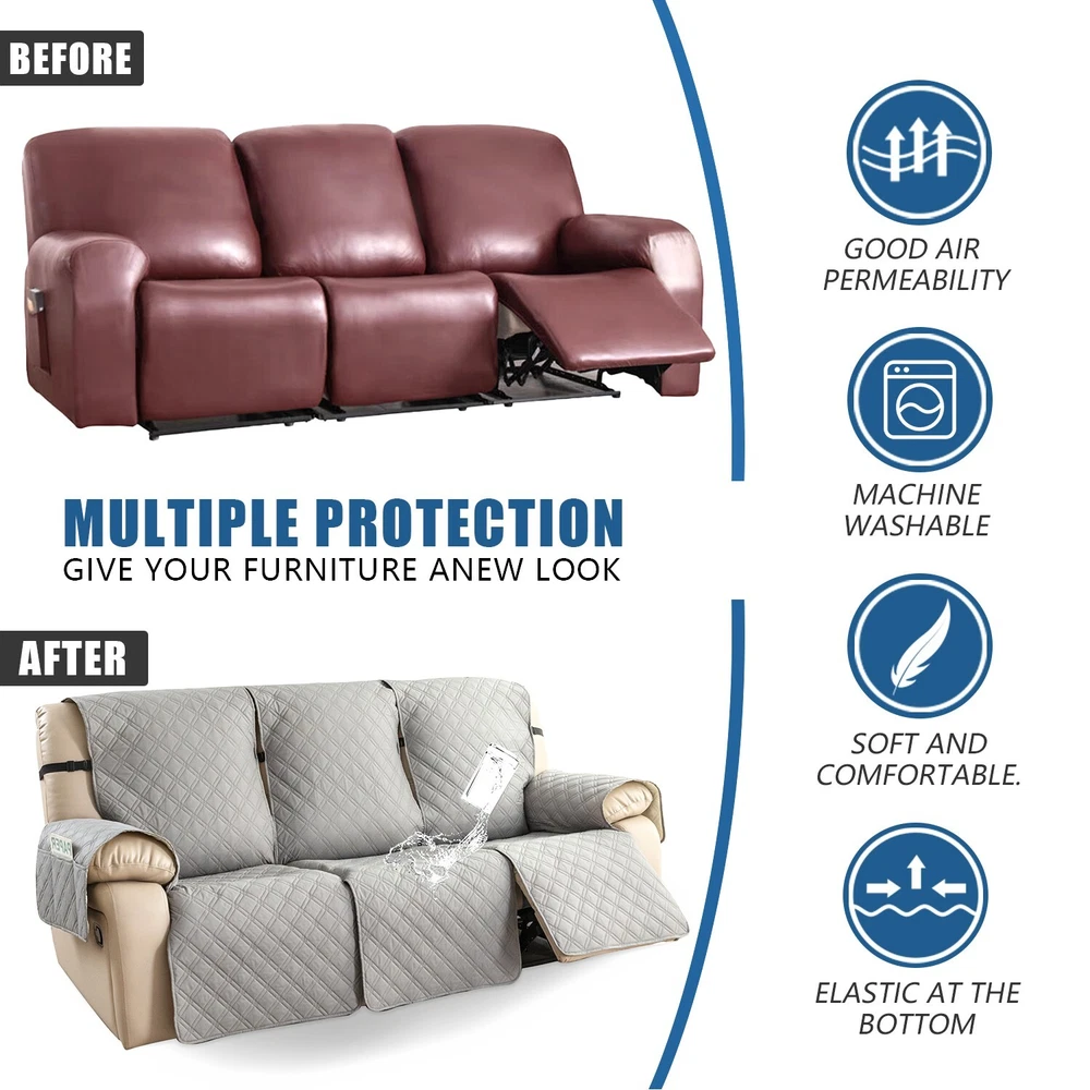 Anti-Slip Waterproof Non-Slip Design: The round silicone rubber backing of the recliner couch cover is designed to make the reclining couch covers more firmly stay in your sitting area. Elastic straps and non-slip buckles are included in each sofa recliner cover to stabilize the seat and prevent the back of the recliner from slipping off. Water-Resistant & Durable: The couch cover for reclining couch 3 seat consists of 3-layered quilted fabric, thick microfiber, and thick poly foam filling for extra comfort and softness. 100% waterproof reclining couch cover for pets protects your furniture from everyday wears and tears, leaks and stains. Dimension Guide: The recliner furniture covers protectors loveseat fits a seat width of 48 in. (2 pieces design, 23" per seat size). Recliner sofa fits a seat width of 72 in. (3 pieces design, 23" per seat size). Please measure before purchasing, see measuring guide in photo. Furniture Cover Protector: Couch covers for 3 cushion couch sofa recliner set are perfect for protecting your furniture from kids, scratches and fur from pets, dogs or accidental leaks. The unique diamond pattern design gives your old furniture brand new look. Enjoy fun time with your pets and children. Easy Installation & Care: Genina couch protector for dogs is effortless to install, use our picture installation guide to ensure a good fit (package includes installation instructions). Machine washable, gentle wash, do not bleach and iron.