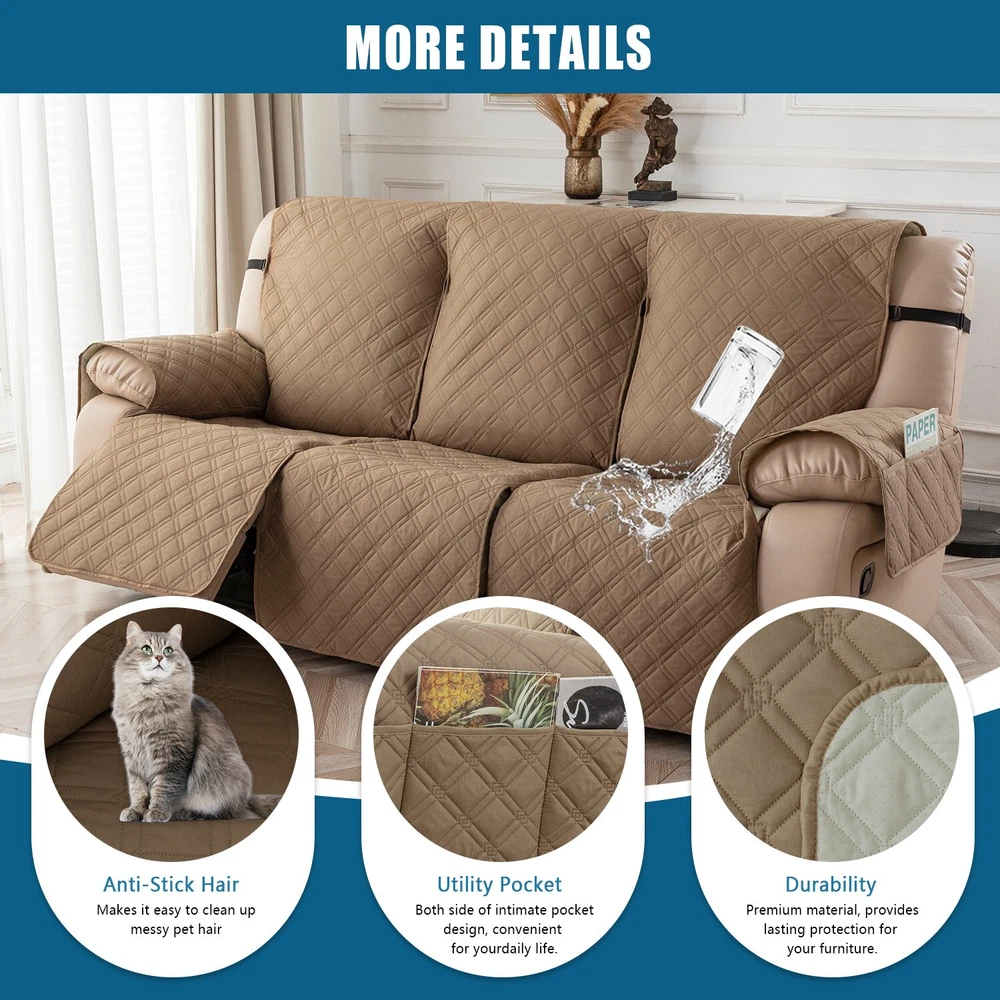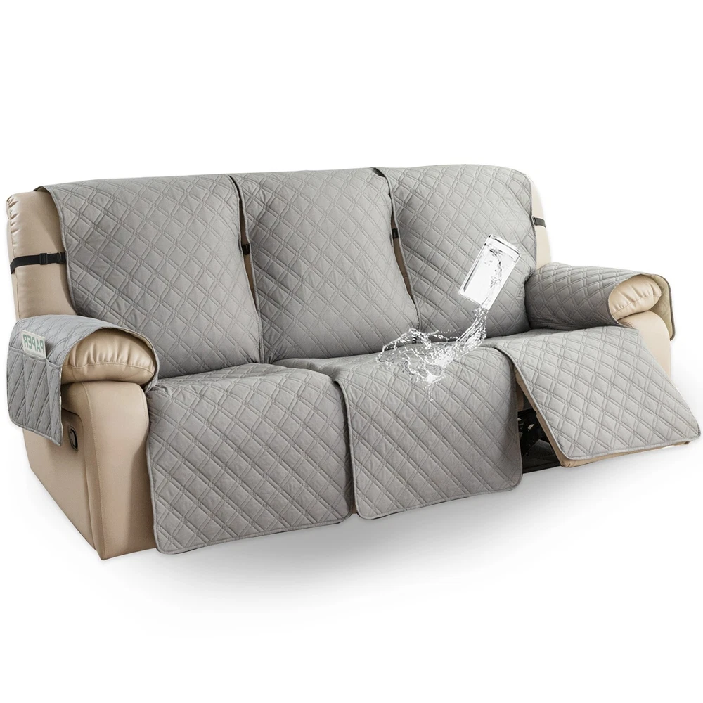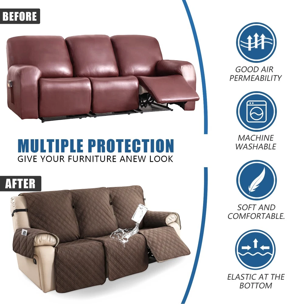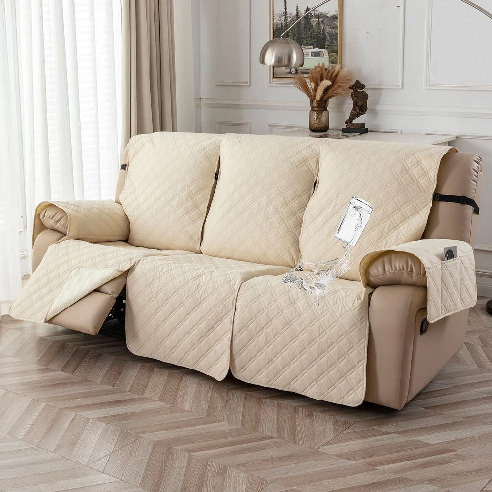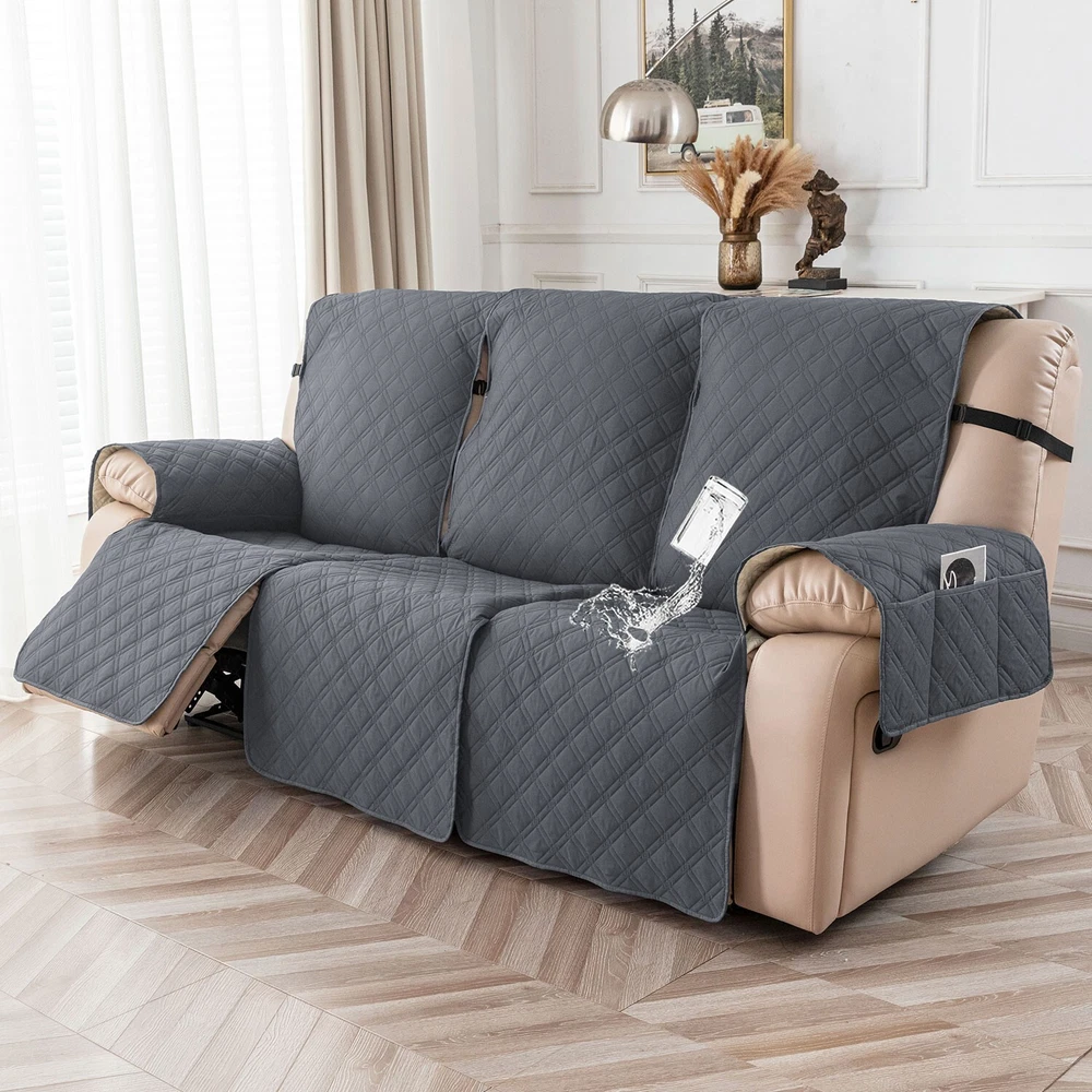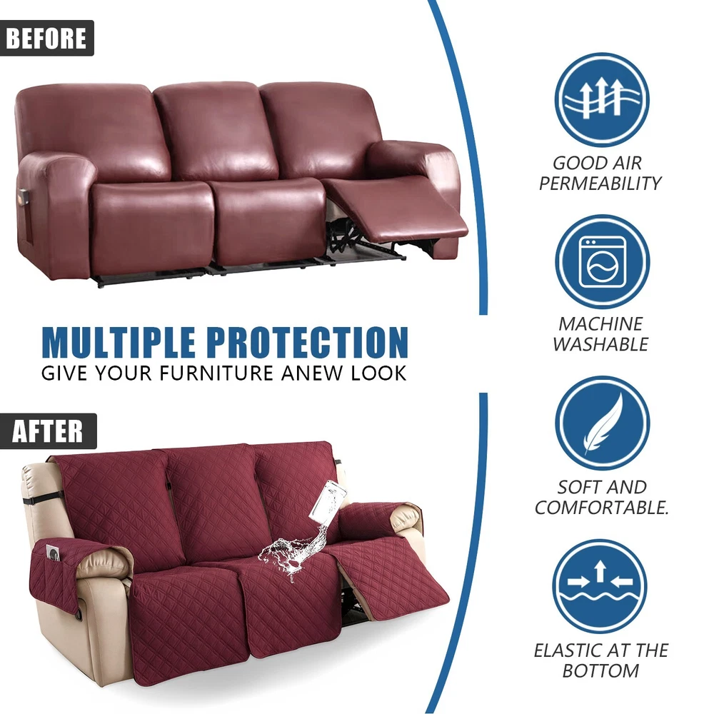 Anti-Slip Waterproof Non-Slip Design: The round silicone rubber backing of the recliner couch cover is designed to make the reclining couch covers more firmly stay in your sitting area. Elastic straps and non-slip buckles are included in each sofa recliner cover to stabilize the seat and prevent the back of the recliner from slipping off. Water-Resistant & Durable: The couch cover for reclining couch 3 seat consists of 3-layered quilted fabric, thick microfiber, and thick poly foam filling for extra comfort and softness. 100% waterproof reclining couch cover for pets protects your furniture from everyday wears and tears, leaks and stains. Dimension Guide: The recliner furniture covers protectors loveseat fits a seat width of 48 in. (2 pieces design, 23" per seat size). Recliner sofa fits a seat width of 72 in. (3 pieces design, 23" per seat size). Please measure before purchasing, see measuring guide in photo. Furniture Cover Protector: Couch covers for 3 cushion couch sofa recliner set are perfect for protecting your furniture from kids, scratches and fur from pets, dogs or accidental leaks. The unique diamond pattern design gives your old furniture brand new look. Enjoy fun time with your pets and children. Easy Installation & Care: Genina couch protector for dogs is effortless to install, use our picture installation guide to ensure a good fit (package includes installation instructions). Machine washable, gentle wash, do not bleach and iron.