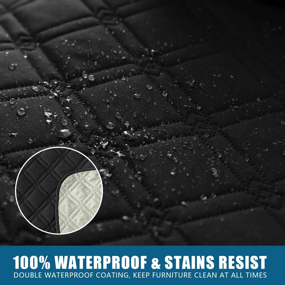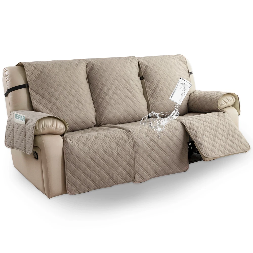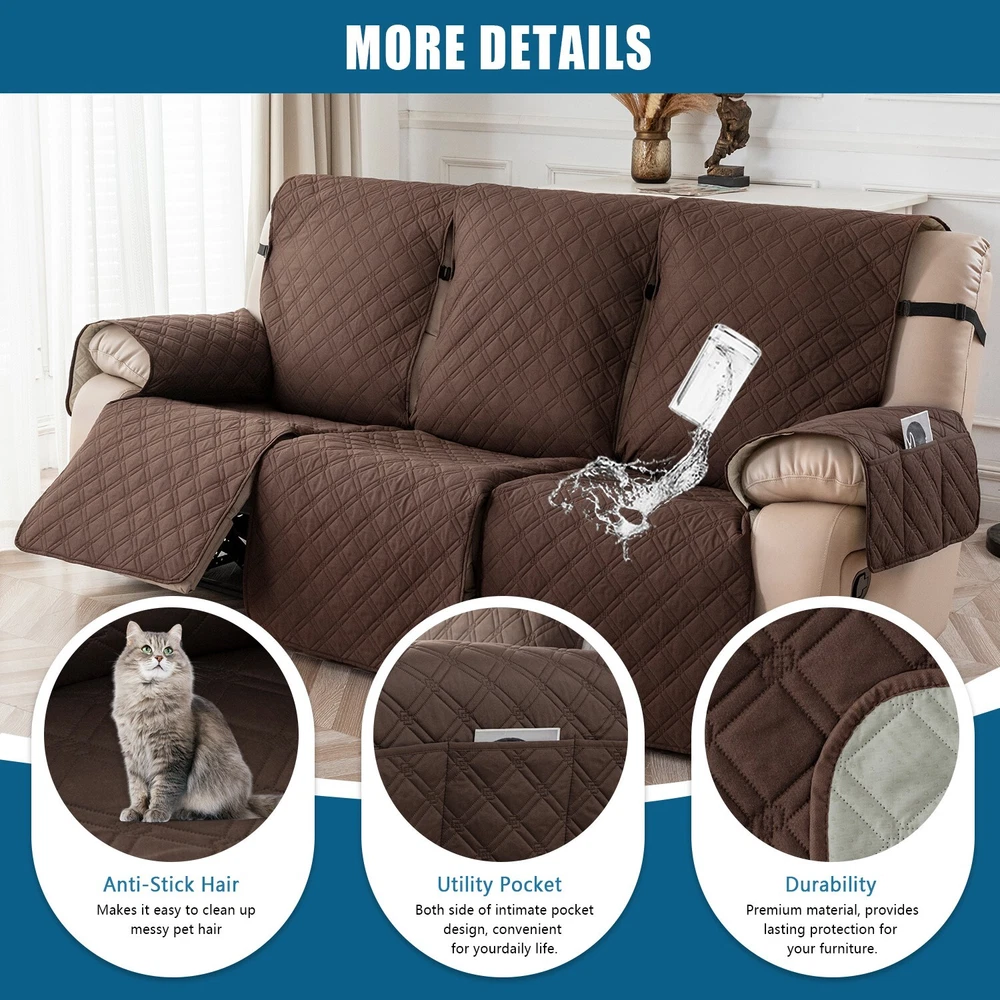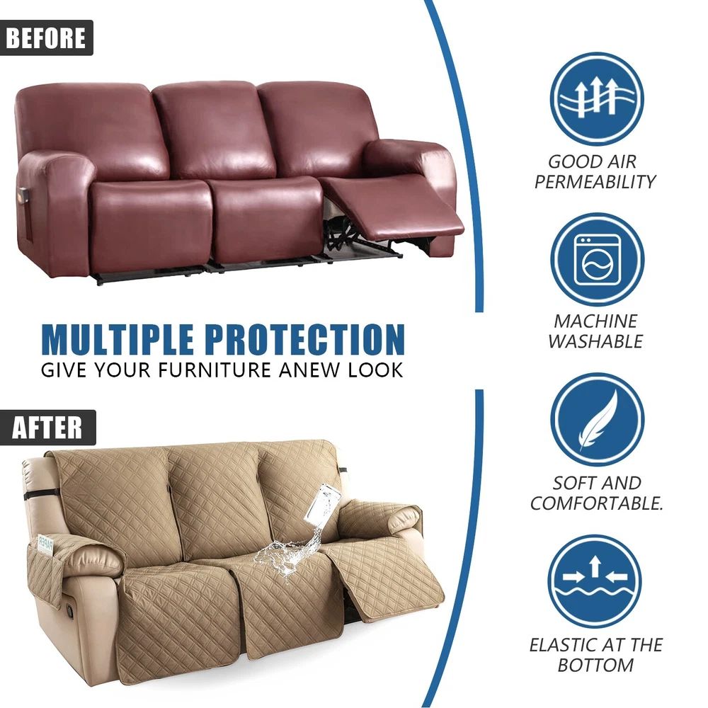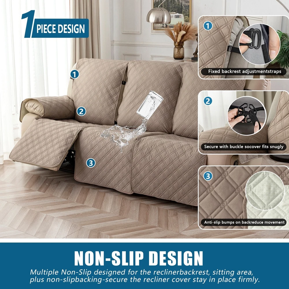 Anti-Slip Waterproof Non-Slip Design: The round silicone rubber backing of the recliner couch cover is designed to make the reclining couch covers more firmly stay in your sitting area. Elastic straps and non-slip buckles are included in each sofa recliner cover to stabilize the seat and prevent the back of the recliner from slipping off. Water-Resistant & Durable: The couch cover for reclining couch 3 seat consists of 3-layered quilted fabric, thick microfiber, and thick poly foam filling for extra comfort and softness. 100% waterproof reclining couch cover for pets protects your furniture from everyday wears and tears, leaks and stains. Dimension Guide: The recliner furniture covers protectors loveseat fits a seat width of 48 in. (2 pieces design, 23" per seat size). Recliner sofa fits a seat width of 72 in. (3 pieces design, 23" per seat size). Please measure before purchasing, see measuring guide in photo. Furniture Cover Protector: Couch covers for 3 cushion couch sofa recliner set are perfect for protecting your furniture from kids, scratches and fur from pets, dogs or accidental leaks. The unique diamond pattern design gives your old furniture brand new look. Enjoy fun time with your pets and children. Easy Installation & Care: Genina couch protector for dogs is effortless to install, use our picture installation guide to ensure a good fit (package includes installation instructions). Machine washable, gentle wash, do not bleach and iron.