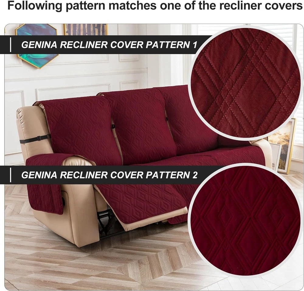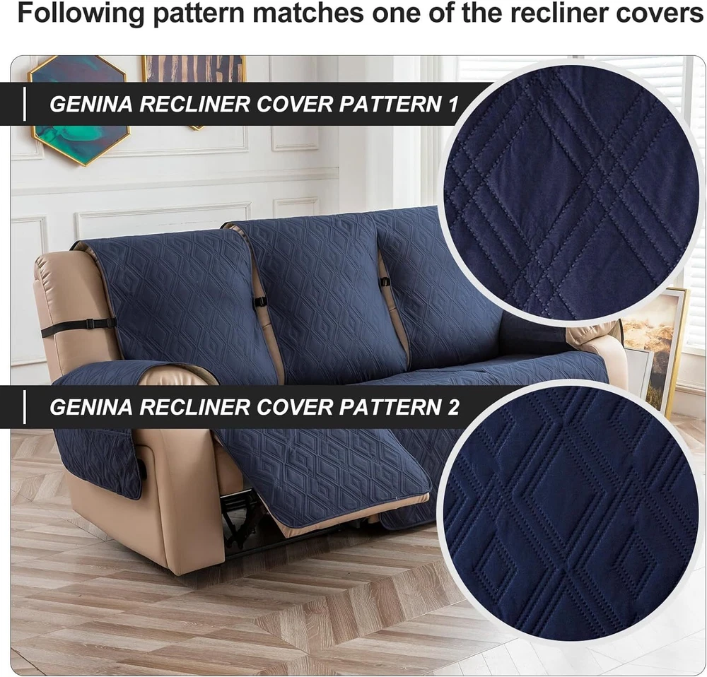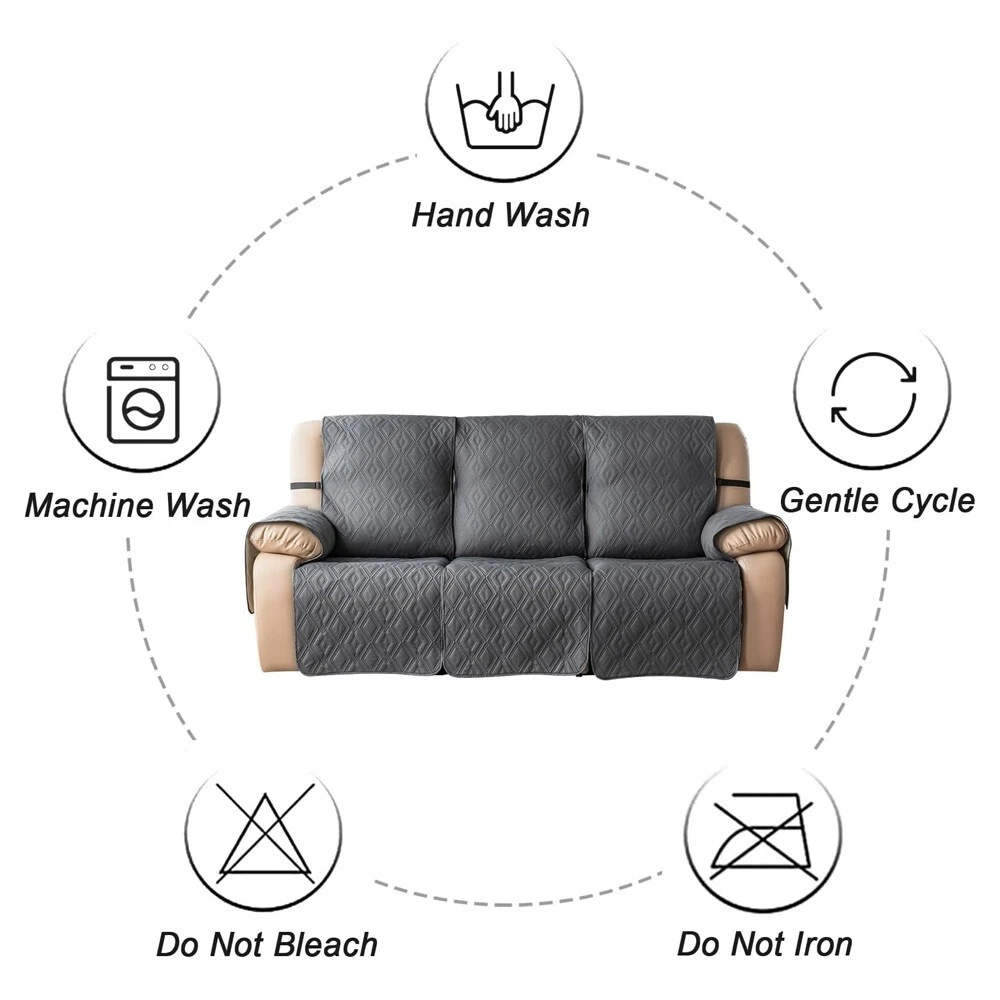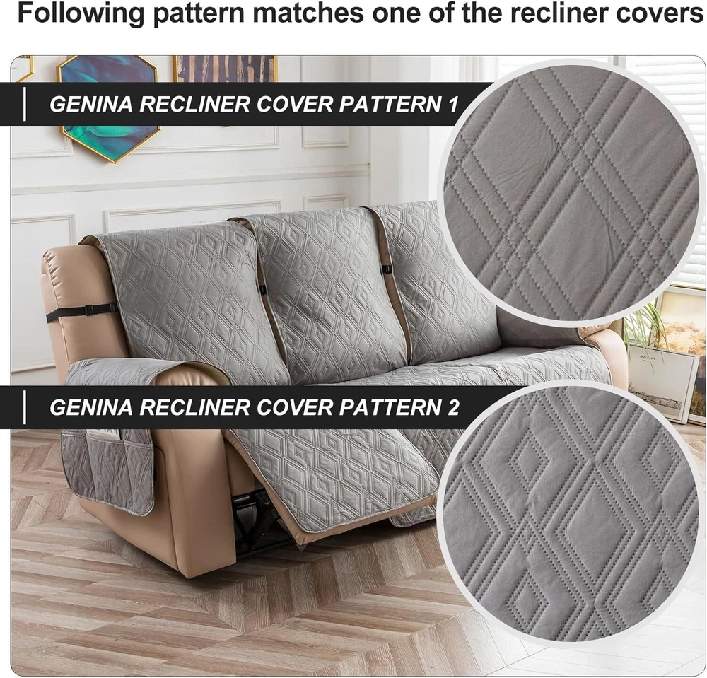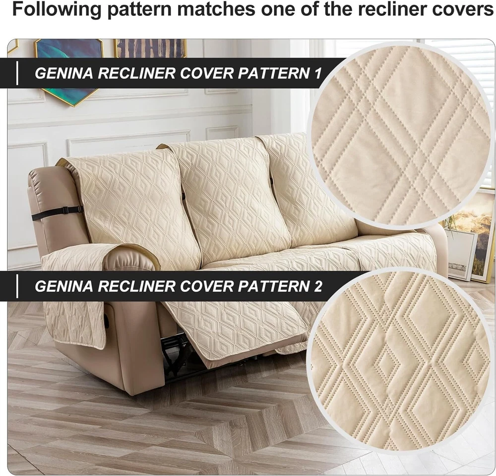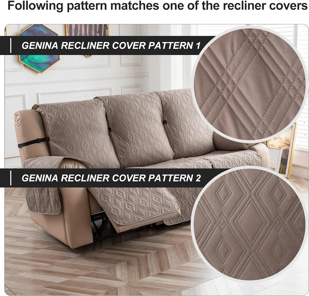 Anti-Slip Waterproof Non-Slip Design: The round silicone rubber backing of the recliner couch cover is designed to make the reclining couch covers more firmly stay in your sitting area. Elastic straps and non-slip buckles are included in each sofa recliner cover to stabilize the seat and prevent the back of the recliner from slipping off. Water-Resistant & Durable: The couch cover for reclining couch 3 seat consists of 3-layered quilted fabric, thick microfiber, and thick poly foam filling for extra comfort and softness. 100% waterproof reclining couch cover for pets protects your furniture from everyday wears and tears, leaks and stains. Dimension Guide: The recliner furniture covers protectors loveseat fits a seat width of 48 in. (2 pieces design, 23" per seat size). Recliner sofa fits a seat width of 72 in. (3 pieces design, 23" per seat size). Please measure before purchasing, see measuring guide in photo. Furniture Cover Protector: Couch covers for 3 cushion couch sofa recliner set are perfect for protecting your furniture from kids, scratches and fur from pets, dogs or accidental leaks. The unique diamond pattern design gives your old furniture brand new look. Enjoy fun time with your pets and children. Easy Installation & Care: Genina couch protector for dogs is effortless to install, use our picture installation guide to ensure a good fit (package includes installation instructions). Machine washable, gentle wash, do not bleach and iron.