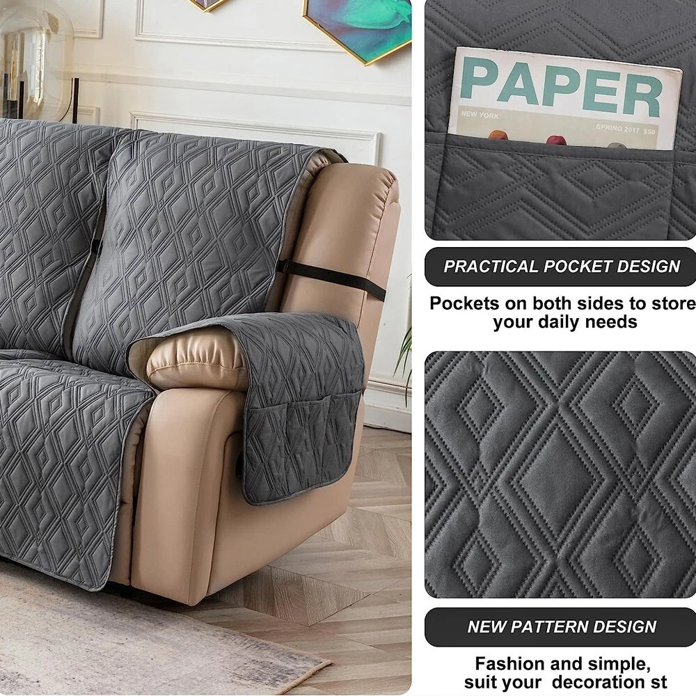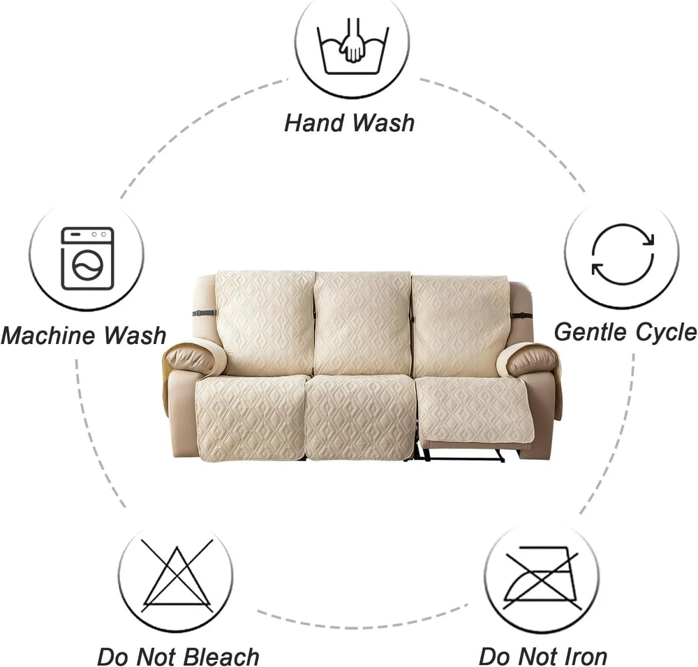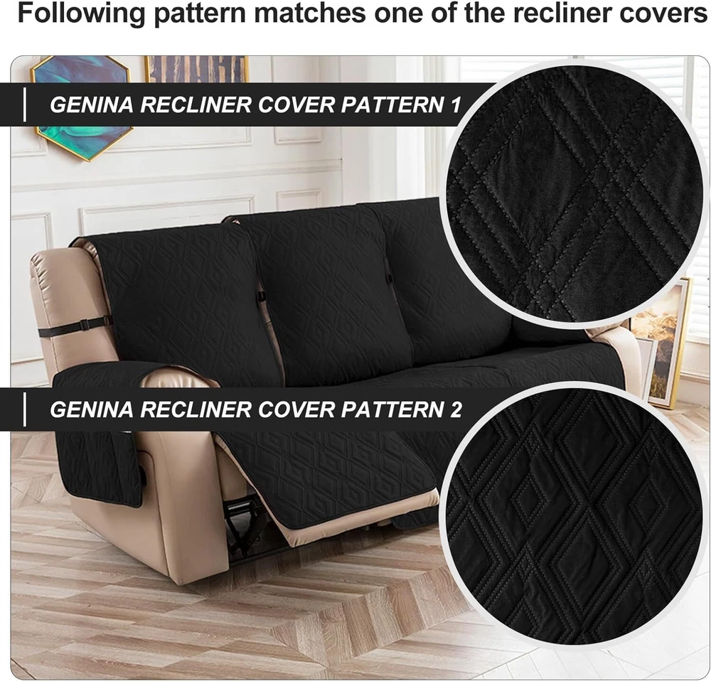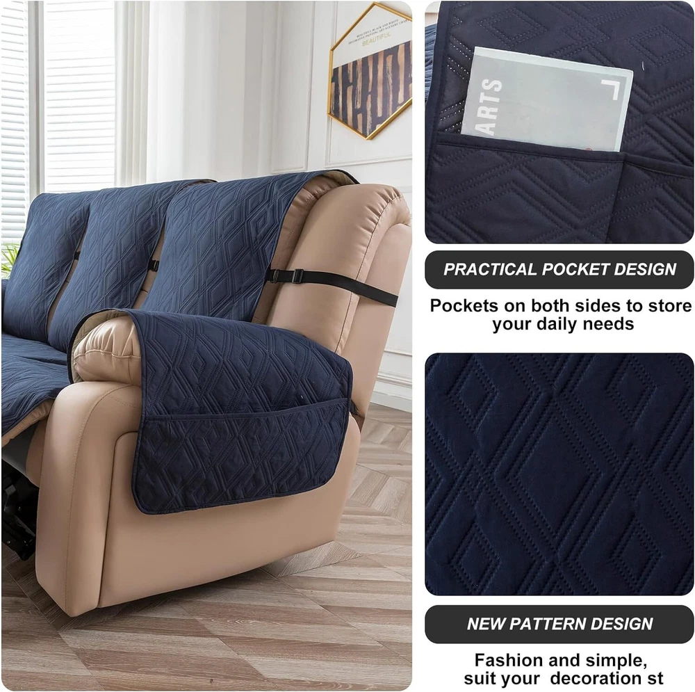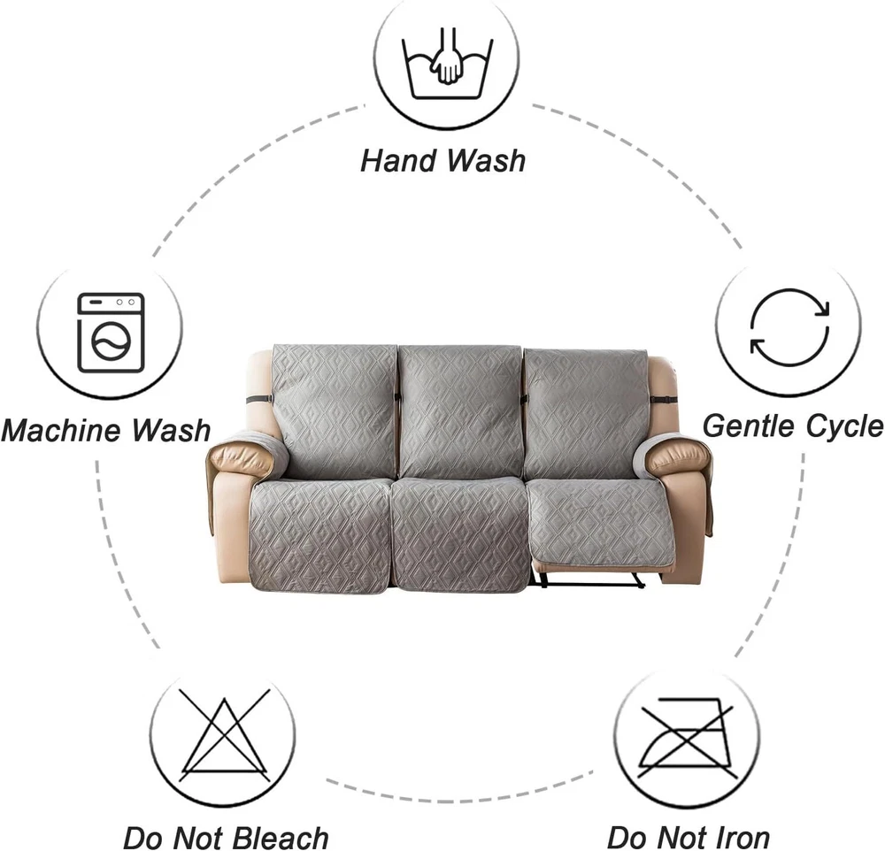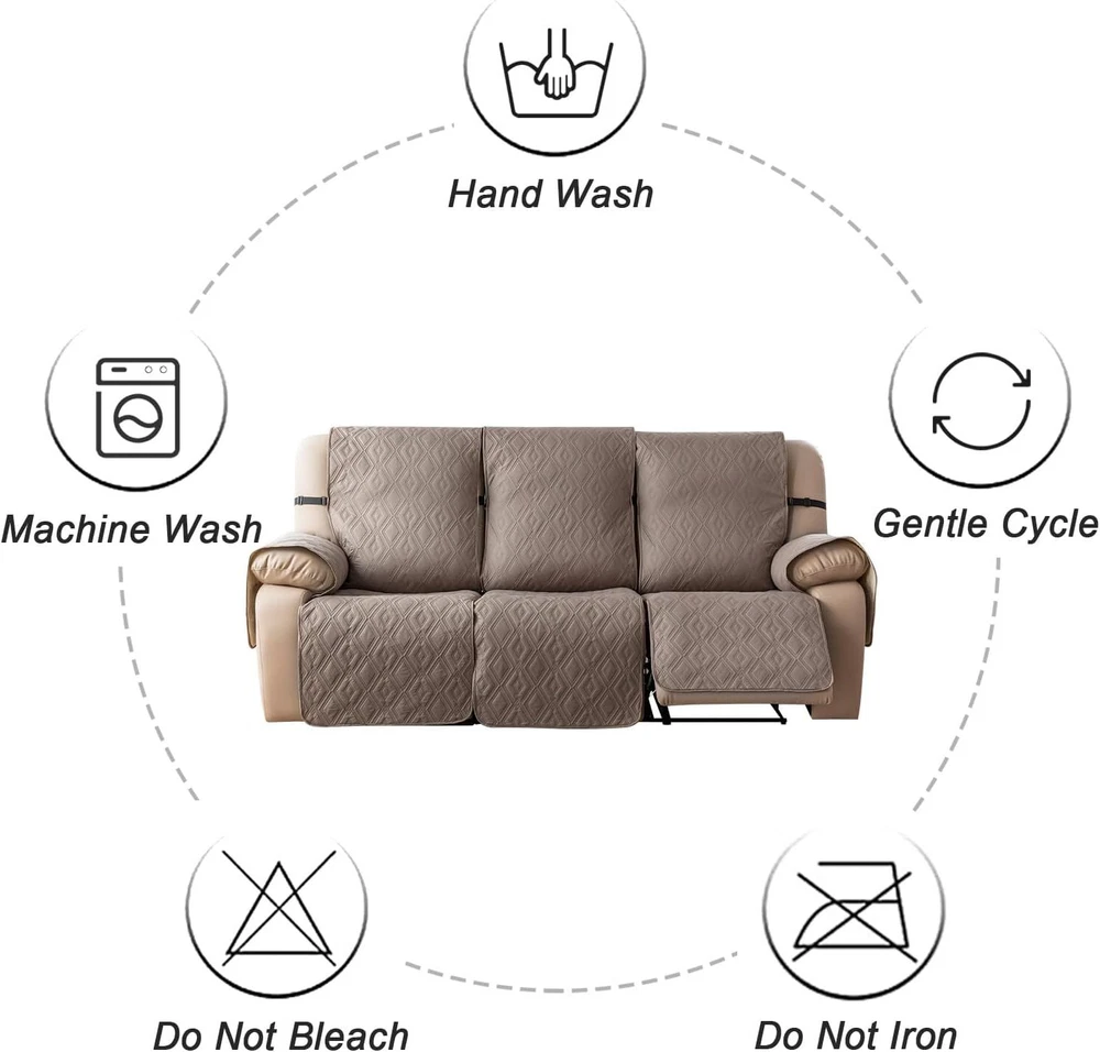Anti-Slip Waterproof Non-Slip Design: The round silicone rubber backing of the recliner couch cover is designed to make the reclining couch covers more firmly stay in your sitting area. Elastic straps and non-slip buckles are included in each sofa recliner cover to stabilize the seat and prevent the back of the recliner from slipping off. Water-Resistant & Durable: The couch cover for reclining couch 3 seat consists of 3-layered quilted fabric, thick microfiber, and thick poly foam filling for extra comfort and softness. 100% waterproof reclining couch cover for pets protects your furniture from everyday wears and tears, leaks and stains. Dimension Guide: The recliner furniture covers protectors loveseat fits a seat width of 48 in. (2 pieces design, 23" per seat size). Recliner sofa fits a seat width of 72 in. (3 pieces design, 23" per seat size). Please measure before purchasing, see measuring guide in photo. Furniture Cover Protector: Couch covers for 3 cushion couch sofa recliner set are perfect for protecting your furniture from kids, scratches and fur from pets, dogs or accidental leaks. The unique diamond pattern design gives your old furniture brand new look. Enjoy fun time with your pets and children. Easy Installation & Care: Genina couch protector for dogs is effortless to install, use our picture installation guide to ensure a good fit (package includes installation instructions). Machine washable, gentle wash, do not bleach and iron.