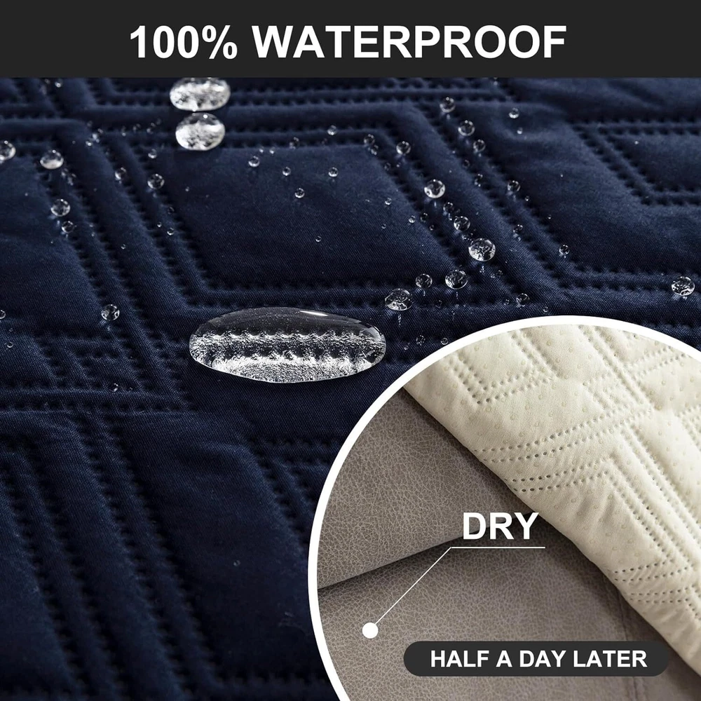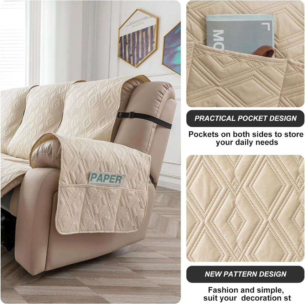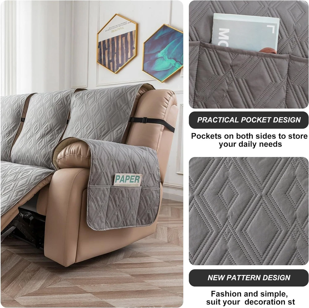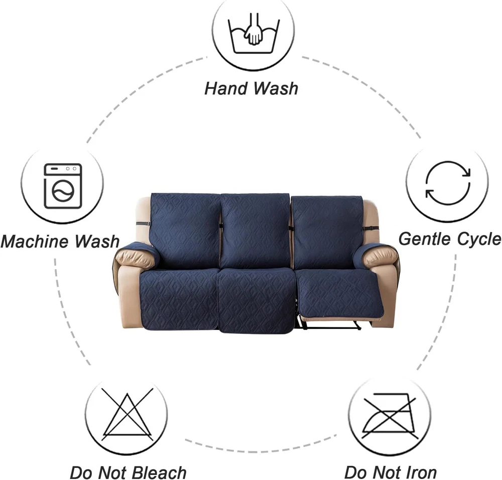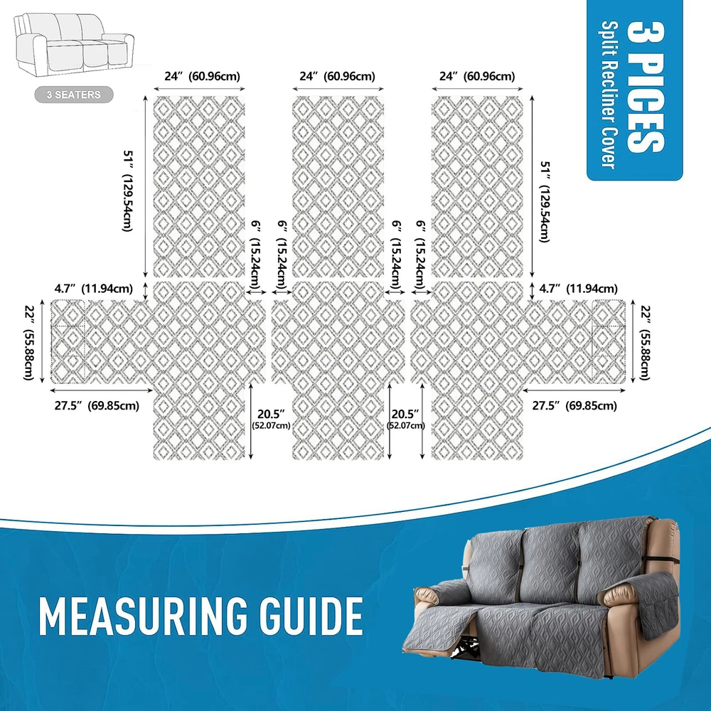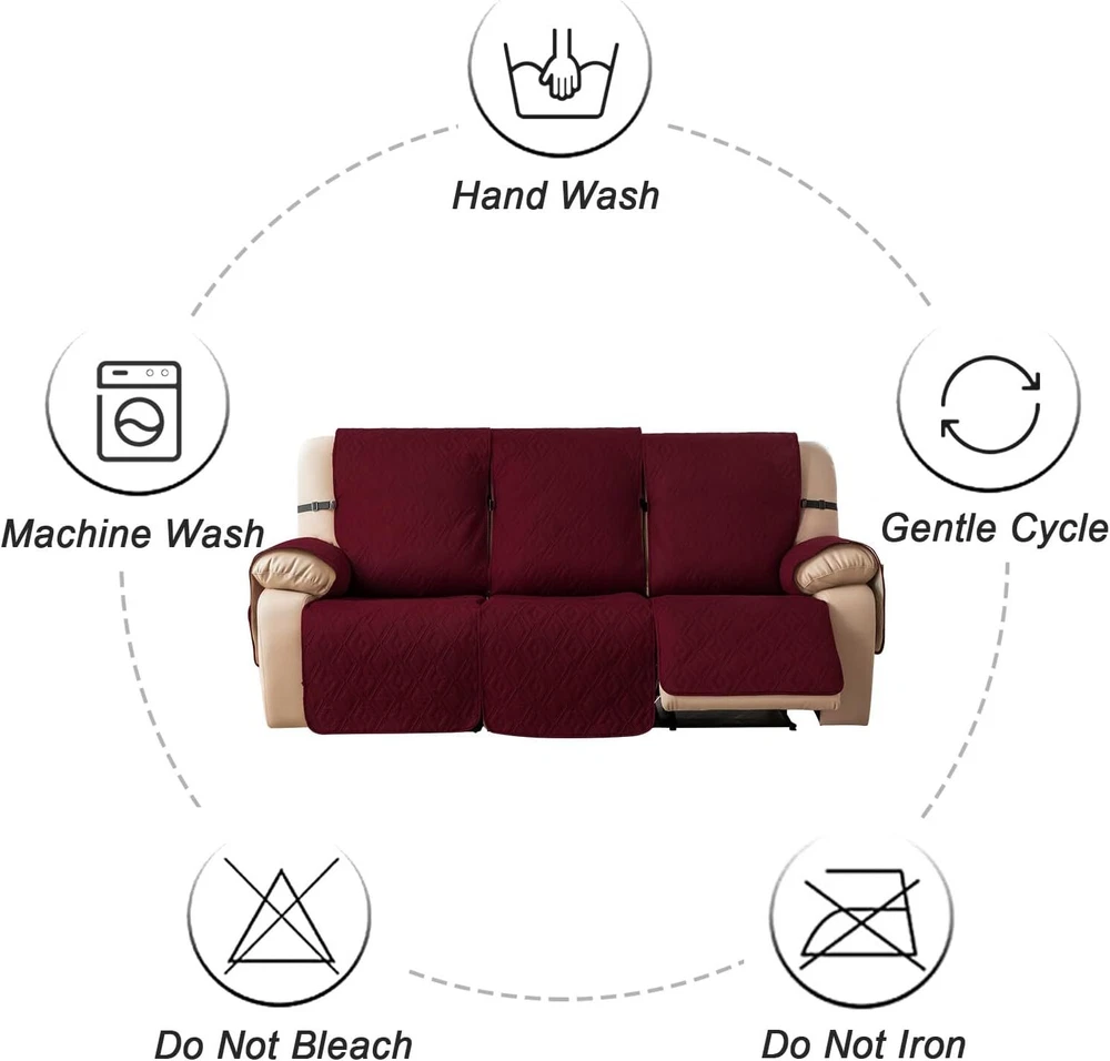 Anti-Slip Waterproof Non-Slip Design: The round silicone rubber backing of the recliner couch cover is designed to make the reclining couch covers more firmly stay in your sitting area. Elastic straps and non-slip buckles are included in each sofa recliner cover to stabilize the seat and prevent the back of the recliner from slipping off. Water-Resistant & Durable: The couch cover for reclining couch 3 seat consists of 3-layered quilted fabric, thick microfiber, and thick poly foam filling for extra comfort and softness. 100% waterproof reclining couch cover for pets protects your furniture from everyday wears and tears, leaks and stains. Dimension Guide: The recliner furniture covers protectors loveseat fits a seat width of 48 in. (2 pieces design, 23" per seat size). Recliner sofa fits a seat width of 72 in. (3 pieces design, 23" per seat size). Please measure before purchasing, see measuring guide in photo. Furniture Cover Protector: Couch covers for 3 cushion couch sofa recliner set are perfect for protecting your furniture from kids, scratches and fur from pets, dogs or accidental leaks. The unique diamond pattern design gives your old furniture brand new look. Enjoy fun time with your pets and children. Easy Installation & Care: Genina couch protector for dogs is effortless to install, use our picture installation guide to ensure a good fit (package includes installation instructions). Machine washable, gentle wash, do not bleach and iron.