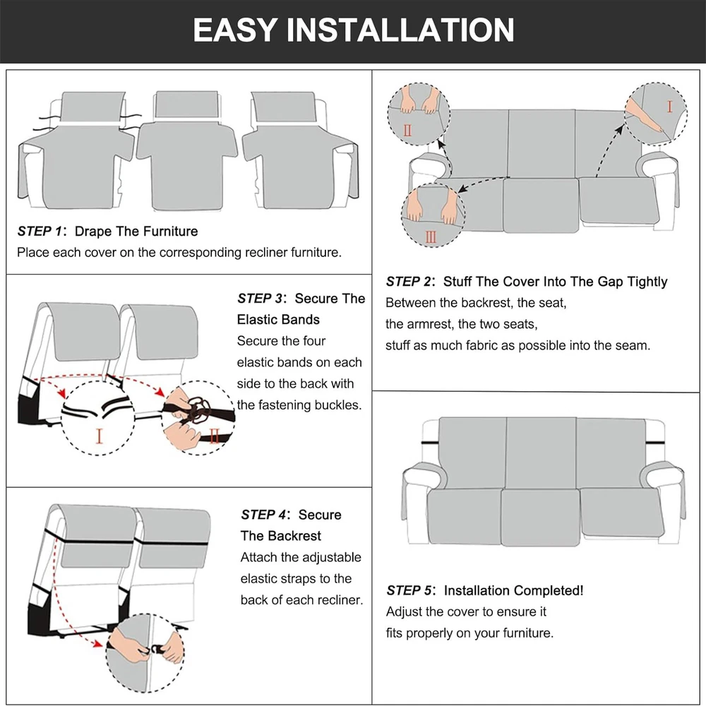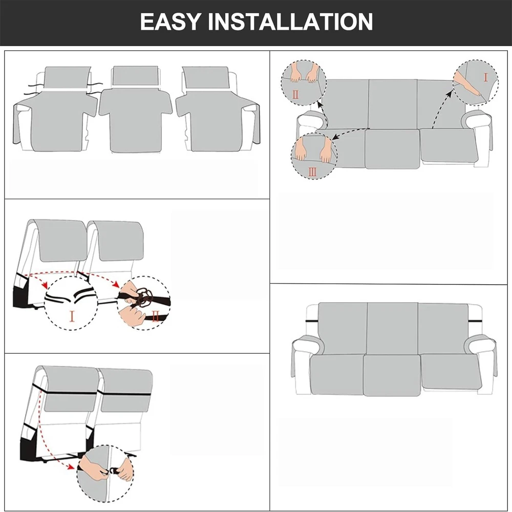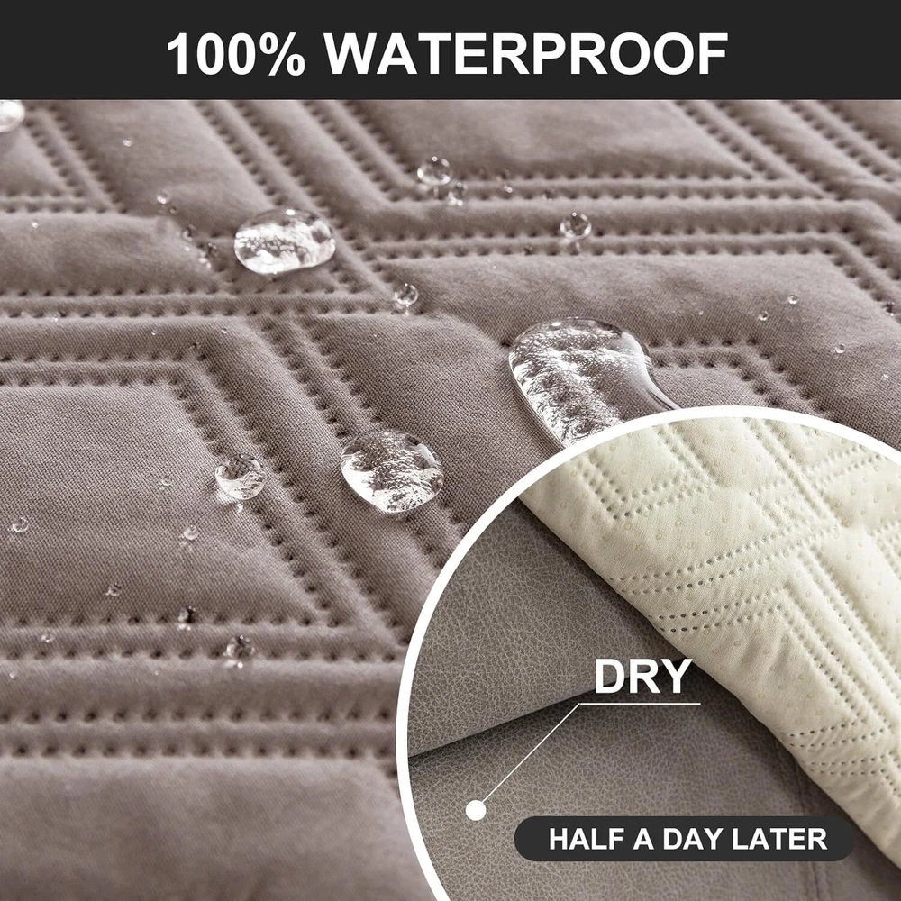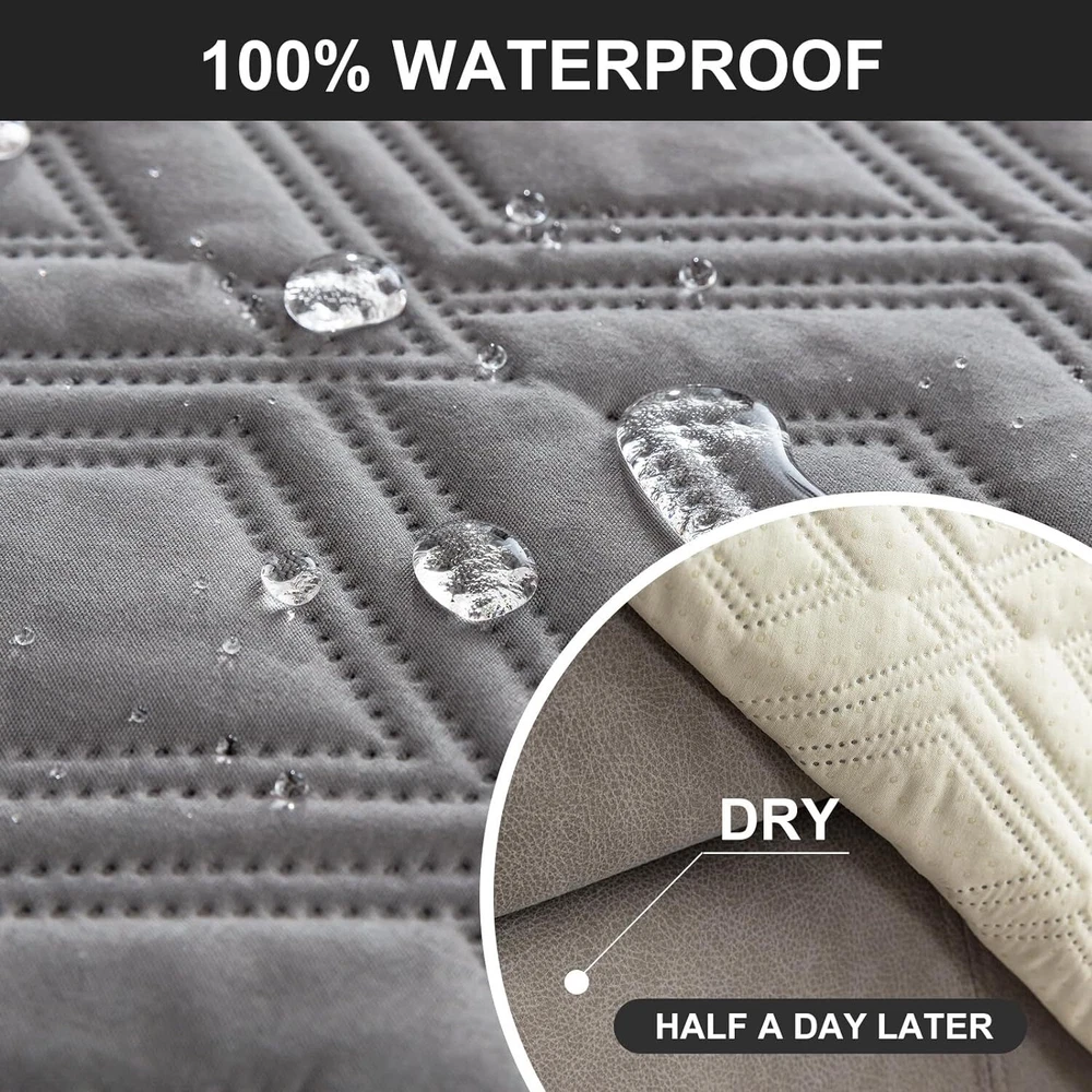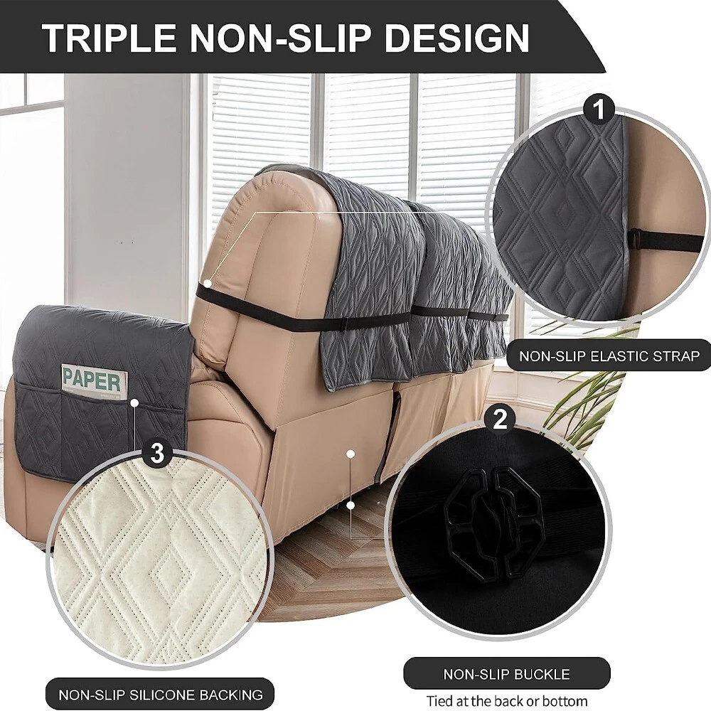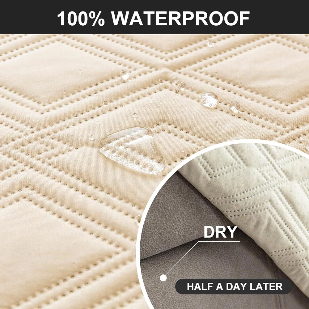 Anti-Slip Waterproof Non-Slip Design: The round silicone rubber backing of the recliner couch cover is designed to make the reclining couch covers more firmly stay in your sitting area. Elastic straps and non-slip buckles are included in each sofa recliner cover to stabilize the seat and prevent the back of the recliner from slipping off. Water-Resistant & Durable: The couch cover for reclining couch 3 seat consists of 3-layered quilted fabric, thick microfiber, and thick poly foam filling for extra comfort and softness. 100% waterproof reclining couch cover for pets protects your furniture from everyday wears and tears, leaks and stains. Dimension Guide: The recliner furniture covers protectors loveseat fits a seat width of 48 in. (2 pieces design, 23" per seat size). Recliner sofa fits a seat width of 72 in. (3 pieces design, 23" per seat size). Please measure before purchasing, see measuring guide in photo. Furniture Cover Protector: Couch covers for 3 cushion couch sofa recliner set are perfect for protecting your furniture from kids, scratches and fur from pets, dogs or accidental leaks. The unique diamond pattern design gives your old furniture brand new look. Enjoy fun time with your pets and children. Easy Installation & Care: Genina couch protector for dogs is effortless to install, use our picture installation guide to ensure a good fit (package includes installation instructions). Machine washable, gentle wash, do not bleach and iron.
