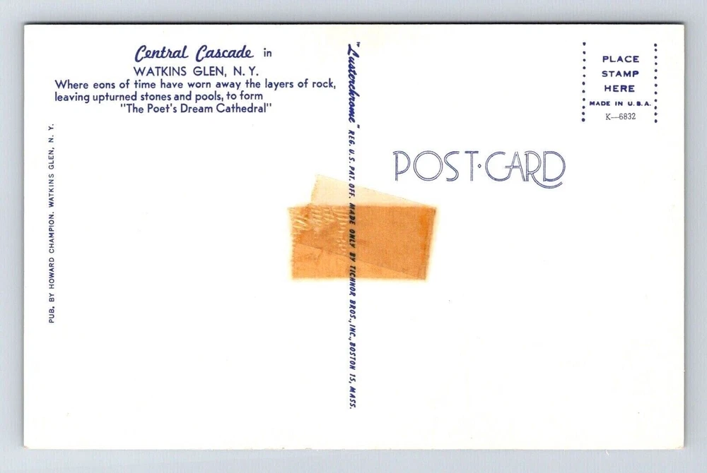 Watkins Glen New York Central Cascade Scenic Landmark Chrome UNP Postcard You will receive the exact postcard in the picture. We use a high quality scanner to capture pictures of the front and back for every postcard we have listed. Postcards will be in the condition as shown in the pictures. We ship Mon-Fri. We also offer combined shipping discounts or free shipping. If we have shipping on your listing you can buy as many additional postcards as you want and they will ship for free after the fist postage is paid. If you select first class shipping and pay the extra your postcard will be shipping as a package with extra protection. If you choose free shipping or $1.50 shipping your postcard will be shipped in a standard envelope with soft plastic sleeve and do not bend written on the envelope. Orders of 15 or more cards or with single cards over $20 in them will automatically be upgraded to first class and at least a photo mailer. If you have any questions feel free to ask. We are willing to consider reasonable offers and we offer discounts on orders of more than one card. Thank You _gsrx_vers_1436 (GS 9.0.5 (1436)) _gsrx_vers_1503 (GS 9.2.1 (1503)) _gsrx_vers_1608 (GS 9.5 (1608)) _gsrx_vers_1653 (GS 9.7.5 (1653))