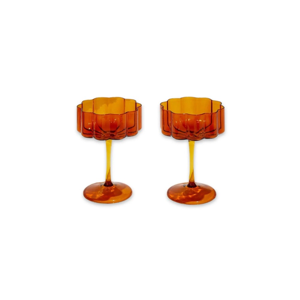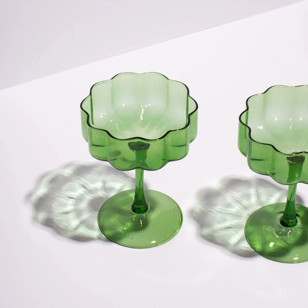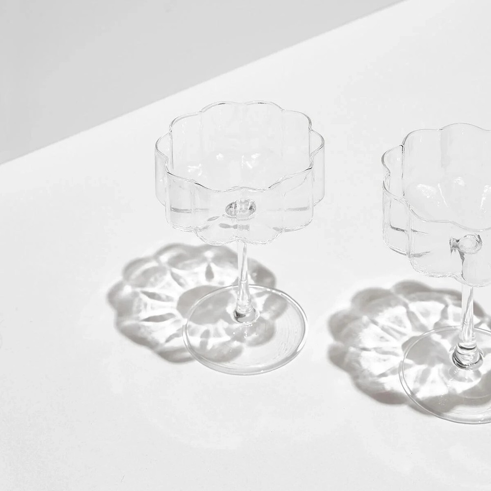 FAZEEK's WAVE Coupe Glasses, featuring an elongated stem, wide bowl, and signature rippled edges. Serve your champagne & coctail drinks in style! Perfect for sparkling wine, cocktails, or desserts, these hand-blown glasses blend modern design with timeless elegance. Sold in sets of two. Shipping price good for lower 48 states only!