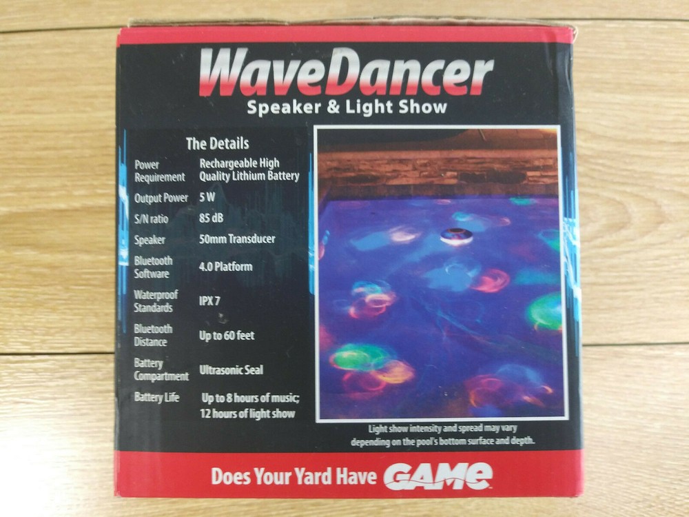 WaveDancer Waterproof Floating Speaker W/ Light Show Get the party started with this portable waterproof Bluetooth speaker with multicolor light show from GAME! Not only do you get a great sounding speaker, you get a light show that syncs to your music. No batteries required, this rechargeable IPX7 waterproof floating speaker wirelessly connects to your iPhone or smart device for hours of music as you relax in the pool with friends. The underwater light show projects approximately 10-15 feet in diameter, intensity will vary according to the color, size and depth of your pool. Package includes USB power cord to recharge the speaker. Easily change tracks and adjust the volume directly from the speaker. Built-in hanger allows you to fasten the speaker on a hook to light-up your backyard, take it camping, or to the beach. The possibilities are endless!
