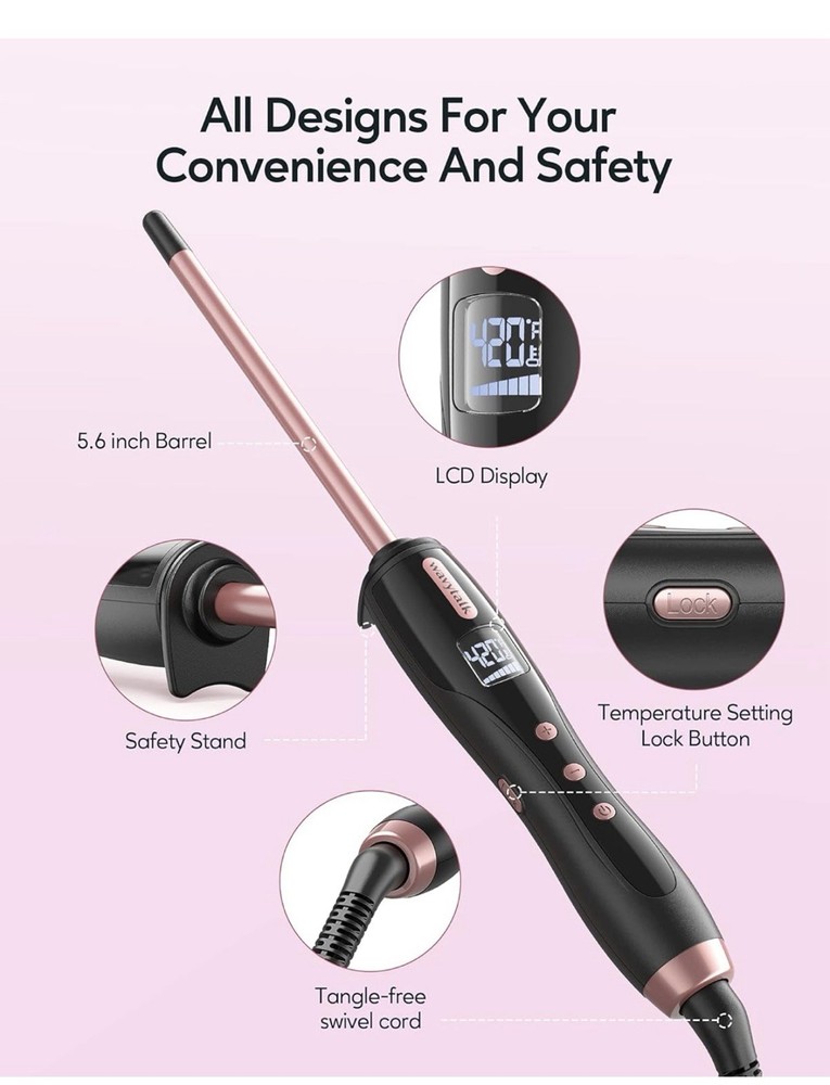 Wavytalk 3/8 Inch Small Curling Iron Wand for Short & Long Hair Rose Gold. Opened box. The product has been taken out of the box and tested to ensure it works properly. It can show minimal signs of use (cord untangled, etc) from the testing process. Box may show signs of damage from shipping.