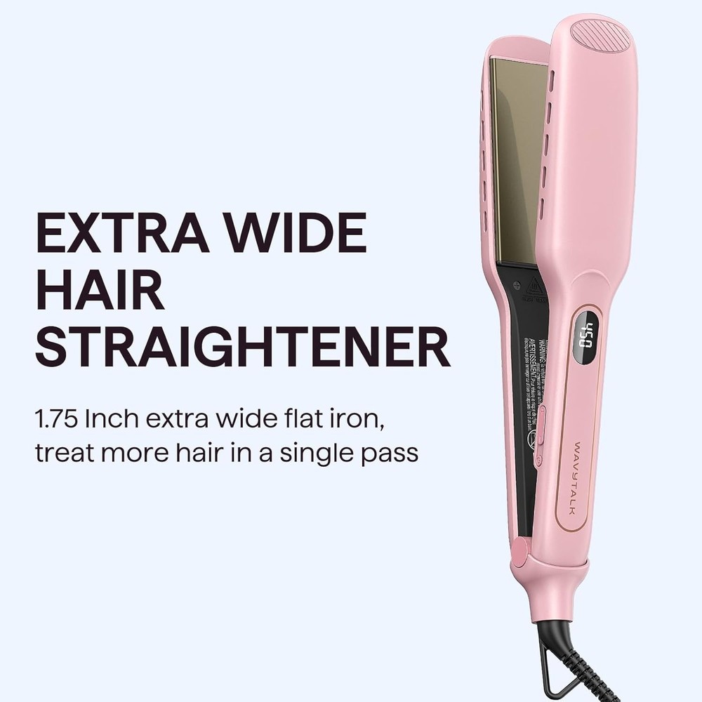 Intimate Design: our dual voltage flat iron with safety lock function is perfect for traveling. Its 8 ft long swivel cord with hard-wearing housing and 360 degree swivel joint is designed for home or professional use 9 Temperature Settings: different temperature settings of this straightener allow you to choose the right heat setting to suit your lengths easily. The temperature control (290℉-450℉) keeps any hair type more shiny, sleek, and minimize heat damage Get Glossy Hair: S11 Hair Straightener heats up in 30 s and maintain consistent heat distribution for long lasting styles. Your hair goes through the splint like smoke. Wavytalk hair straightener is your ideal solution for smooth, sleek and glossy hair Shorten Hair Styling Time: our extra wide flat iron straightens hair faster and more easily. If you have long and thick hair, you can treat more hair in a single pass, saving your time while creating styles. It's perfectly for long, thick or curly hair 20% faster styling & 50% more protection: our wet to straight hair straightener, engineered with 10 ventilation holes, is capable of safely operating on both dry and damp hair. It saves up to 20% of styling time in hair drying and styling Product Dimensions 12.99 x 1.93 x 1.93 inches; 1.12 Pounds Manufacturer Wavytalk Brand Wavytalk Product Benefits Straightening Shape Flat Material Titanium Color Pink 6980537