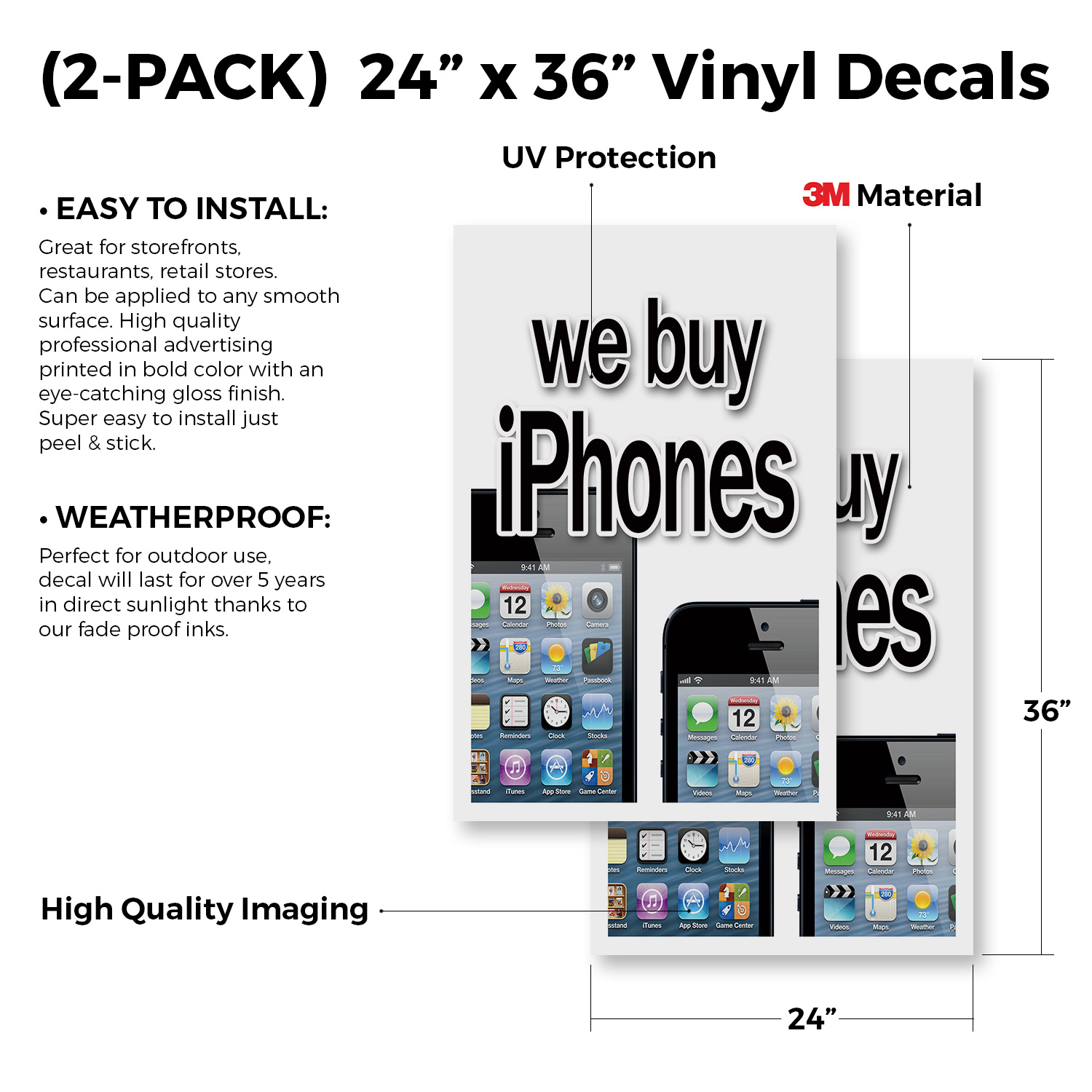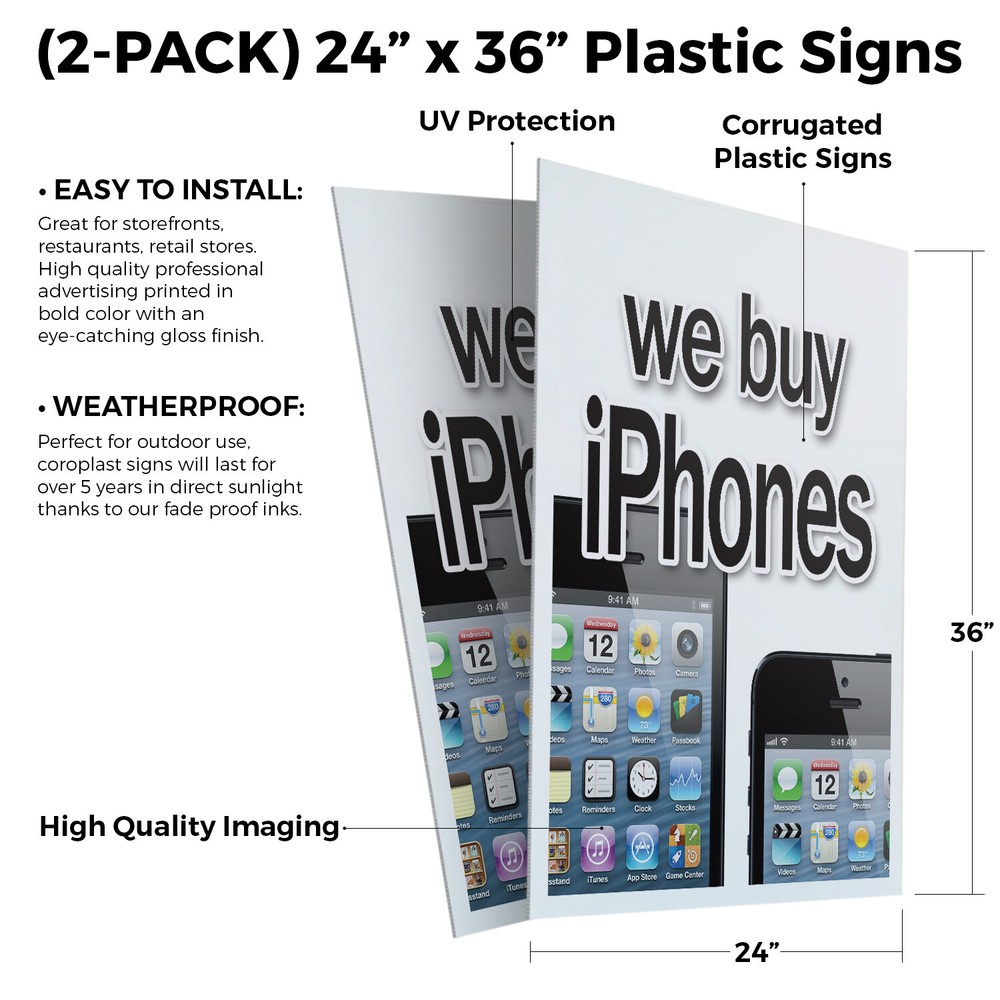 SignMission (2-Pack) 24” x 36” Corrugated Plastic Signs These rigid plastic signs will work great with our deluxe a-frame, windows or anywhere you want to mount them. Use on storefronts, restaurants, retail stores, parking lots, food trucks concession trailers, and much more! High quality professional advertising printed in bold color with an eye-catching gloss finish. These decals are commonly used in industrial, commercial, public and private settings. Super easy to install – we recommend using Velcro or double-sided tape if used with our deluxe a-frame or you can use screws or nails depending on your application. Universal 2 eBay Template by Finest Design Vinyl Banners Aluminum Signs Safety Signs Yard Signs Designer Aluminum Signs Novelty Signs Vinyl Banners Aluminum Signs Safety Signs Yard Signs Designer Aluminum Signs Novelty Signs Description We Buy Iphones 24" x 36" 2 Pack Of Store Sign Plastic Or Decal PRODUCT DESCRIPTION: This listing has 2 variations. The different PRODUCT DESCRIPTIONS are listed below: (2-Pack) 24” x 36” Corrugated Plastic Signs Wheels & Rims (2-PACK) 24" x 36" Plastic Signs EASY TO INSTALL: Great for storefronts, restaurants, retail stores. High quality professional advertising printed in bold color with an eye-catching gloss finish. WEATHERPROOF: Perfect for outdoor use, coroplast signs will last for over 5 years in direct sunlight thanks to our fade proof inks. VIBRANT & VISIBLE: We use smart fonts and unrivaled inks and colors to ensure that our signs are visible inside and outside even in poor lighting and extreme weather. Our signs won't fade from the sun and are corrosion free for life. These can be applied to our deluxe a-frame signs, windows, walls, doors, etc. (2-Pack) 24” x 36” Vinyl Decals Wheels & Rims (2-PACK) 24" x 36" Vinyl Decals EASY TO INSTALL: Great for storefronts, restaurants, retail stores. Can be applied to any smooth surface. High quality professional advertising printed in bold color with an eye-catching gloss finish. Super easy to install just peel & stick. WEATHERPROOF: Perfect for outdoor use, decal will last for over 5 years in direct sunlight thanks to our fade proof inks. VIBRANT & VISIBLE: We use smart fonts and unrivaled inks and colors to ensure that our signs are visible inside and outside even in poor lighting and extreme weather. Our signs won't fade from the sun and are corrosion free for life. These can be mounted on an a-frame sign, windows, walls, doors, etc.