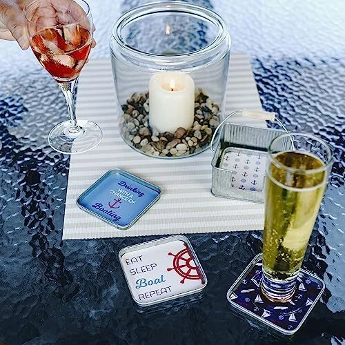 The Boat Set of 4 coasters includes coasters printed with boats, anchors and ship wheels, coaster says "Eat Sleep Boat Repeat," and the fourth coaster says "Drinking with a Chance of Boating." PREMIUM QUALITY: Set of four metal coasters lined with IN-HOUSE DESIGN: Each set of four coasters comes with a handy coaster carrier with a metal handle trimmed with wood for easy handling. Coasters are printed with four different sentiments to match the Livin the Life Boat theme. Notch in the front of the coaster holder makes it easy to remove and replace coasters. PERFECT GIFT: Great gift for the outdoor dad, beach friend , lake lovin, camp life brother or sister and pretty much anyone who enjoys the sun and outdoors! CARE INSTRUCTIONS: Avoid sunlight, wipe with cloth PERFECT GIFT: Great gift for the outdoor dad, beach friend , lake lovin, camp life brother or sister and pretty much anyone who enjoys the sun and outdoors!