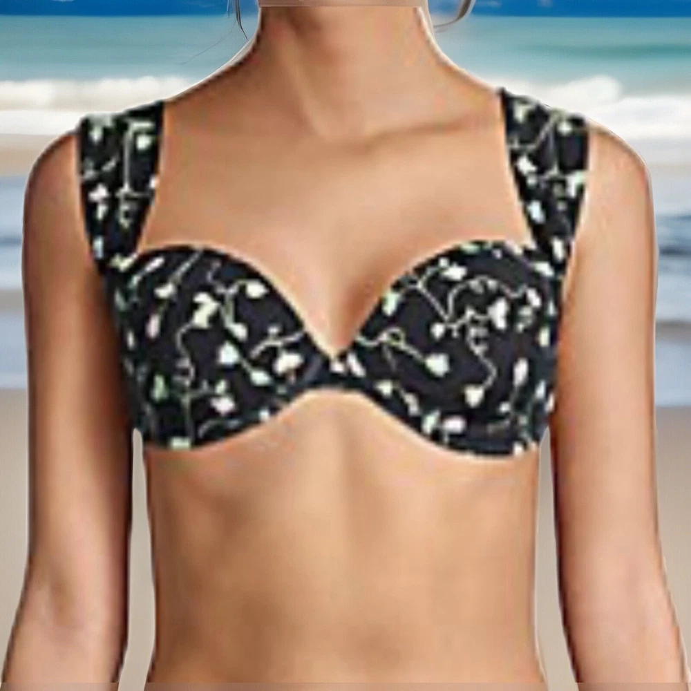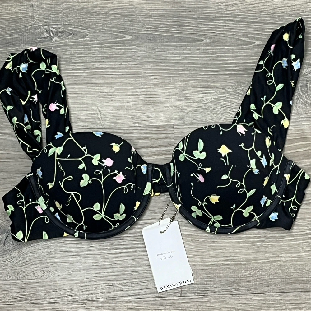 We Wore What Bikini Top XL Underwire Cups, Hook Back, Wide Pleated Shoulder Straps, Black Rose Bud Floral, Lightly Padded, Sweetheart Neckline, Stretch Strap Width 31” Nylon Spandex WeWoreWhat