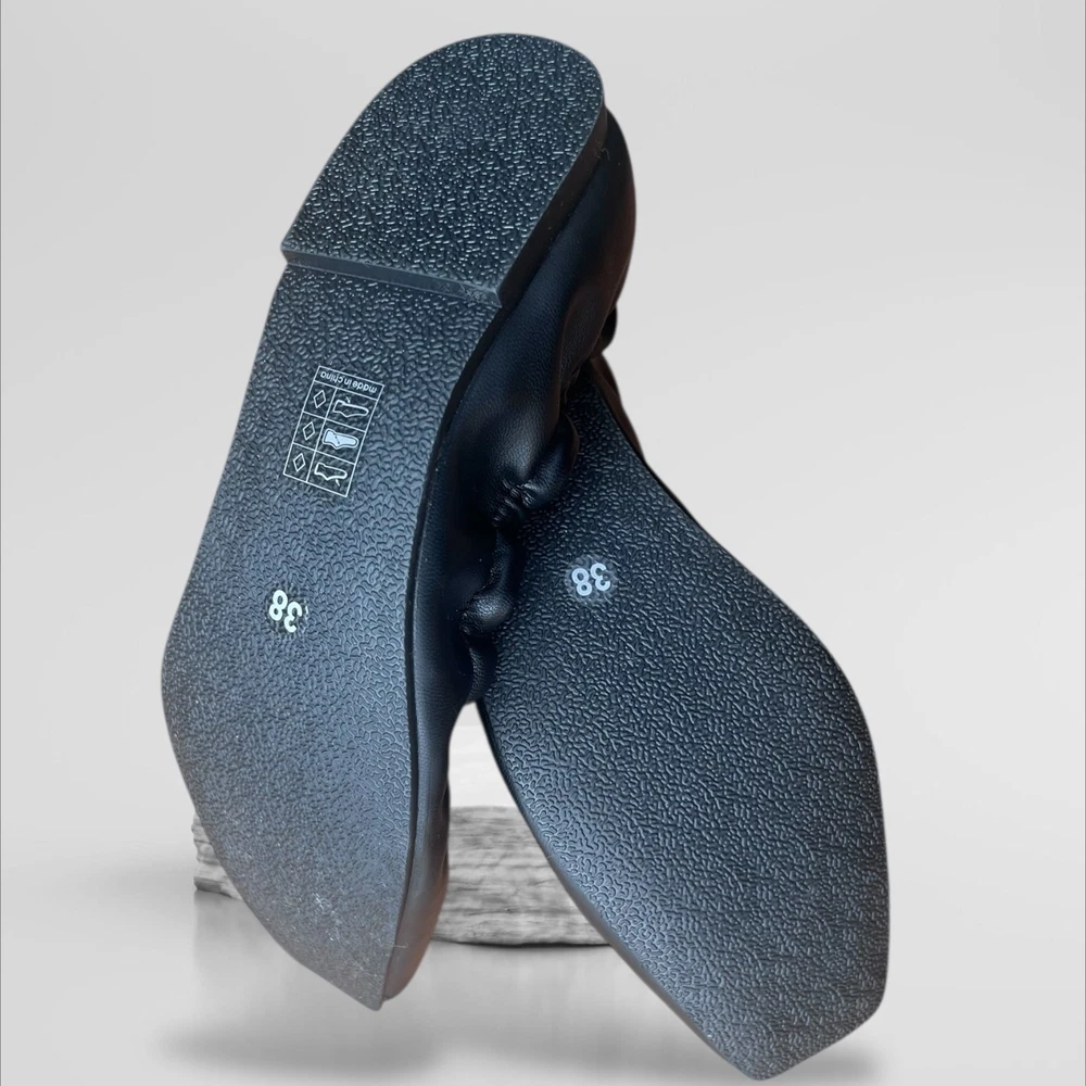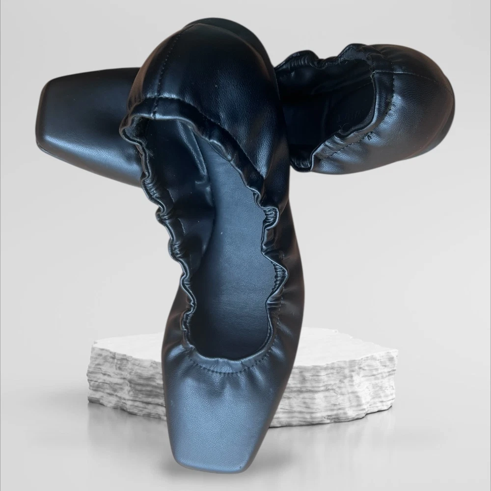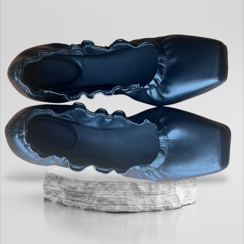 * - Elegant black leather ballet flats with a ruffled edge. Perfect for casual or formal wear. * - Chic black ballet flats by WeWoreWhat in size 38 US 7.5 - 8. * - Premium soft black leather upper with elegant ruffle trim detailing around the topline. * - On-trend square toe silhouette for a modern, sophisticated look. * - Cushioned insole provides all-day comfort. * - Durable rubber sole with textured grip for traction. * - Easy slip-on style. Perfect for the office, weekend errands, or travel. * - Never won - New without Tags - The shoes are in excellent condition. Designer quality at an amazing price!