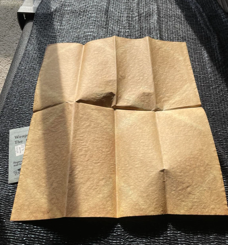 Reproduced on antiqued parchment that looks and feels authentically old. The envelope is blue (I have seen envelopes in other colors.) Old Villa Louis price sticker on face. Shows such weapons as Parrott rifle, Le Mat Revolver, minie balls and more.