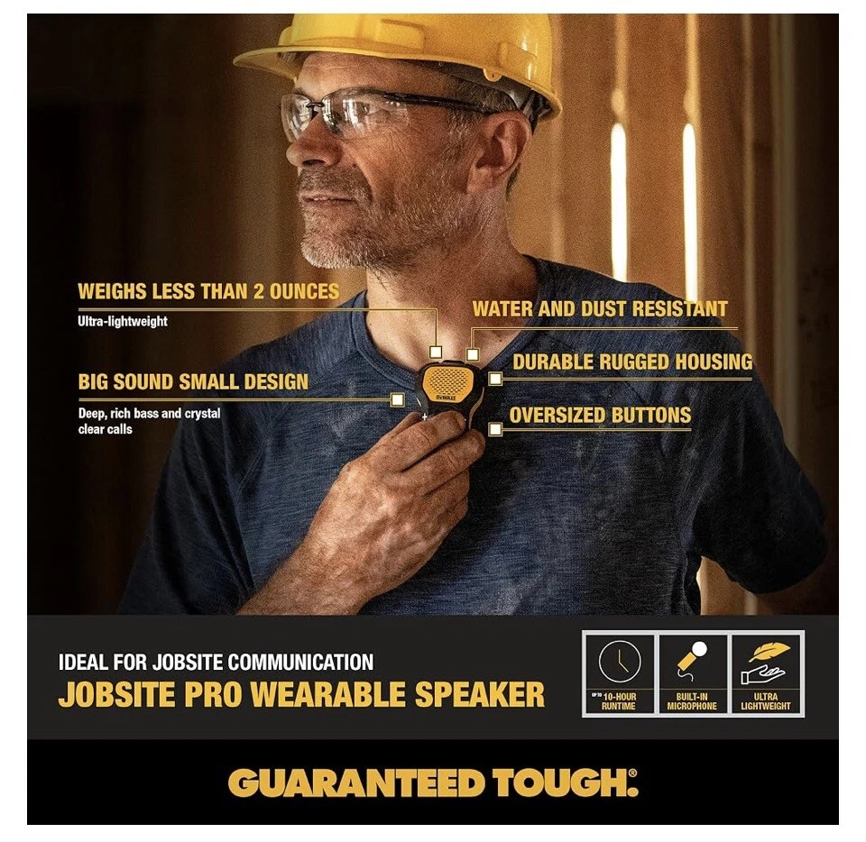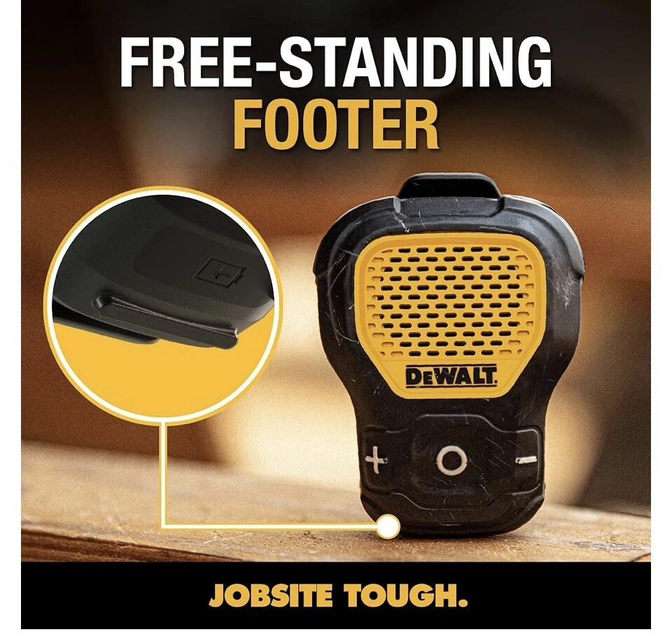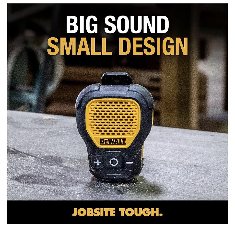 Small Speaker, Same Pro Audio Sound: This loud Bluetooth speaker plays music and takes calls with ease in a pocket-sized design, giving you huge sound from a small device Improved 4x Stronger Clip for Ultimate Durability: Easy-open clip for one-handed operation allows you to affix portable bluetooth speaker anywhere Ultra-Lightweight, You'll Forget You Have It On: Weighing less than 2 oz, this mini speaker makes the perfect add to your workday uniform or gardening attire Now Free-Standing with Added Footer: Provides increased stability and enhances the overall usability of this work speaker so you can sit it on a tool bench or ledge Protected Against Dust/Water: Outdoor speaker comes with a handy carry pouch and features an IP56 rating for dust and water resistance so it can go from part of your work accessories to your lake accessories in an instant