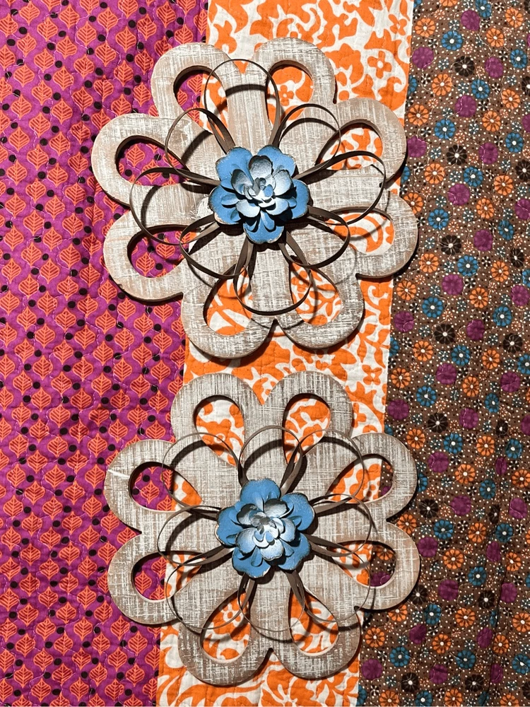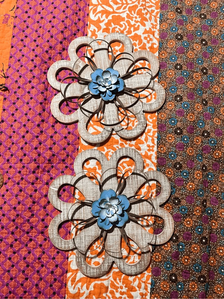 round loops, weathered wood, small metal petals, blue flowers white inside. 11" across the widest part. 11" tall. Really pretty with the wood, then having the light blue contrast. They look so pretty on your wall.
