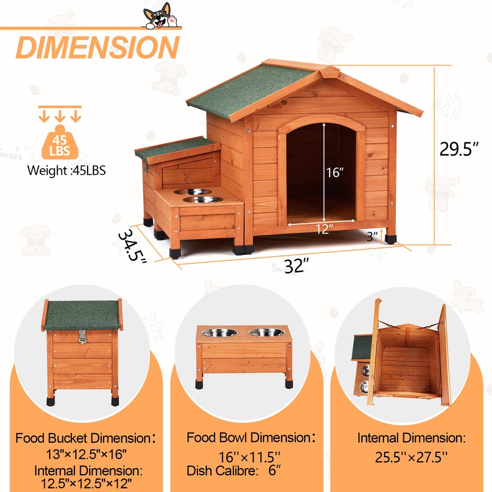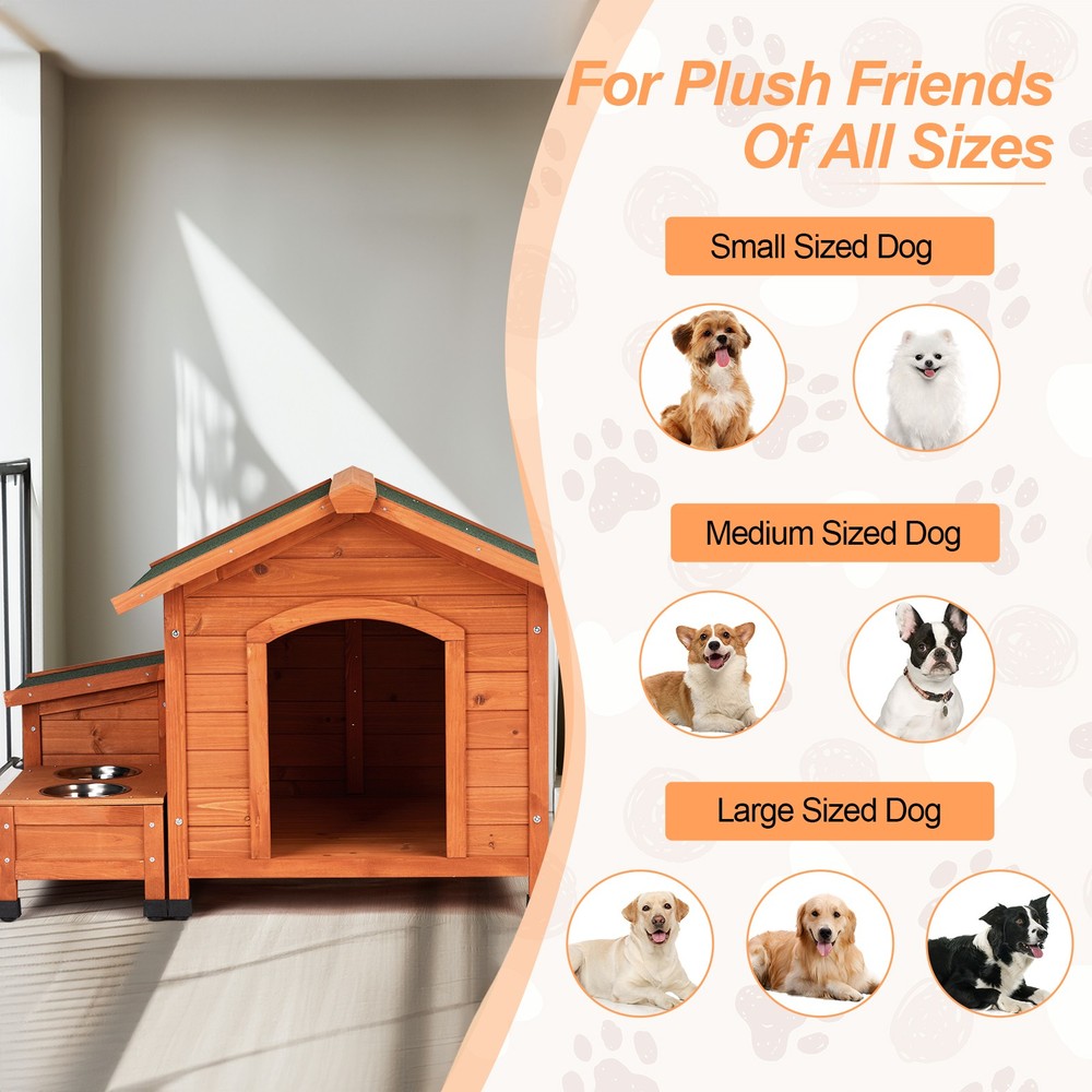 Outdoor Wooden Dog House with Asphalt Roof, Storage Box & 2 Bowls