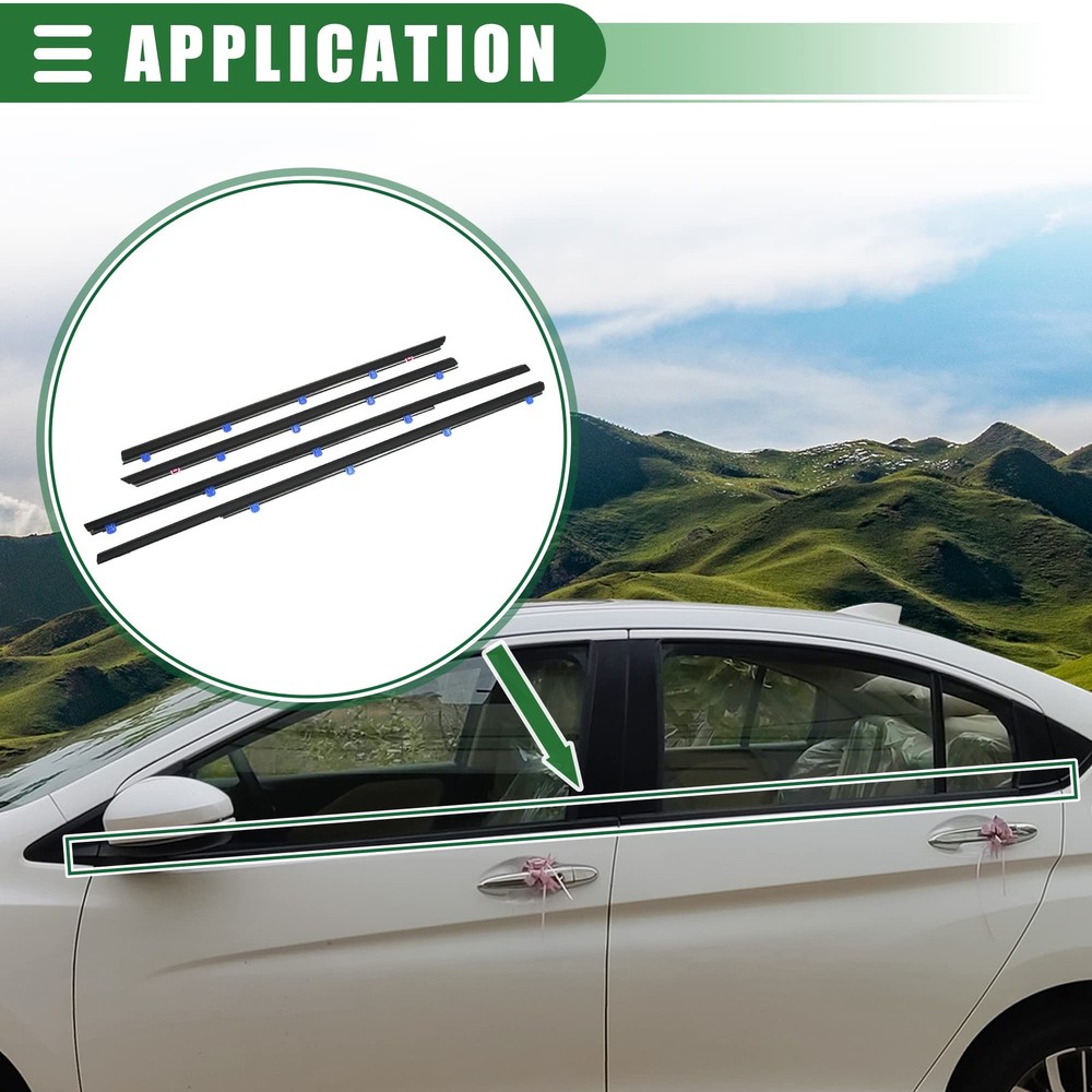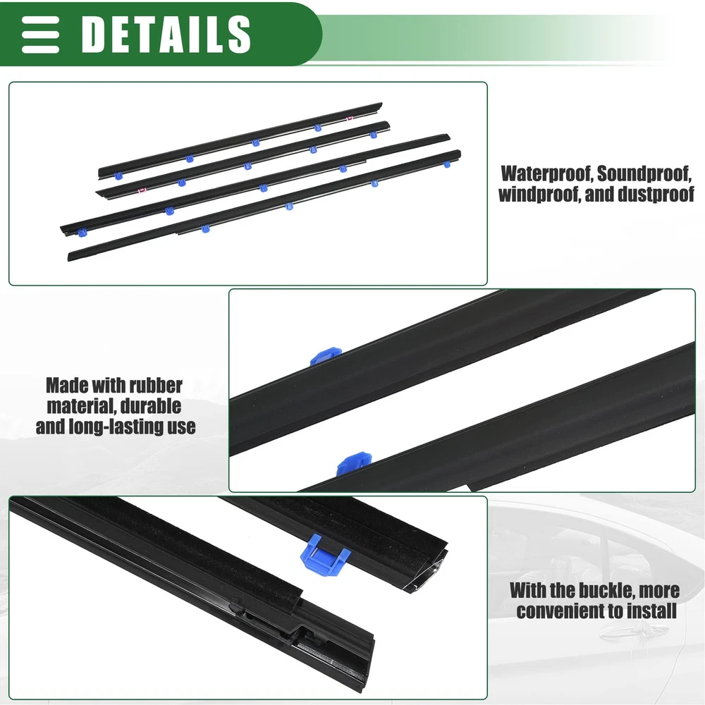 Vehicle Specific Fit: for Honda Civic 2012 4 Door DX, EX, EX-L, GX, HF, LX, LX (AT), MX (Hybrid), SI for Honda Civic 2013 4 Door EX, EX-L, GX, HF, LX, MX, MX (Hybrid), SI for Honda Civic 2014 4 Door EX, EX-L, GX, HF, LX, MX, MX (Hybrid), SI for Honda Civic 2015 4 Door EX, EX-L, GX, HF, LX, MX, MX (Hybrid), SI Product Details: OE Number: 72410TR0A01, 72450TR0A01, 72910TR0A01, 72950TR0A01 Color: Black Material: ABS, Rubber Placement on Vehicle: Front, Left, Rear, Right Front Window Weatherstrip Size: 81x3cm / 31.89"x1.18"(L*W) Rear Window Weatherstrip Size: 105x3cm / 41.34"x1.18"(L*W) Advantage: The window weatherstrip has well waterproof performance, which can effectively solve the problem of window leaking The window sealing belt can effectively solve the shaking sound of the window, and can also reduce the wind noise during high-speed driving, making the interior of the car quieter and more comfortable. Easy to install, directly install with the buckle Kindly Notes: This is non-OEM product, accessory ONLY! Please carefully check your vehicle model year to ensure you get the correct part. Please allow slight dimension differences due to different manual measurements. Package Content: 1 Set Window Weatherstrip (Front, Left, Rear, Right) Vehicle Specific Fit: Suitable for Honda Civic 2012, for Honda Civic 2013, for Honda Civic 2014, for Honda Civic 2015. Suitable for 4 door car, does not fit for 2 door car. Feature: Replacement for your broken door window belt. The door weather belts are made of rubber and plastic material, durable, and has good sealing performance, which is waterproof, soundproof, windproof, and dustproof. The window weatherstrip can effectively solve the problem of window leaking Product Characteristic: This window seal belt is durable, and scratch-resistant, which can effectively solve the shaking sound of the window, and can also reduce the wind noise during high-speed driving, isolate the road surface noise, making the car interior environment quieter and improve driving comfort. How to Install: Easy to install, directly install with buckle. 1. Remove the deformed weatherstrip and clean it. 2. Align all the buckle holes to install it. 3. The installation is complete What You Get: 1 Pc Front Left Window Trim Seal Belt, 1 Pc Front Right Window Trim Seal Belt, 1 Pc Rear Left Window Trim Seal Belt, 1 Pc Rear Right Window Trim Seal Belt