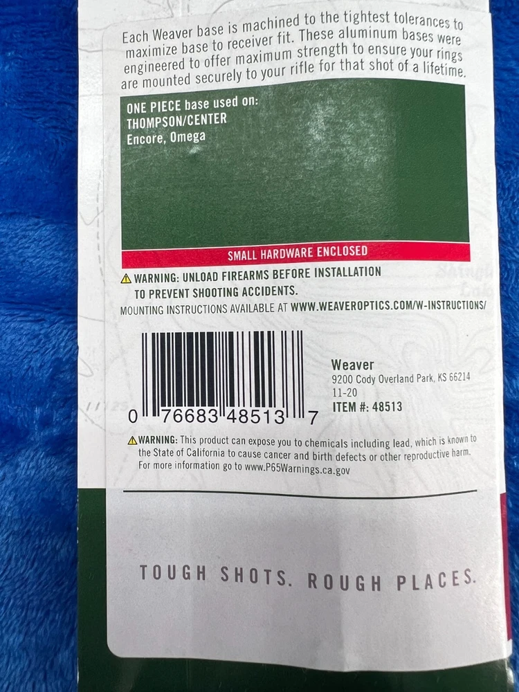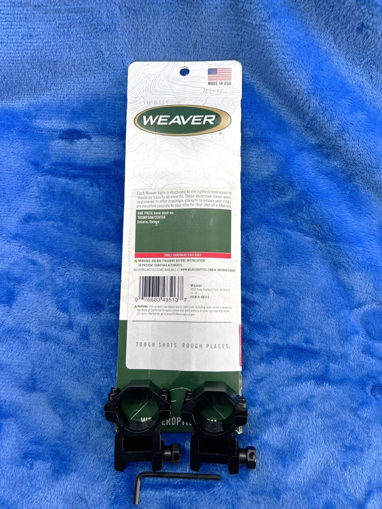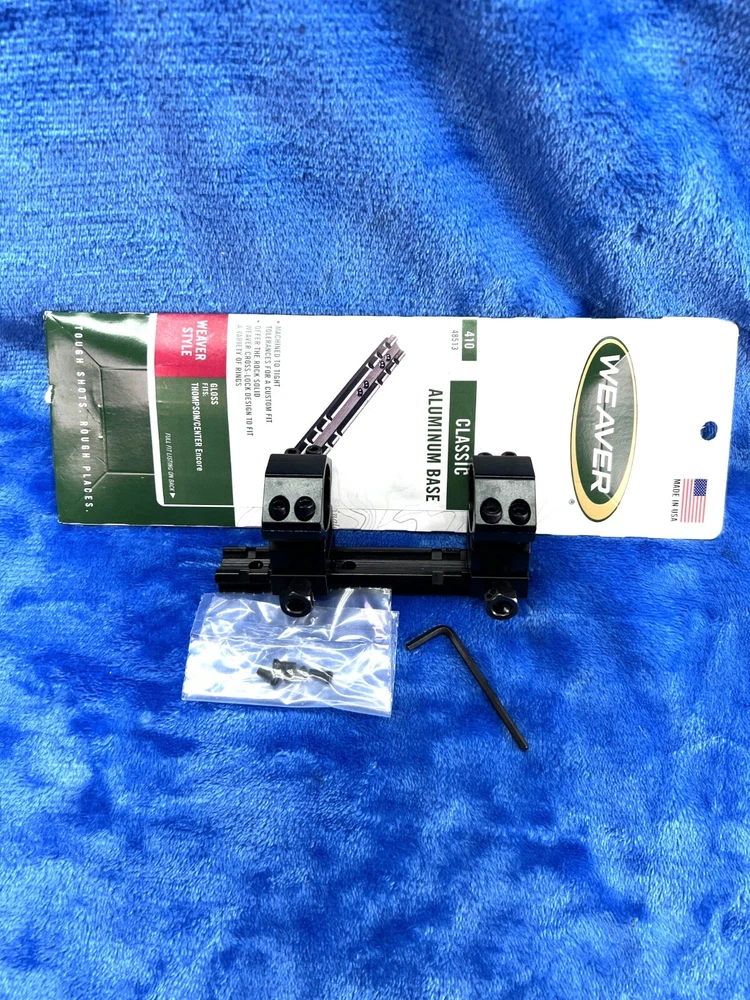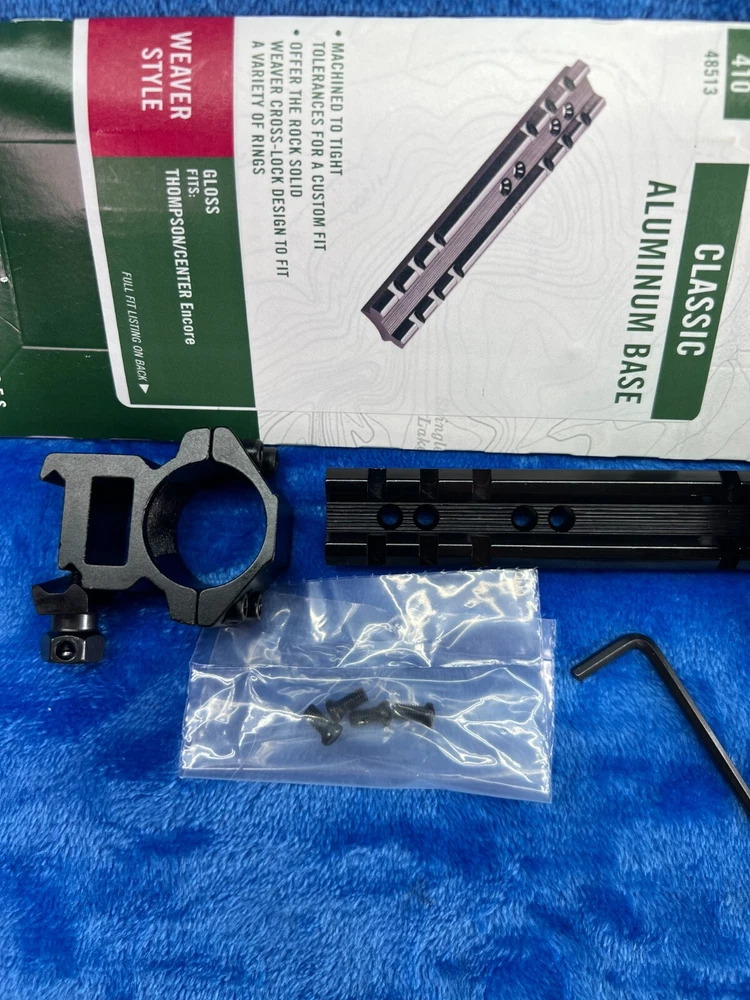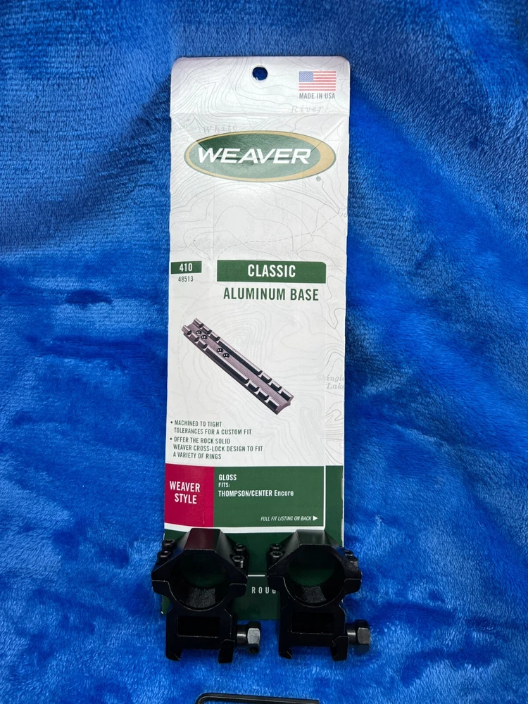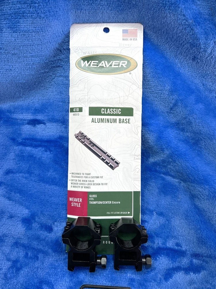 For Gun Make: Thompson Center Ring Height: Medium For Gun Type: Pistol, Rifle gtin13: 0076683485137 Type: Scope Bases Tube Diameter: 1 in Gauge/Caliber: Multiple MPN: 48513 Brand: Weaver Material: Aluminum Mounting: One-Piece Sport/Activity: Shooting Mounting Location: Barrel Country/Region of Manufacture: United States UPC: 0076683485137 Model: 410 Color: Black