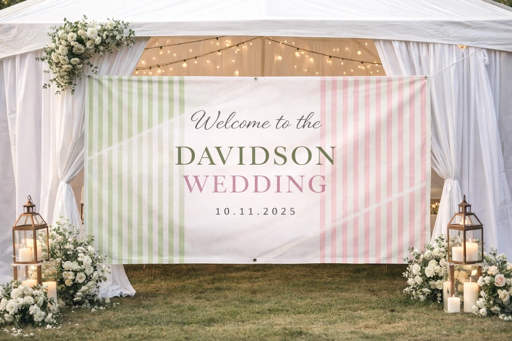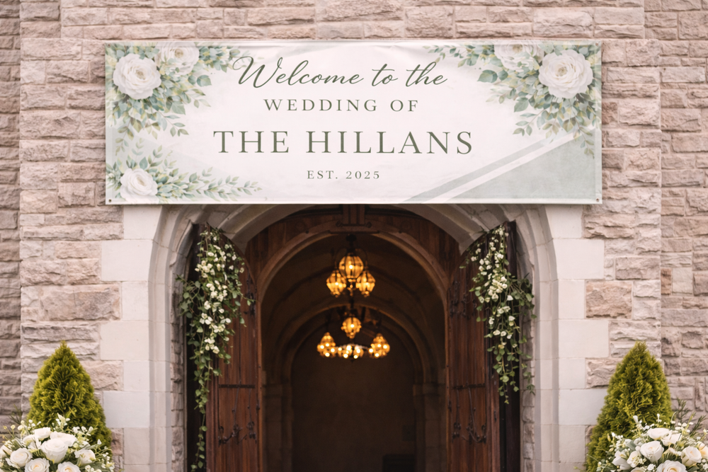 Custom Wedding Banner – Indoor or Outdoor Use Personalized • Elegant • Fully Customizable Create a beautiful statement for your wedding day with a custom wedding banner designed to welcome your guests and elevate your décor. Whether displayed at a ceremony entrance, behind the sweetheart table, or at the reception, our banners are made to look stunning both in photos and in person . Choose the perfect material for your venue — smooth solid vinyl for indoor weddings or wind-resistant mesh for outdoor celebrations . ✨ Material Options Solid Vinyl Banner (Indoor Use) Smooth, opaque vinyl with a clean, polished finish Best for indoor venues, ballrooms, churches, and reception halls Vibrant full-color printing with crisp detail Mesh Banner (Outdoor Use) 10 oz wind-resistant mesh material Allows airflow to reduce movement in outdoor settings Ideal for barns, gardens, tents, vineyards, beaches, and courtyards ✔ Both options are full-color UV printed , waterproof, and durable ✔ Hemming and grommets included for easy hanging 📐 Available Sizes 3’ x 6’ 3’ x 8’ 4’ x 8’ 4’ x 10’ 5’ x 10’ 5’ x 12’ Need a custom size? Just send us a message — we’re happy to help. 💍 Perfect For Wedding ceremony entrances Church or chapel entryways Reception entrances Behind the sweetheart or head table Wedding tent entrances Barn, garden, or outdoor weddings Photo booth or backdrop displays Wedding planners & styled shoots We’ll match the design to your wedding style — modern, rustic, boho, classic, or elegant . 🛒 How to Order Select your size and material Complete checkout Send us your names, date, and any design preferences We’ll create a beautiful layout and provide a mock up 🤍 Why Couples Love Our Banners Indoor & outdoor material options No setup or design fees High-quality printing and finishing Easy to hang at multiple locations A keepsake you can reuse or display at home Wedding planners & bulk orders welcome — message us for custom quotes.