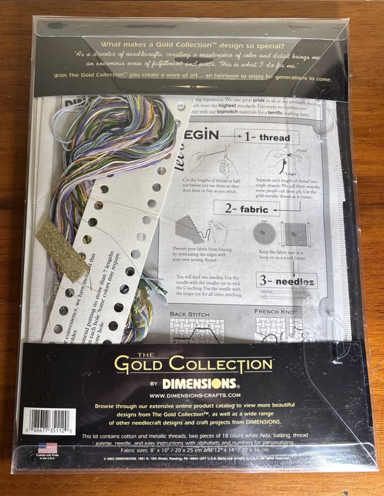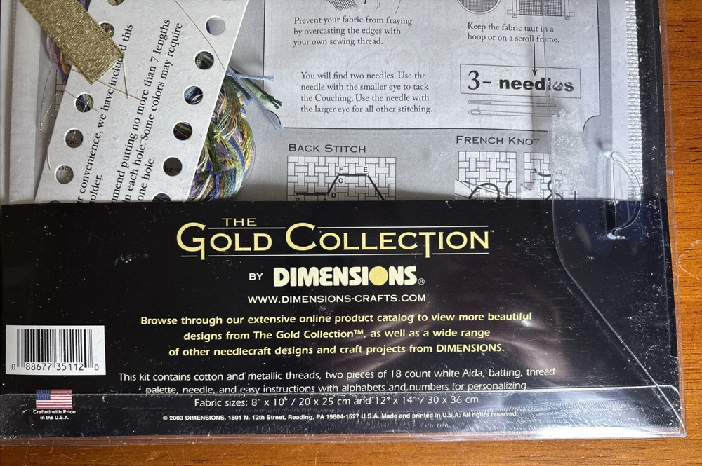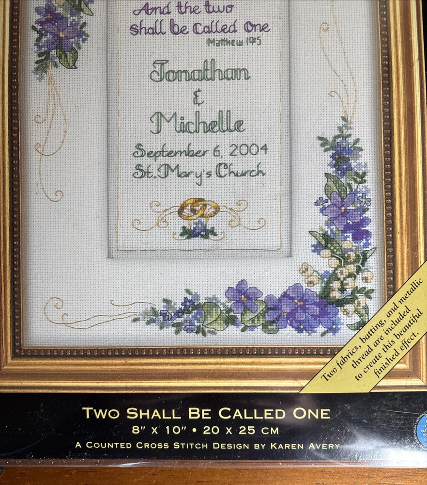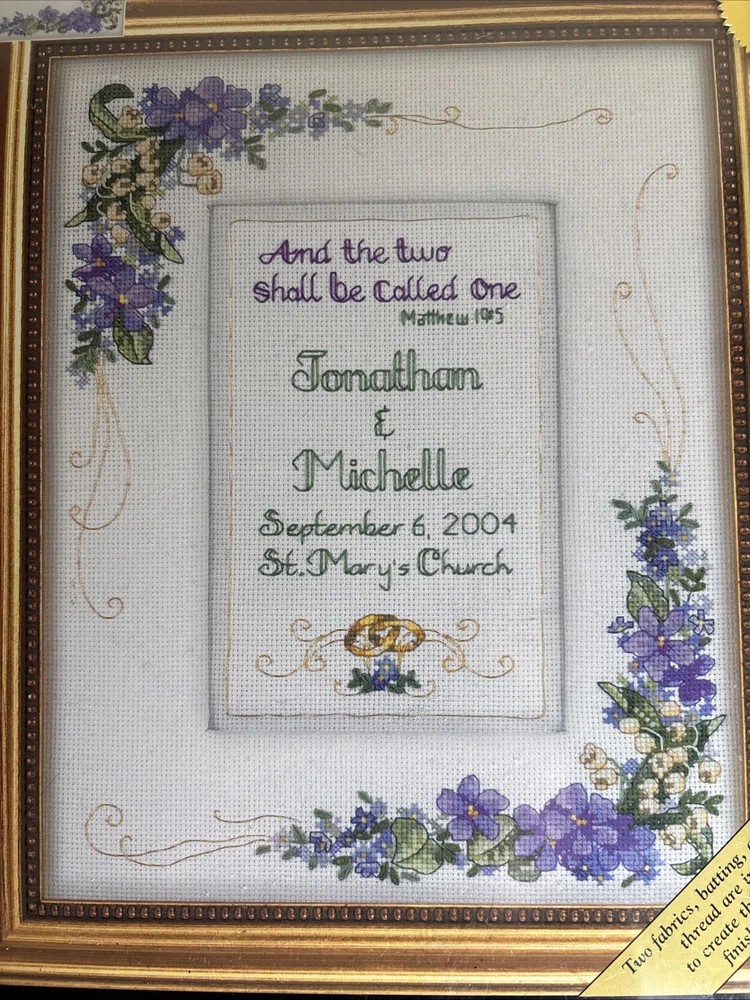 Dimensions Gold Nugget Cross Stitch Kit Two Shall Be One 8x10 Wedding 35112 This kit is complete. Comes with cotton and metallic threads, 2 pcs of 18ct white Aida, batting, thread palette, needle and easy instructions w alphabets and numbers for personalizing. Kit is unsealed but contents are untouched. Wedding season is coming up! Just in time to get started on the beautiful heirloom project. Please see photos. Thank you for looking!