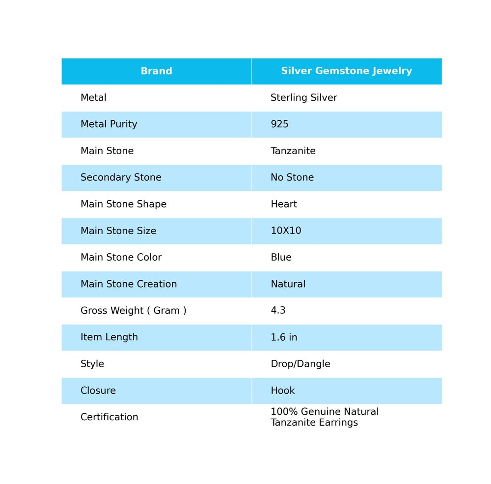 Welcome to Jaipur Silver Gallery Wedding Gift For Her 925 Silver Natural Tanzanite Gemstone Drop/Dangle Earrings Handmade Earrings, Sterling Silver Earrings, Tanzanite Earrings, Handcrafted Earrings SKU : - GSE-76 Gemstone : - Tanzanite Stone Shape : - Heart Metal : - Sterling Silver Metal Purity : - 925 Earring Length : 1.6 Inches Earring Width : Inches _______________________________________________________________________________________ Amazing Properties of Silver ****************************** Tough and Long-lasting: Silver is incredibly strong, built to withstand daily wear and tear as well as tough environmental conditions. Easy to Shape and Design: Silver is like clay for skilled craftsmen, allowing them to create beautiful and intricate designs effortlessly. Great at Conducting Energy: When it comes to heat and electricity, silver is the go-to. It can quickly and efficiently transfer energy, making it ideal for various applications. Keeps Things Clean and Safe: Silver has a natural ability to keep harmful bacteria at bay, making it a reliable choice for promoting cleanliness and well-being. 3 Underrated Benefits Of Silver ****************************** Gorgeous Charm: Silver jewelry shines brightly, enhancing any outfit and fitting everyone's style with ease. Gentle on Skin: Silver is kind to your skin, reducing the chance of allergies and making it a favorite choice for accessories. Healing Vibes: Some believe silver jewelry has a soothing touch, possibly aiding in easing issues like arthritis, anxiety, and the blues. _______________________________________________________________________________________ For Mother's Day Gift For Father's Day Gift For Promise For Valentine' Day For Halloween Party For Christmas Day Gift For New Year Party For Mom For Her _______________________________________________________________________________________ If you need more help or want design tips, just give us a shout! We're lightning-fast in getting back to you. Every single thing we create is made by hand in our special workshop, and we put a whole lot of love and care into every piece. Thank you for stopping by! We're confident you'll have an amazing time shopping with us. We're here to make sure every moment you spend with us is filled with delight and satisfaction. Happy shopping!