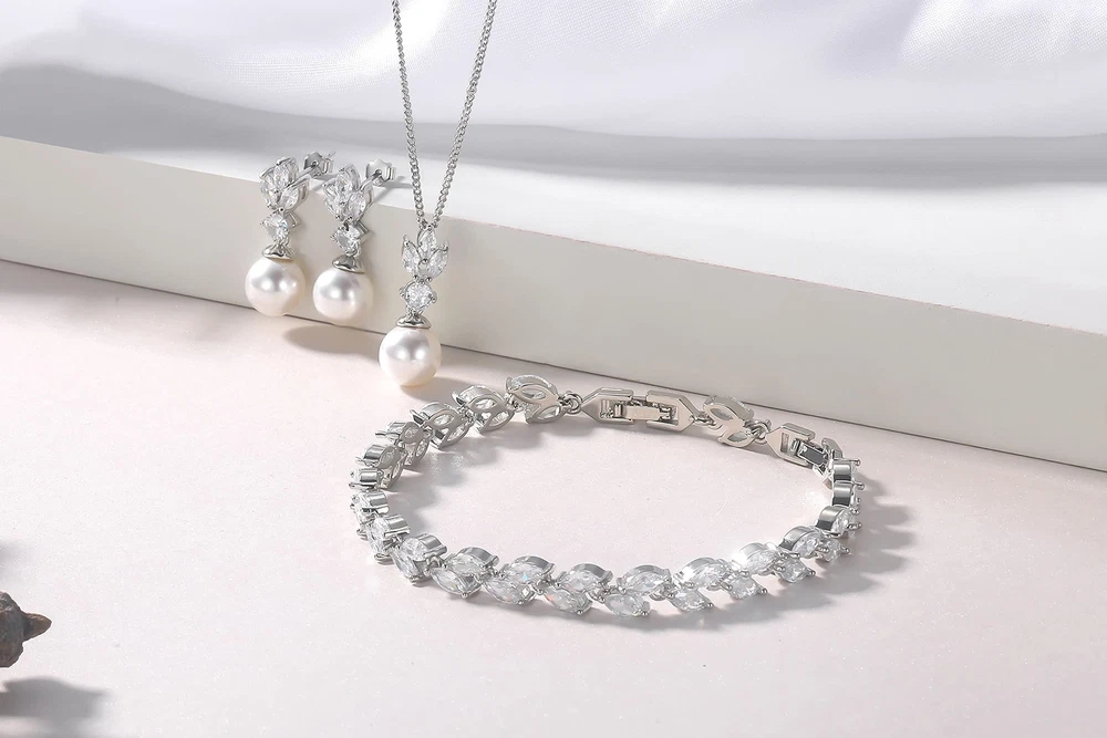 Wedding Jewelry for Bride Bridesmaid, Pearl Dangle Earrings and Pendant Necklace Set Bridal Jewelry for Promise Wedding Party Product Details Color: 1#Silver-1 Set-Necklace/Bracelet/Earrings Brand: IDASANY MPN: Does not apply UPC: Does not apply EAN: Does not apply Department : womens Date First Available : July 20, 2021 Manufacturer : IDASANY Brand, Seller, or Collection Name: IDASANY Metal stamp: 14k Metal: metal Material: 14K White Gold Gem Type: Cubic Zirconia Clasp: Buckle Clasp Number of stones: 25