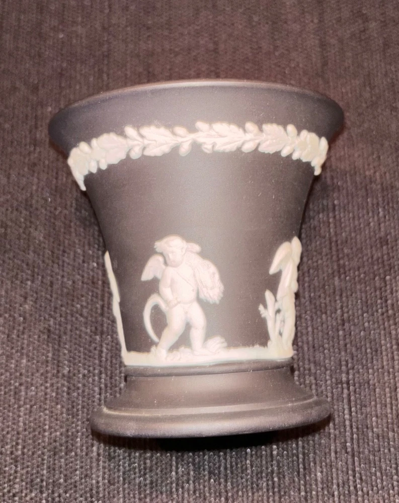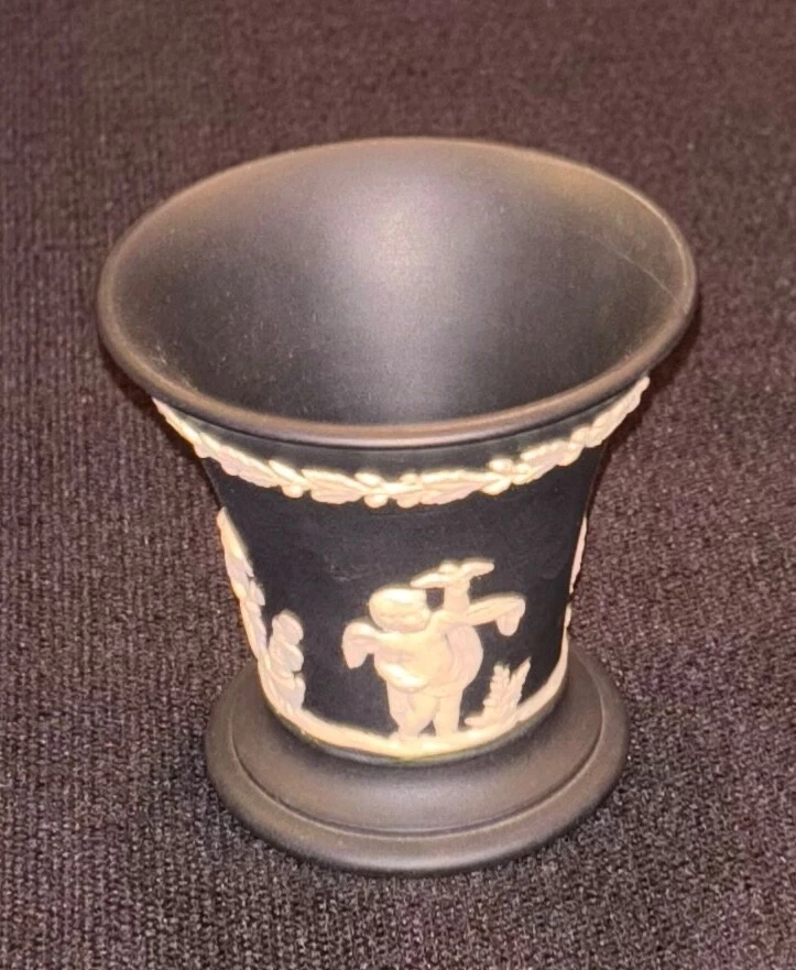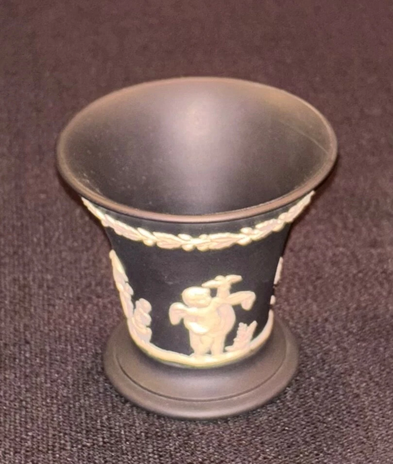 Wedgwood Black Basalt Jasperware Vase Cup Tumbler Cigarette Holder, Made in England. About 3 1/4" high x 3 1/4" wide, nice condition, no chips or cracks. 100% of sales benefit charity, thank you for supporting our cause!