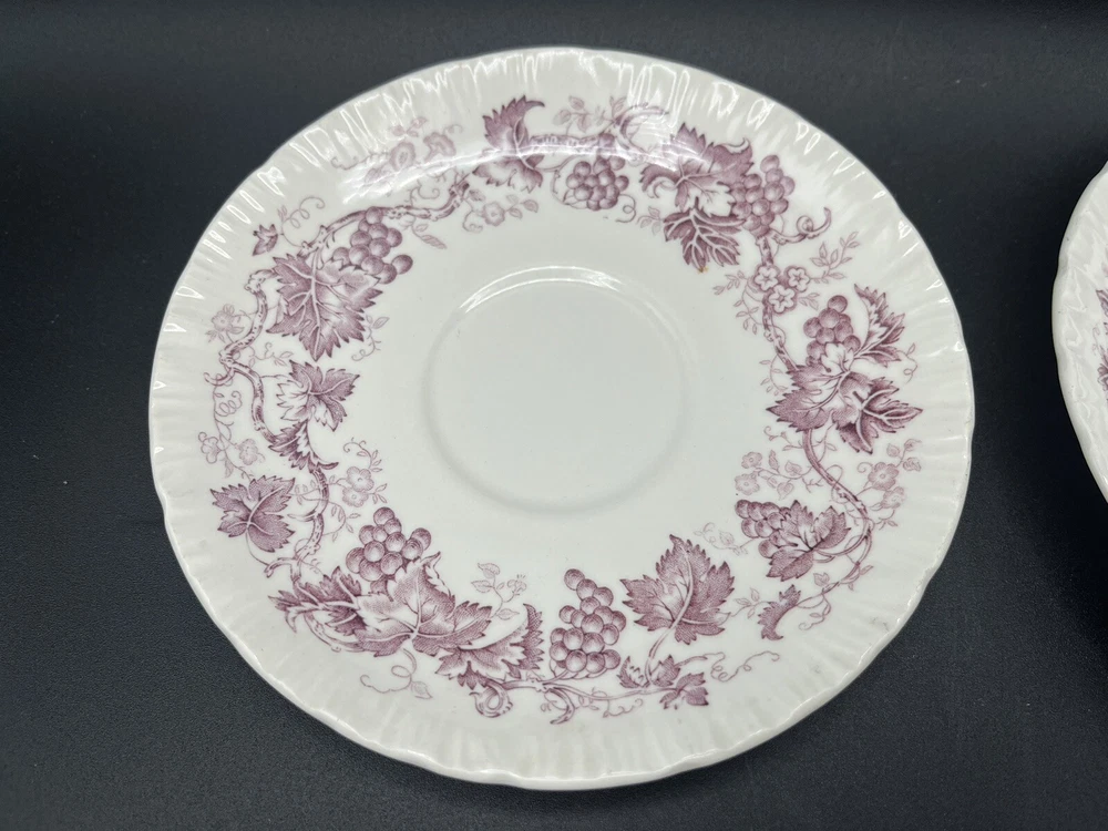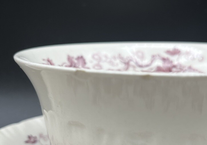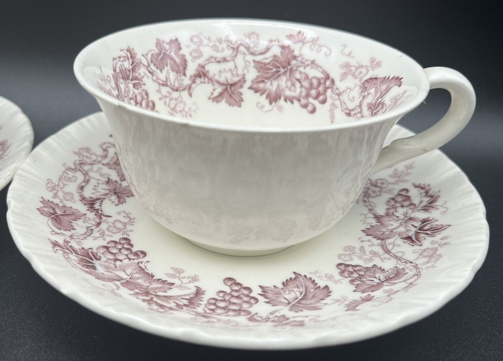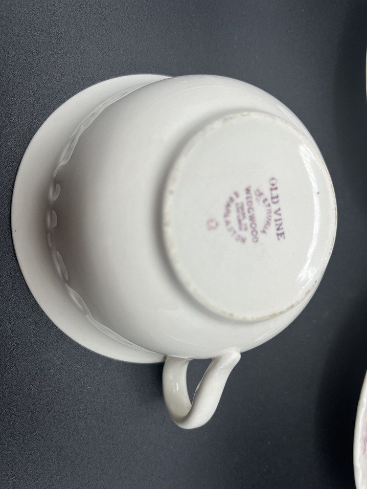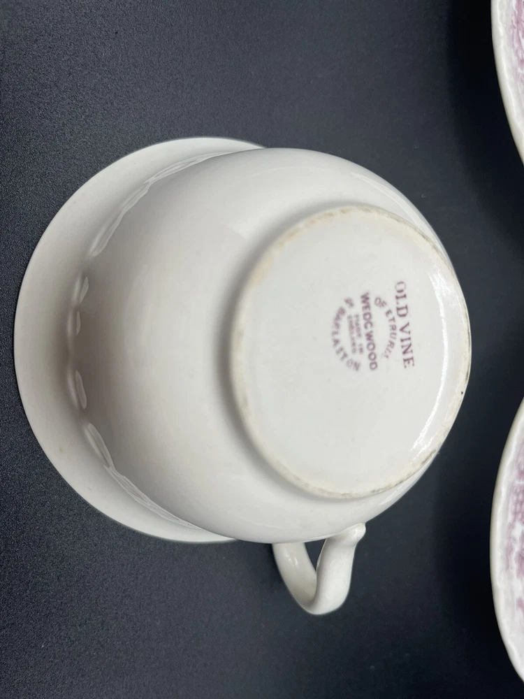 This beautiful tea cup and saucer set from Wedgwood's Old Vine collection is a must-have for any vintage china enthusiast. The intricate purple transferware design on the bone china material is sure to impress. The set includes a cup and saucer, both of which feature the Old Vine pattern. Crafted in England in 1950, this original set is a rare find and is perfect for all occasions. The production technique of pottery and the printed backstamp add to the unique value of this piece. Add a touch of sophistication to your tea time with this stunning Wedgwood tea cup and saucer set. One cup and one saucer have chipping as shown.