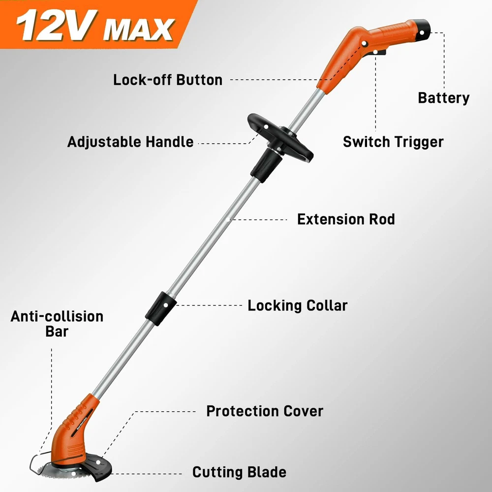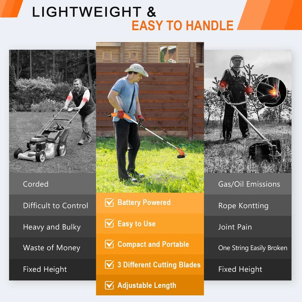 ✅Finest Brand After-Sales Service: We support 1-year machine to ensure you have the best experience, just buy with confidence. If you have any issues when using the electric weed trimmer, please us, we will give you a satisfactory solution. ✅Lightweight, Low Noise & Easy to use: weed wacker weighs only 3.7lbs, making it carry anywhere. Grass trimmer cordless is easy to operate, length and handle can be adjusted, women and the elderly can easily use this grass cutter for weeding work. You can enjoy patio mowing time! ✅3-in-1 Multifunctional Blades: Circular saw blade for pruning thicker shrubs and branches. Metal blades for cutting thick weeds and small shrubs. Plastic blades for mowing soft grass. Cordless weed trimmer is perfect weeding tool for yard, garden, walkways and patios. ✅High-Efficiency Battery Powered: This electric grass mower include 2.0Ah battery and fast charger that can provide super use life, so you can trim more weeds in yard. Quieter, safer, more environmentally friendly and portable than gas or corded string trimmer, you can saves resources and money. ✅Safety Design & More Reliable: Our cordless grass edger has passed the professional design and safety test. Double-switch safety lock function, which can effectively avoid the danger caused by accidental activation. The anti-collision metal pole can protection flowers or ornamental plants while weeding. ✅Excellent Helper for Garden Care: This power lawn trimmer is equipped with a high-performance motor, max speed 10,000rpm. Metal blades can cover 99% of usage scenarios, it will save you 30% of work time and energy, you can weed the garden more easily. ✅Note: Fully charged the battery before the first usage to provide better user experience. Children under the age of 16 are not allowed to use metal blades. Please make sure to tighten the nuts holding the blade and install the entire machine correctly before starting the trimmer. The safety lock can be released after the machine is running.