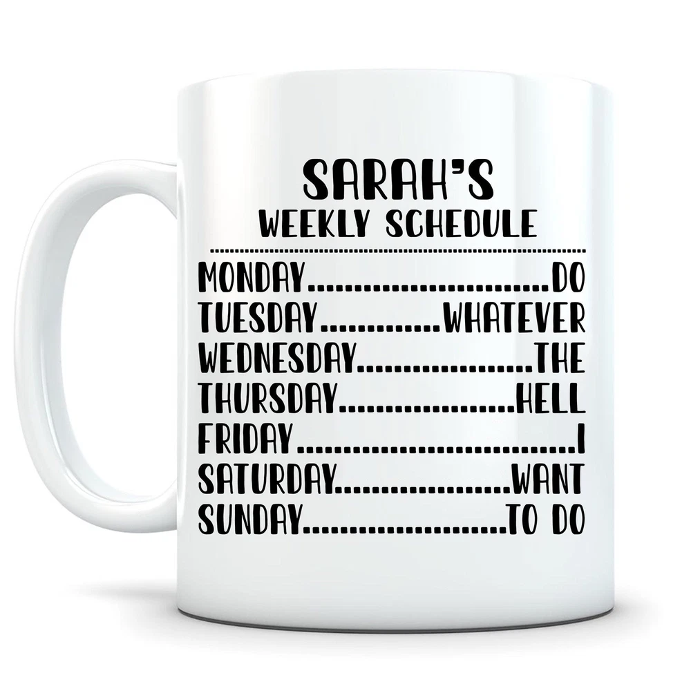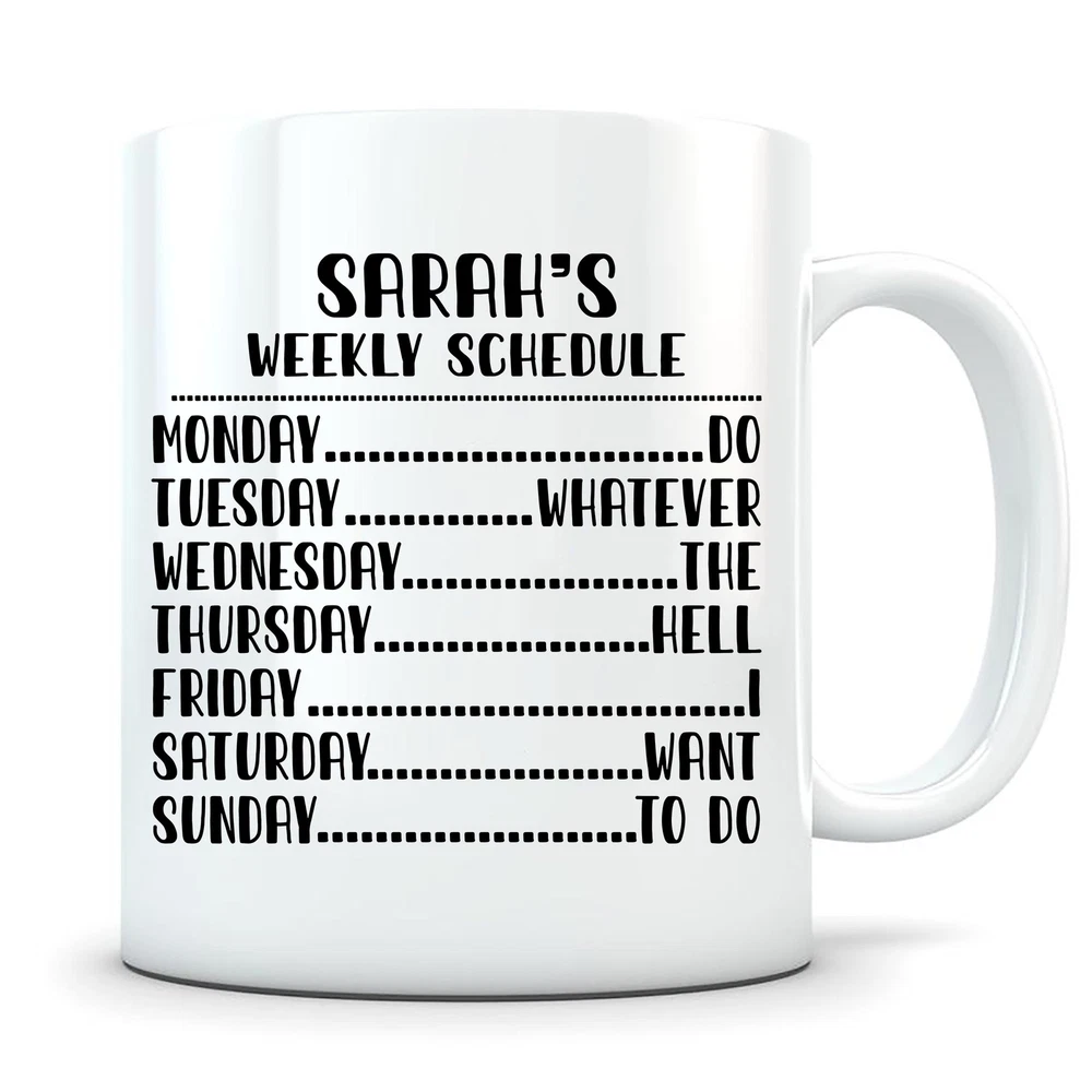 Weekly Schedule Mug Funny Retirement Mug Happy Retirement Mug Retirement Gift Product Details.. This high quality 11oz. ceramic white mug has a premium hard coat that provides crisp and vibrant color reproduction sure to last for years. Perfect for all hot & cold beverages. The highest quality printing possible is used. It will never fade no matter how many times you wash it. Material: 100% Ceramic. Print both sides. Dishwasher and Microwave Safe. High Gloss + Premium White Finish. Printed in the U.S.A. Personalized & Custom. We support personalized and custom mug to add custom, when placing an order, you can add notes to the "order note" in shipping address section. Also you can contact us directly via message. Shipping Info. Ready to ship in 1 to 2 business days, All products are made-to-order and proudly printed in the United States. Shipped by USPS and DHL, You will receive your order in 5-7 days. Replace & Refund. All products are defective during shipping broken, chipped will be replaced free of charge. You are not satisfied with the product, we will refund 100% money to you. If any other issues arise, please do not hesitate to message, we would be more than happy to assist you.