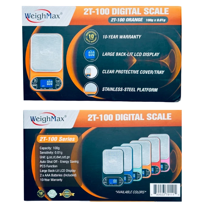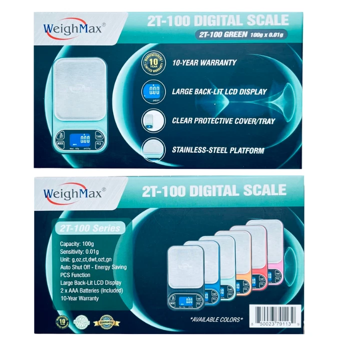 WEIGHMAX 2T-100 X 0.01G LED DIGITAL SCALE – PRECISION AND PORTABILITY The Weighmax 2T-100 Digital Scale is a reliable, compact solution for your precise weighing needs. With a capacity of 100 grams and sensitivity of 0.01 grams , this scale is perfect for measuring jewelry, ingredients, or other small items. Its TARE function , energy-saving auto shut-off , and easy calibration mode ensure convenience and accuracy every time. KEY FEATURES High Precision and Capacity: Measures up to 100 grams with an accuracy of 0.01 grams , making it ideal for precision tasks. Multiple Unit Conversions: Easily switch between grams (g) , ounces (oz) , carats (ct) , and pennyweight (dwt) to fit your specific needs. TARE Function for Convenience: Weigh items in containers or subtract the weight of packaging with ease using the TARE function. Large Backlit LCD Display: Provides clear, easy-to-read measurements, even in low-light settings. Energy-Saving Auto Shut-Off: Automatically powers down after a period of inactivity to conserve battery life. Easy Calibration Mode: Simple calibration ensures the scale delivers consistent and accurate readings over time. Portable and Durable: Lightweight and compact design makes it easy to carry and store, without compromising durability. SPECIFICATIONS Feature Details Capacity 100 grams Readability 0.01 grams Weighing Units g, oz, ct, dwt TARE Function Yes Display Large Backlit LCD Auto Shut-Off Yes (energy-saving feature) Calibration Easy Calibration Mode Power Source 2 AAA batteries (included) WHAT’S INCLUDED IN THE BOX? Weighmax 2T-100 Digital Scale 2 AAA Batteries User Manual WHY CHOOSE THE WEIGHMAX 2T-100 X 0.01G DIGITAL SCALE? Unmatched Precision: With 0.01g sensitivity , it’s perfect for precision tasks. Versatile Unit Conversions: Switch easily between grams, ounces, carats, and pennyweight. Compact and Lightweight Design: Portable enough to carry anywhere. Energy-Efficient: Auto shut-off extends battery life for long-lasting use. User-Friendly: The TARE function and easy calibration make it ideal for all skill levels. The Weighmax 2T-100 X 0.01G LED Digital Scale is a reliable tool for professionals and hobbyists alike. Whether for home use, jewelry making, or crafting, this scale ensures accuracy and ease of use in every application.