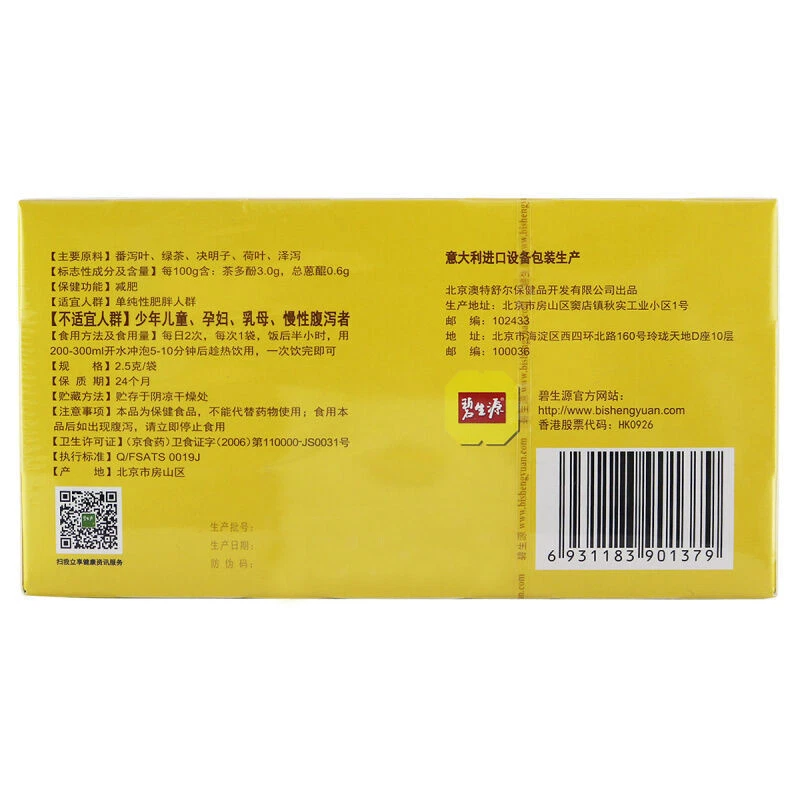 Origin: China Net Weight: 62.5g (2.2 oz) 2.5g x 25 bags Shipping Weight: 110g Type: Tea Bag Packaging: Box Manufacture: BESUNYEN Rating: Description: Besunyen Slimming Tea is made from extracts from green tea and traditional Chinese medicinal herbs that can help slim, with a high concentration of tea polyphenols and flavones. The therapeutic tea formula is consisted of the ingredients that work together to speed up metabolism, facilitating breakdown of fat. The tea is a herbal formula that does not contain any medicines. While reducing weight, it helps tone and improve the body. The metabolism normally not rebounds. The Bishengyuan slimming tea effectively removes the intestinal fat oil, accumulated stool, toxins and other harmful substances which fat causing materials. It help you to extract the oil that day to eat. And the anti-fat material resolve stubborn fat cells, making them transformed into energy consumed. Brewing Guide: Take 2 bags each time, twice a day.