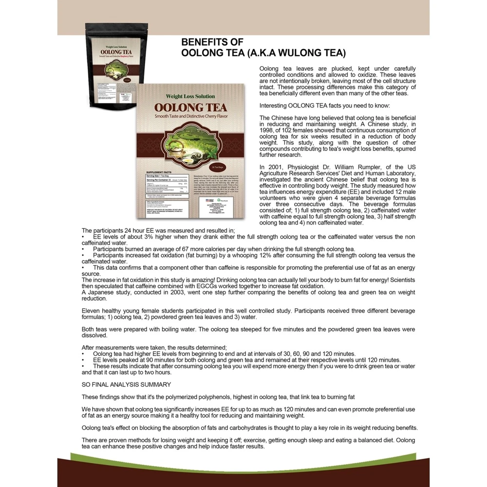 Keep your health goals within reach with this oolong slimming tea by Totally Products. Stay energized as you burn fat with the help of this smooth-tasting raspberry tea. \nFeatures: \nEE levels of about 3 percent higher\nParticipants burned and average of 67 more calories\nParticipants increased fat oxidation by 12 percent\n\nAdditional Information:\nOolong tea leaves are plucked, kept under carefully controlled conditions and allowed to oxidize. These leaves are not intentionally broken, leaving most of the cell structure intact. These processing differences make this category of tea beneficially different even than many of the other teas. The Chinese have long believed that oolong tea is beneficial in reducing and main OpenSky on eBay Our eBay Store About Us Contact Us Weight Loss Solution Oolong Wulong Raspberry Slimming Tea (30 tea bags)
