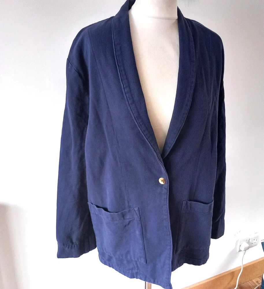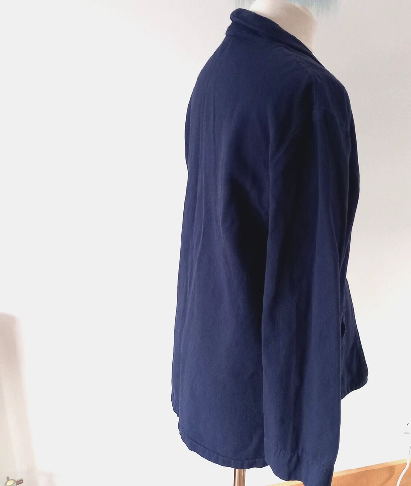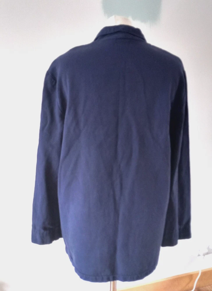 Gently used condition with no faults found. Boxy chore jacket. 100% cotton. Measures 23" pit to pit so meant to be oversized, 21" across waist area approx, length nape to hem 30". Made in USA.
