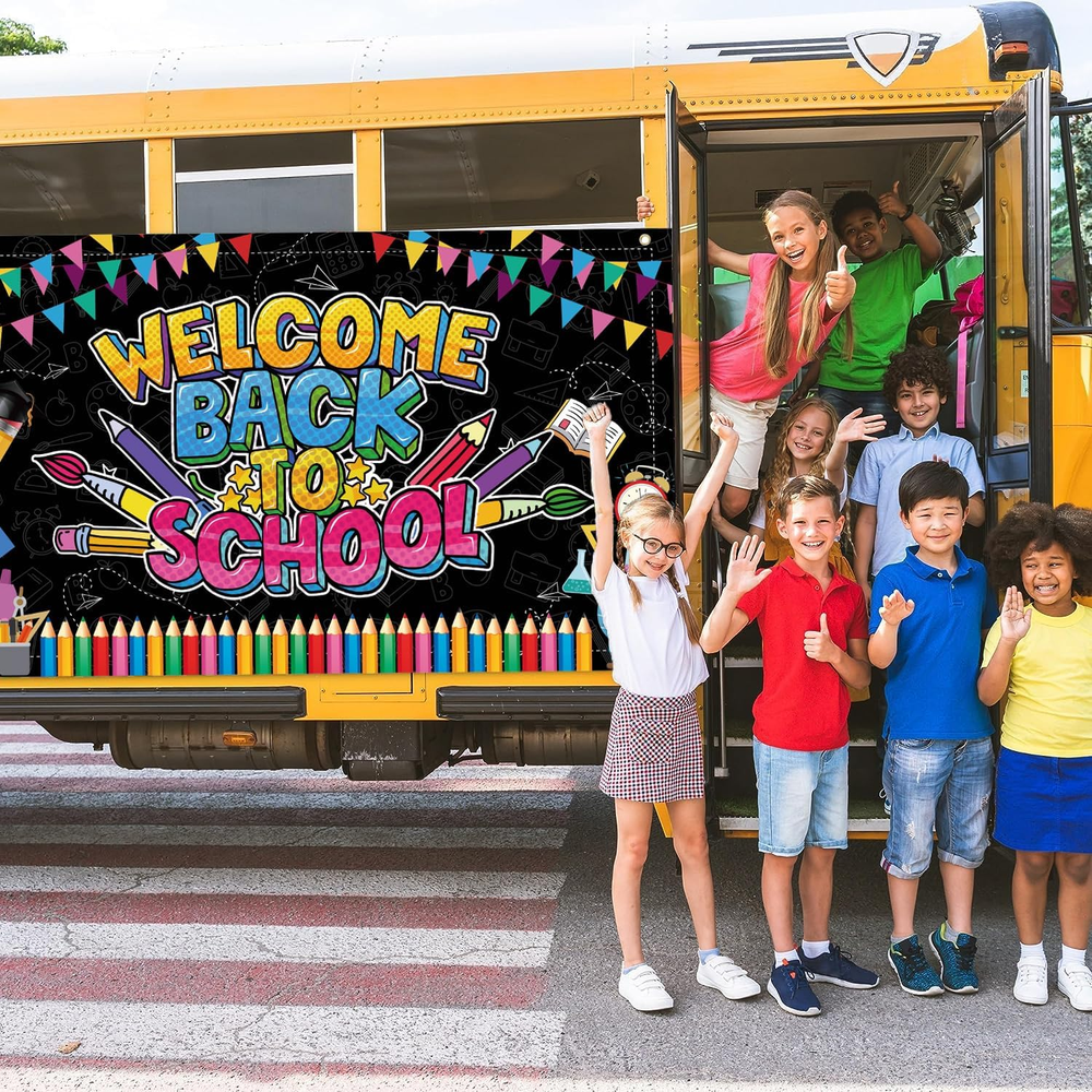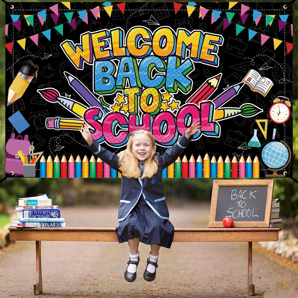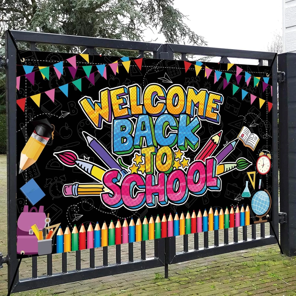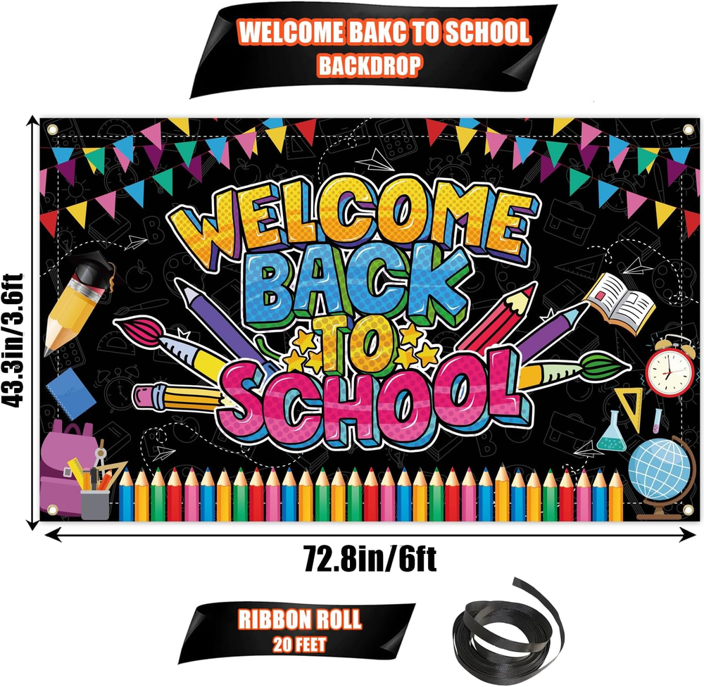 【Back To School Decorations】includes 1pcs large Welcome Back To School Backdrop with a 20ft ribbon, the backdrop is designed with many school elements and the WELCOME BACK TO SCHOOL slogan is very eye-catching with bright colors, bring highlights to your party 【Large Size】Back To School backdrop size is 72 x 43 inch (6 x 3.6ft), can be applied as party wall decoration, blackboard, outdoor, indoor, school bus, courtyard garage door decoration, photo backdrop and signature wall, great for First Day of School decorations 【High Quality】Welcome Back To School banner Made of high-quality polyester fiber so that the backdrop cloth colorful, clear patterns, odorless, firm and not easy to be torn, waterproof, both indoors and outdoors used 【Easy to install】The four corners of the First Day of School banner have holes made using brass,we are equipped with a 20ft ribbon, you can use ribbon to hang a backdrop or use tape to stick it directly where you want it 【Perfect service】Contact us if you have any problems about the Back To School Party Decorations, we will try our best to solve the problem, eliminate all your worries about getting this Welcome Back To School Backdrop Back To School Decorations: includes 1pcs large Welcome Back To School Backdrop with a 20ft ribbon, the backdrop is designed with many school elements and the WELCOME BACK TO SCHOOL slogan is very eye-catching with bright colors, bring highlights to your party.