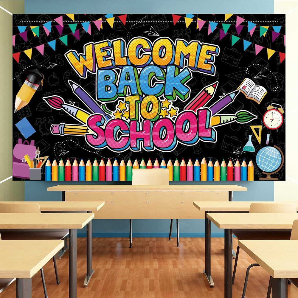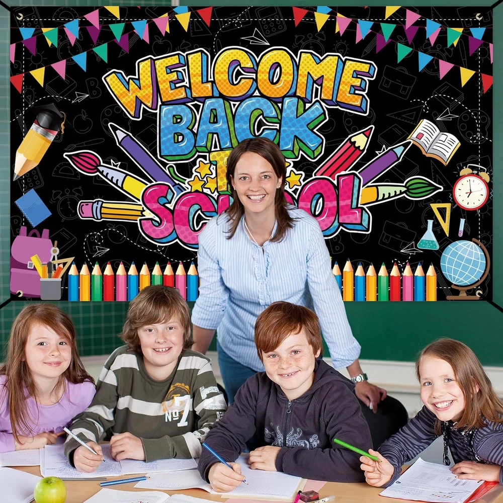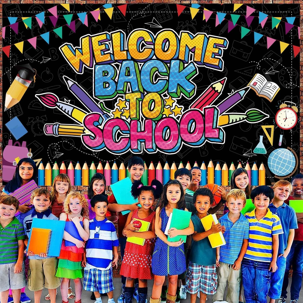 【Back To School Decorations】includes 1pcs large Welcome Back To School Backdrop with a 20ft ribbon, the backdrop is designed with many school elements and the WELCOME BACK TO SCHOOL slogan is very eye-catching with bright colors, bring highlights to your party 【Large Size】Back To School backdrop size is 72 x 43 inch (6 x 3.6ft), can be applied as party wall decoration, blackboard, outdoor, indoor, school bus, courtyard garage door decoration, photo backdrop and signature wall, great for First Day of School decorations 【High Quality】Welcome Back To School banner Made of high-quality polyester fiber so that the backdrop cloth colorful, clear patterns, odorless, firm and not easy to be torn, waterproof, both indoors and outdoors used 【Easy to install】The four corners of the First Day of School banner have holes made using brass,we are equipped with a 20ft ribbon, you can use ribbon to hang a backdrop or use tape to stick it directly where you want it 【Perfect service】Contact us if you have any problems about the Back To School Party Decorations, we will try our best to solve the problem, eliminate all your worries about getting this Welcome Back To School Backdrop Back To School Decorations: includes 1pcs large Welcome Back To School Backdrop with a 20ft ribbon, the backdrop is designed with many school elements and the WELCOME BACK TO SCHOOL slogan is very eye-catching with bright colors, bring highlights to your party.