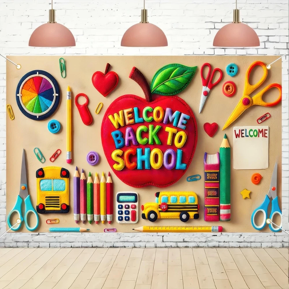 Charming School - Themed Design:Welcome back to school banner features a delightful back - to - school theme. A large red apple takes center stage, emblazoned with the colorful text "WELCOME BACK TO SCHOOL". Surrounding it are various felt - like school supplies, including pencils, scissors, school buses, books, and calculators, creating a nostalgic and inviting atmosphere for the new school year. Ideal Size for Display:Back to school backdrop banner measuring 71 x 43 inches, this polyester banner is perfectly sized to make an impact. Whether hung in a classroom, school hallway, or the entrance of a school building, it stands out. Its generous dimensions ensure it captures the attention of students and teachers alike, setting a positive tone for the academic year. Quality Polyester Material: Backdrop banner is made from 150D polyester, this banner offers a soft texture and good durability. Lightweight and easy to handle, it can be hung up with minimal effort. After use, it can be folded without significant damage for storage until the next school year. Easy Installation and Storage:Designed for convenience, the banner comes with straightforward hanging options.You can use basic hanging tools such as hooks or ropes (including) to hang it up. Versatile School Decoration:While perfect for welcoming students back to school, this banner can also be used for school - related events such as open houses, parent - teacher meetings, or as a decorative element in a school library or art room.