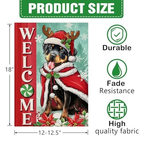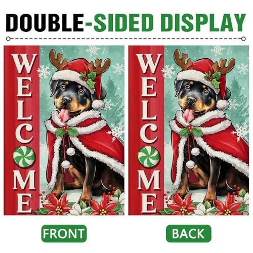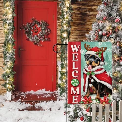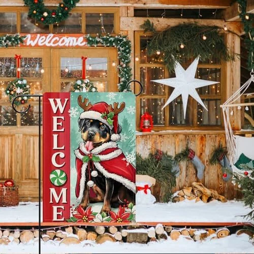 30 Days Return Policy Fast Delivery Trusted seller Welcome Christmas Rottweiler Dog Decorative Garden Flag, Xmas Pet Yard Outside Home Decorations Dog Lover Gifts, Peppermint Candy Holiday Burlap Outdoor Small Decor Double Sided 12 x 18 Product Description Durable Flag -- Material: 100% burlap. Weatherproof and non-fray durability, home garden's durable indoor, outdoor art flags and banners are made of machine washable polyester burlap material, fade resistant to keep them flying for many seasons Garden Flag Size -- This vertical garden flag is the small, mini Garden size (12-12.5 x 18"). Flag pole not included Produced in Higher Quality -- The Christmas garden flags with puppy, peppermint candy, poinsettia, snowflake patterns are printed in premium colorfast permanent dye to create colorful, vibrant, bright designs from creative, original artwork Home Farmhouse Décor -- Since 1999, has been producing premium quality flags that can be perfect gifts for your loved ones and make charming decorative statements for any deck, patio, mailbox, porch or veranda, any backyard, lawn or garden Double Sided Flag -- Design is double sided with the image printed and visible from both sides and text also reads correctly from both sides. Artistic sign flags hang beautifully from a sewn-in sleeve and it's easy to switch out our seasonal flag designs using standard line of flag poles, flag pole bracket, stands, arbors, and hangers Shipping Returns Payment Shipping Shipping is FREE to all addresses other than APO/PO boxes in the lower 48 states. All our stock ships from US-based warehouses. Shipped via USPS or UPS (depending on location and package weight) Unless stated otherwise, all orders will ship within 24-72 hours of your payment being processed. Check our feedback to see the great reviews of FAST shipping we offer. Returns As our valued customer, we will do our best to make sure the product you receive arrives to you on time and as expected. If you are not satisfied with your purchase, please contact us within 30 days of receiving your order to process a return. Payment We currently accept payment via eBay managed payments only. Once payment is cleared, we will dispatch your shipment within 1-3 business days. Please refer to the "Shipping" tab for more information regarding shipping speed to your destination.