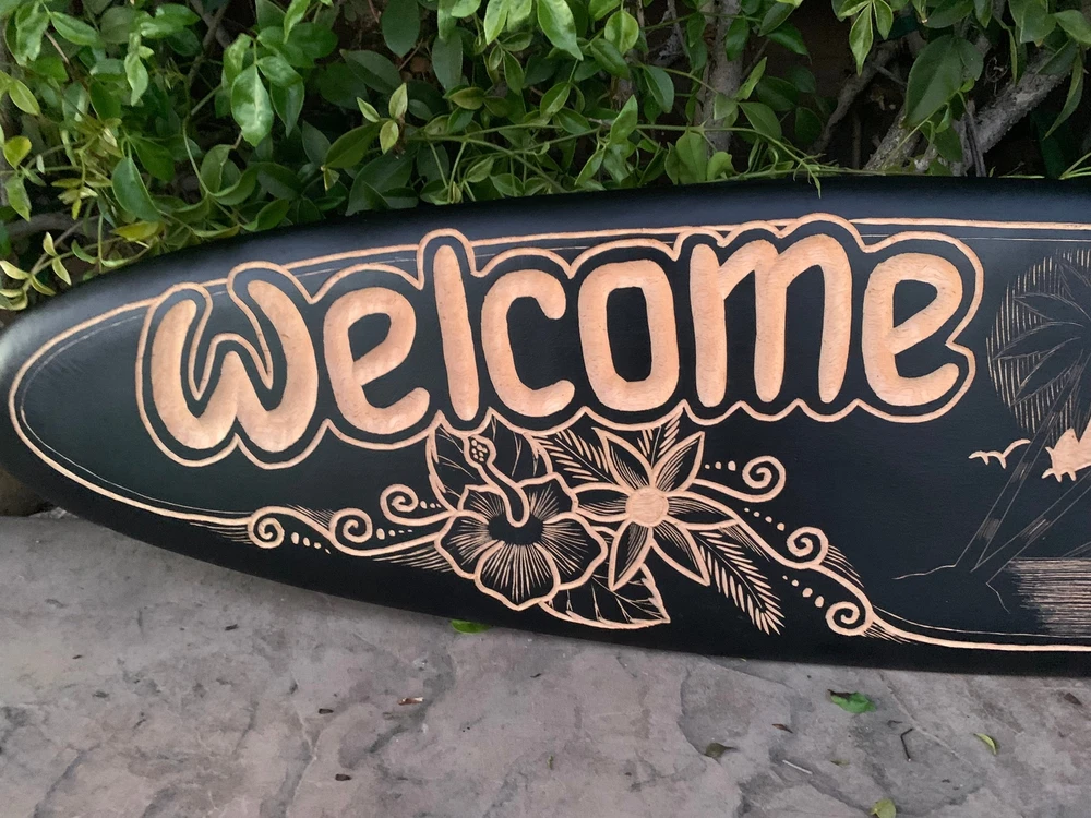 This beautiful hand crafted "Welcome" sign surfboard wall plaque has it all! A surfer catching a wave with swimming dolphins off of a tropical island! Welcome friends into your home, surf shack, or Tiki Bar with the coolest welcome sign around. It would make a great addition to your home, patio, or tiki bar. It is hand carved with intricate detail from top-of-the-line mango wood. It is flat back to hang on the wall. This surfboard would make an awesome gift! 39x 10 inches.