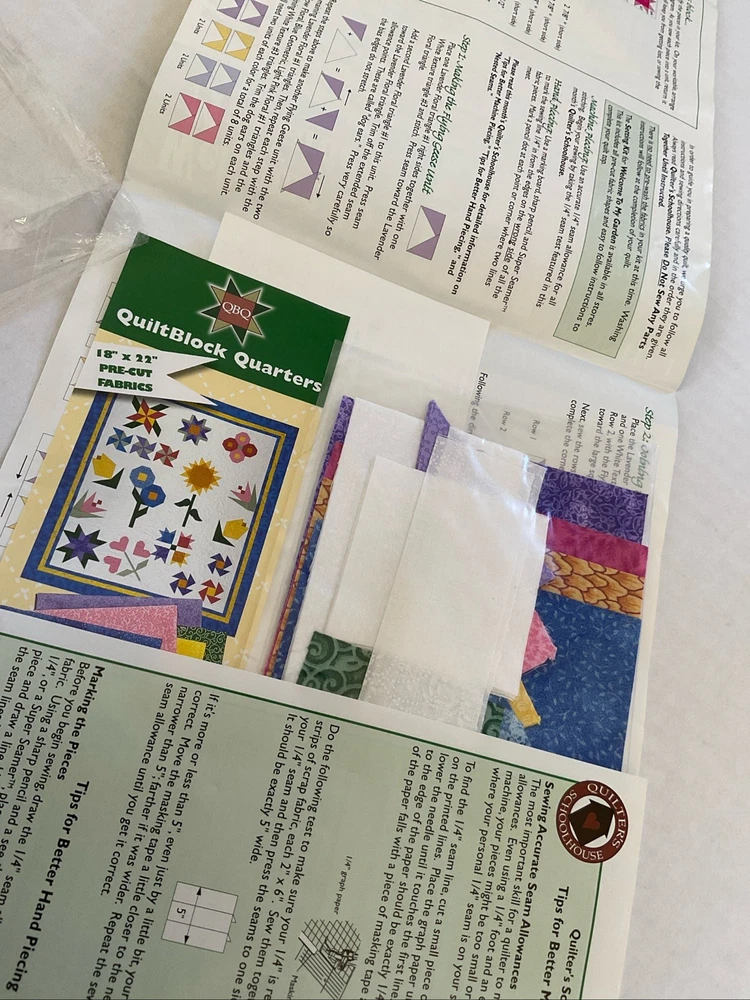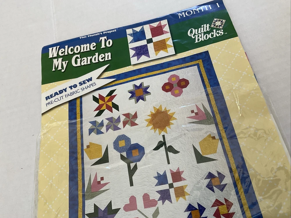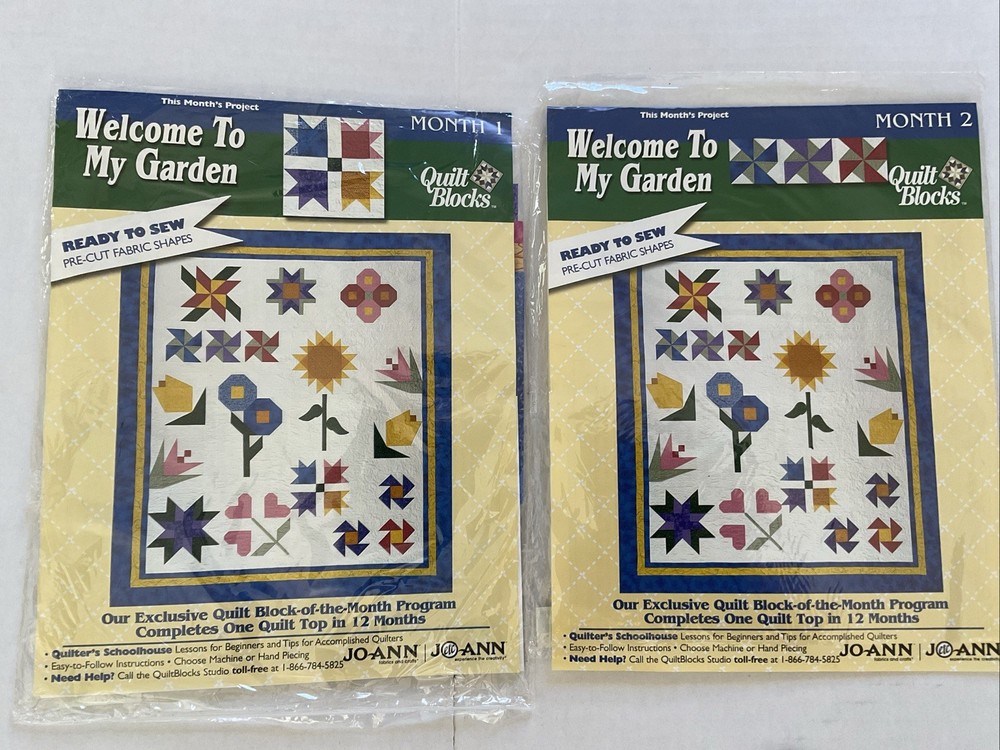 Welcome To My Garden JoAnn Quilt Block of Month 2001. Includes Month 1 which is opened package, months 2-8 (these are sealed) and months 10-12 ( these are also sealed.) There is NO month 9. The lot also contains the setting kit but this package is open. Month 1 & the Setting Kit are both open packages. The other packages are all sealed. The pieces have not been sewn in month 1. The setting kit indicates that it has the fabric to complete the quilt top. This is listed as used due to the 2 open packages.